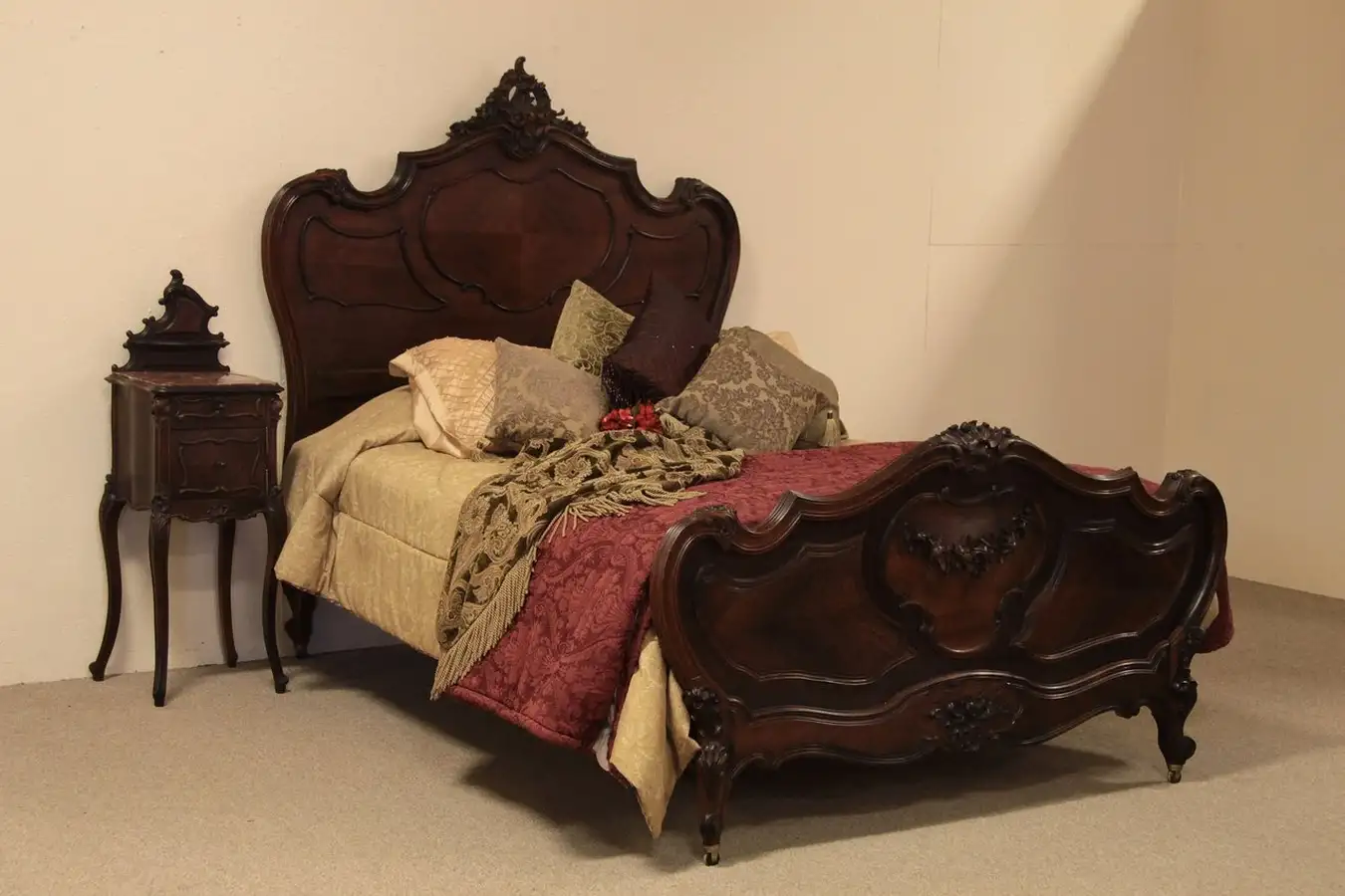 The wonderful Roccoco crests are truly amazing and show stunning artistry. Expert carving is in high relief, panels are diagonally matched. Rosewood has a sublime delicate grain and color, is extremely hard, and has a silken original finish. There is a shrinkage separation in the headboard crest, and shrinkage to the front of the footboard see photos. Photographs show modern steel rails in standard queen size.