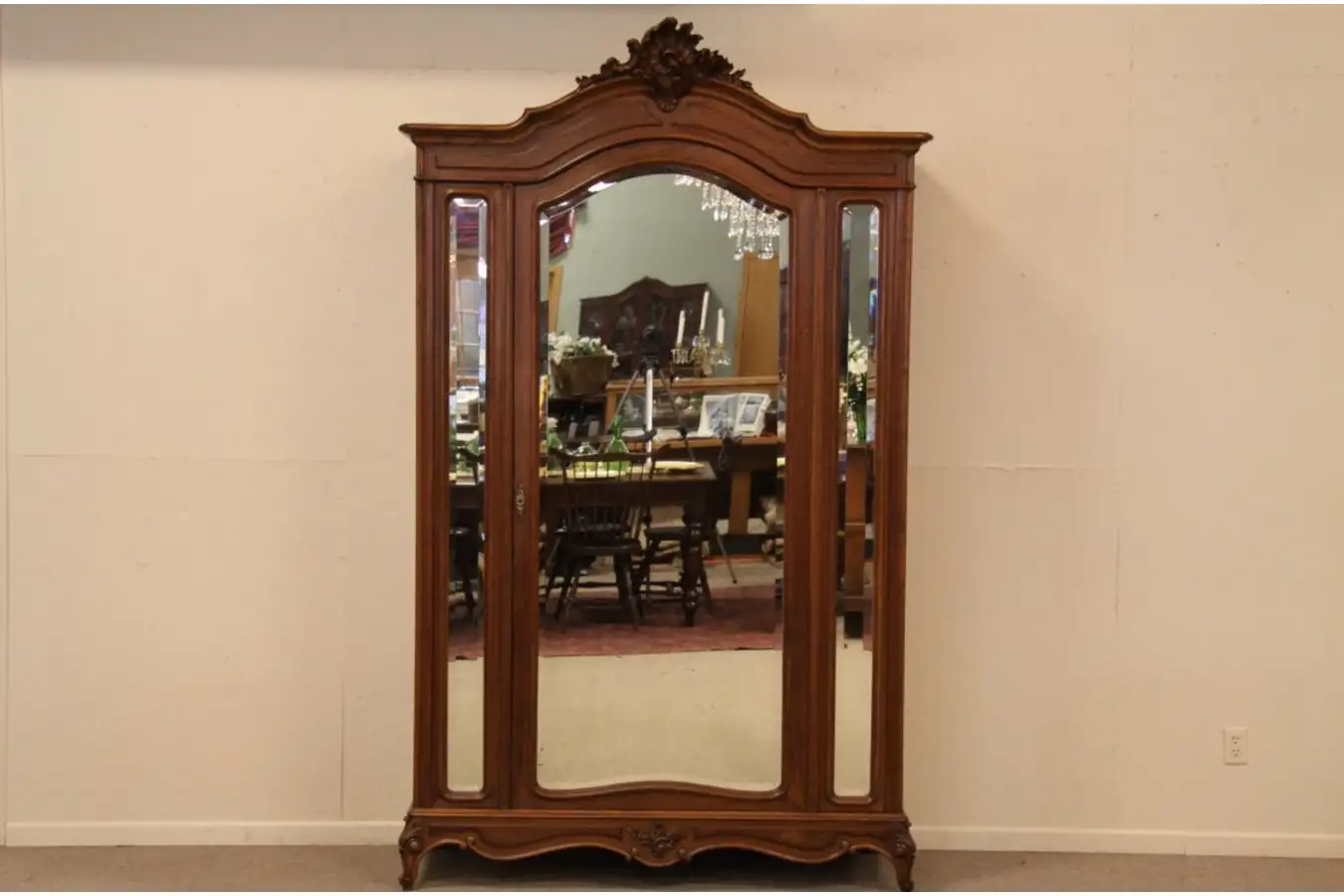 A harmonious carved armoire or wardrobe has triple beveled mirrors. Hand-carved of walnut about 1900, the original finish is remarkably well preserved. Shaped and beveled mirrors have a little "smoke" to show their age, there are small silvering losses on the lower center mirror, see photos. Embossed brasses are original, drawers have hand-dovetailed solid oak sides.
