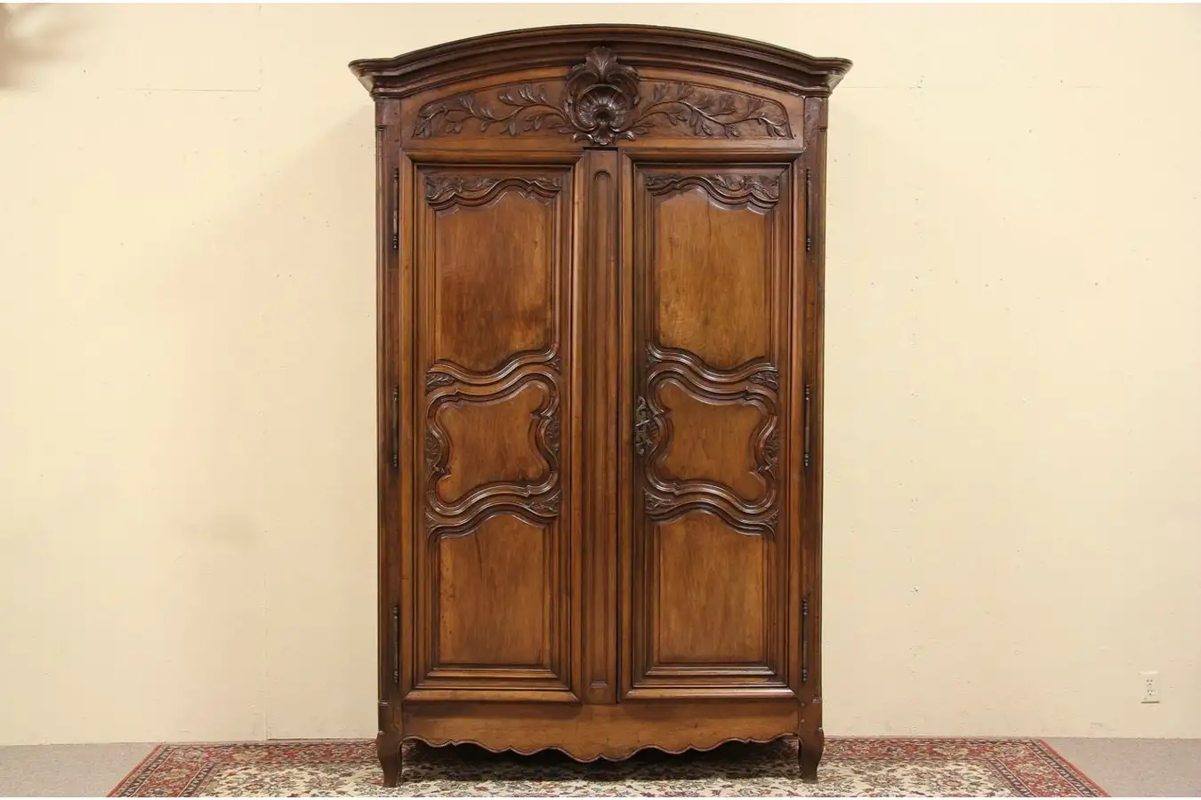 A spectacular country French or Provincial furniture, this two door armoire from about 1790 is in remarkably fine condition. The frame is wormy walnut with shaped panels of cherry, hand carved square wooden pegs secure the joints.