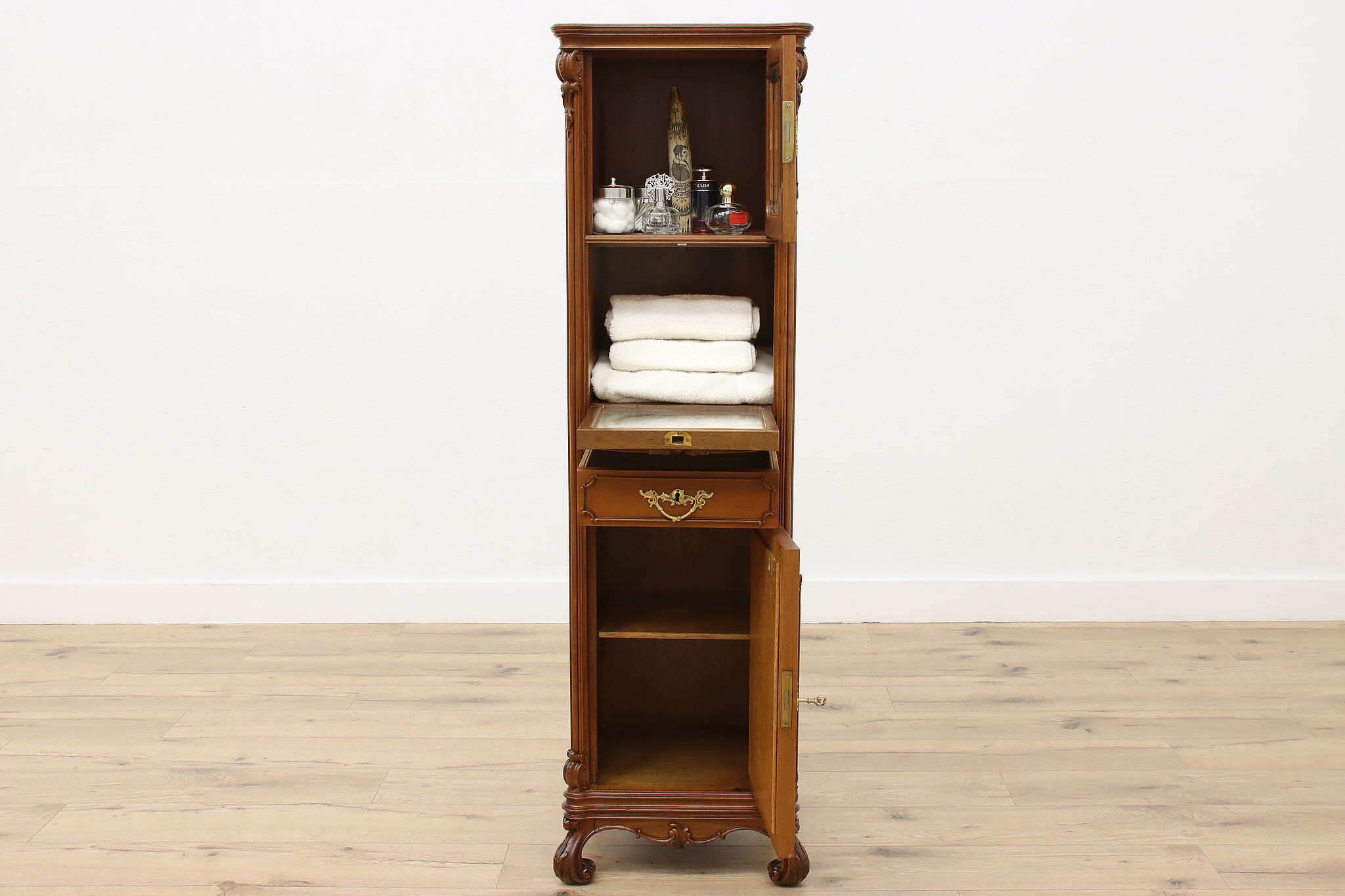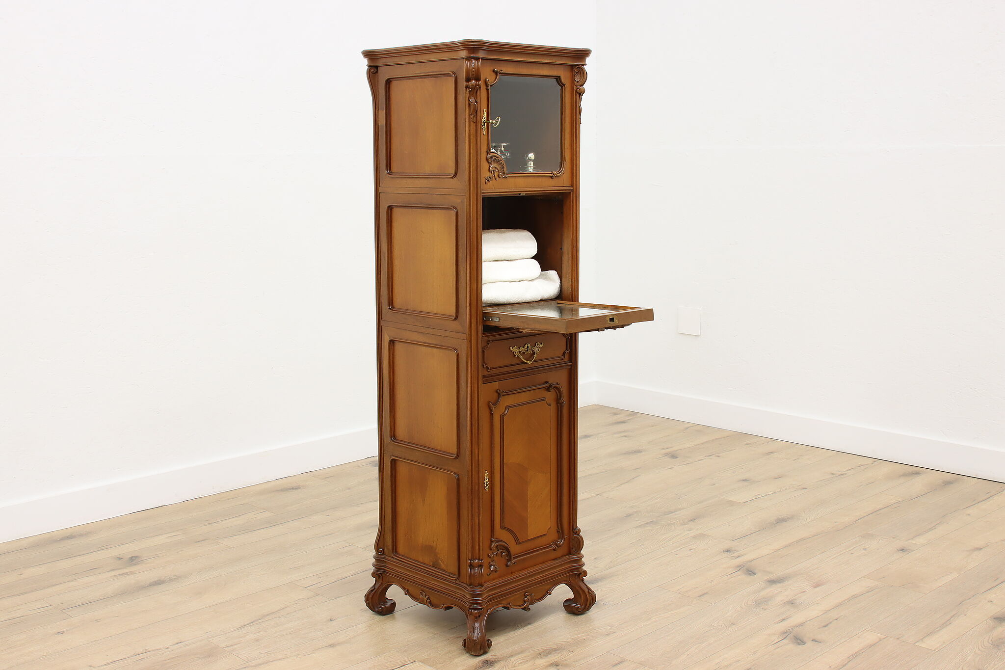 Add this stunning French Louis XV design cabinet to your home for use in a boudoir, bath or as a bar!