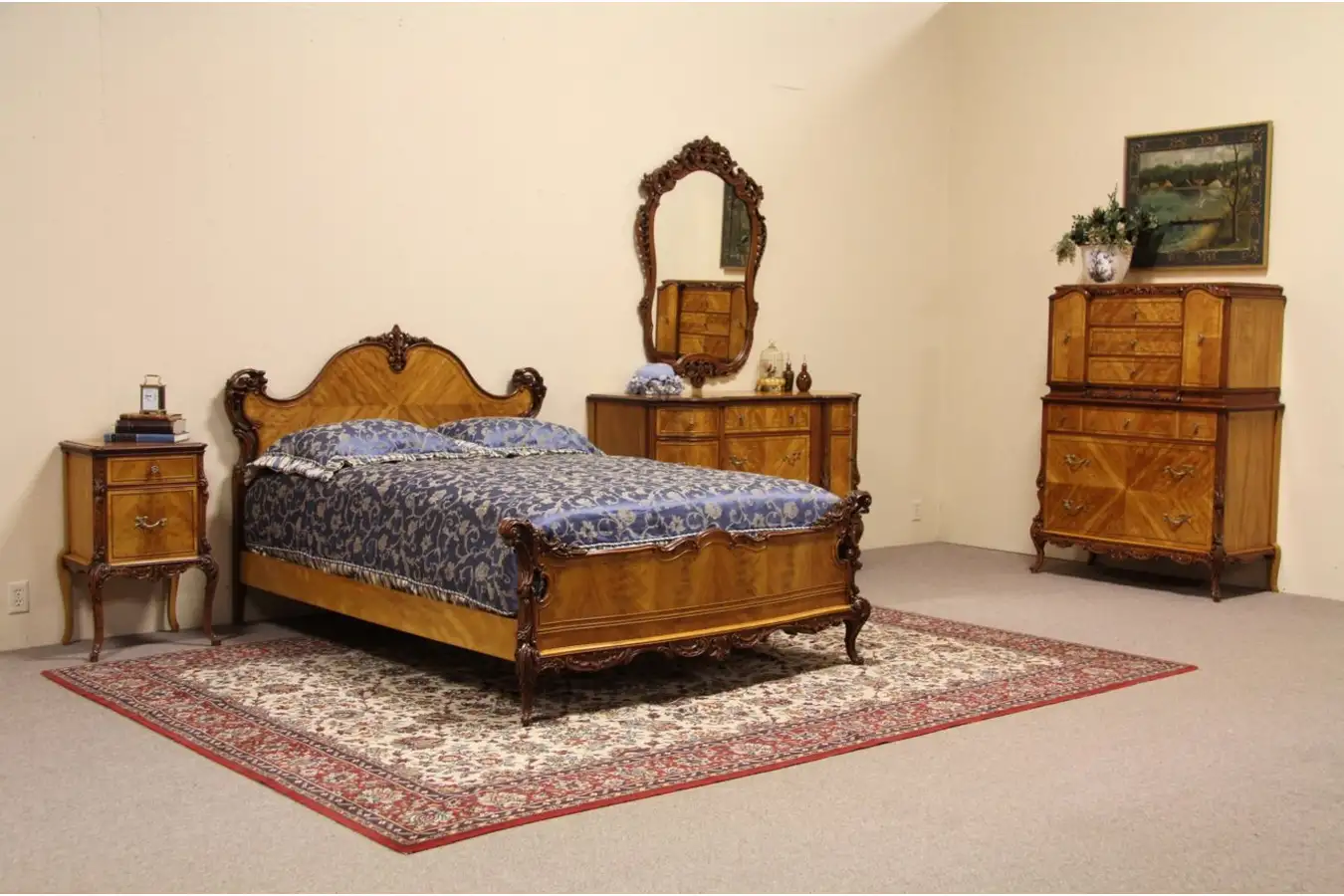 An elegant American 1935 era bedroom set is richly carved in the French manner. The set includes a standard full or double size bed, a dresser, wall mirror, tall chest and night stand.
