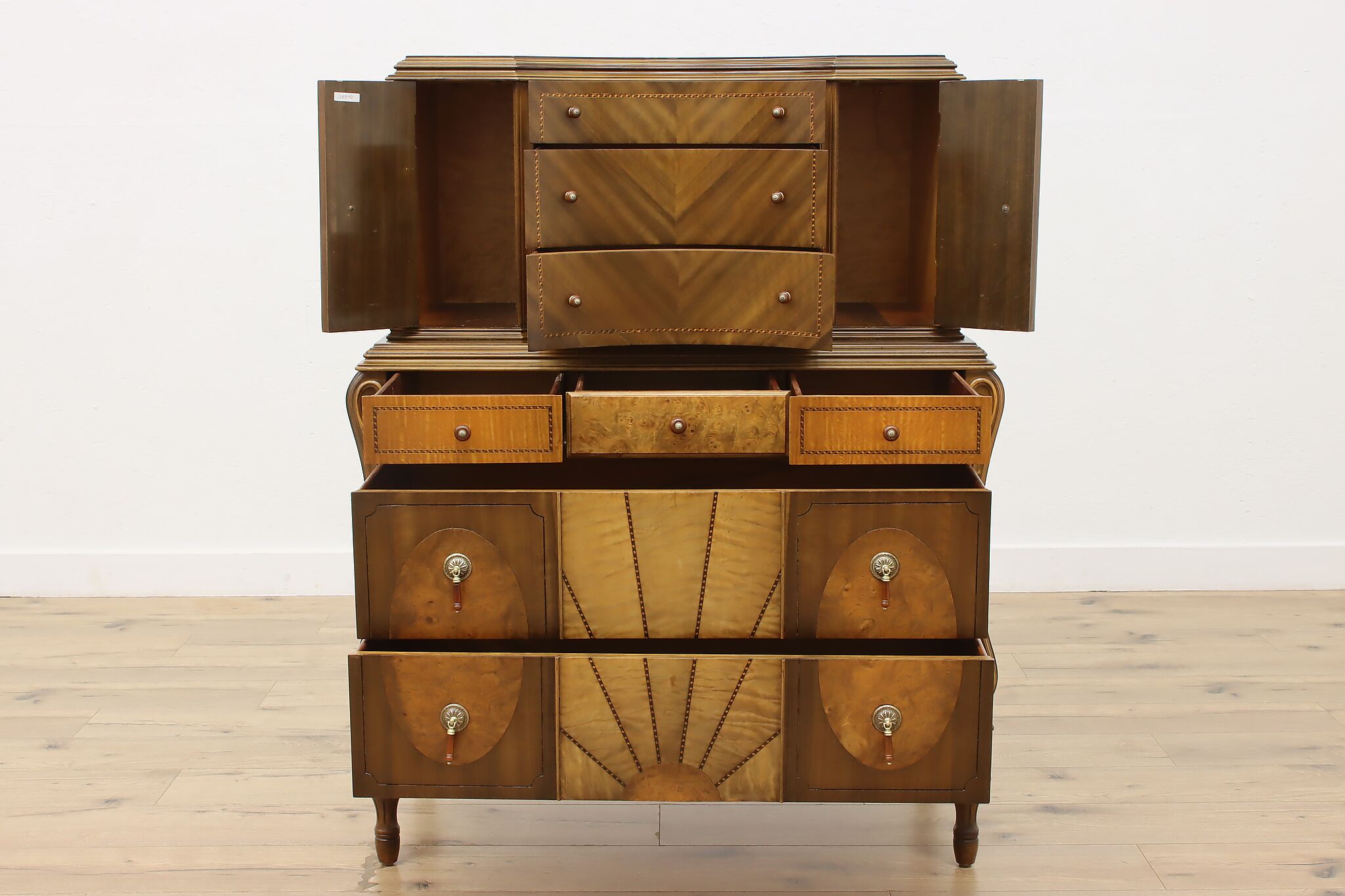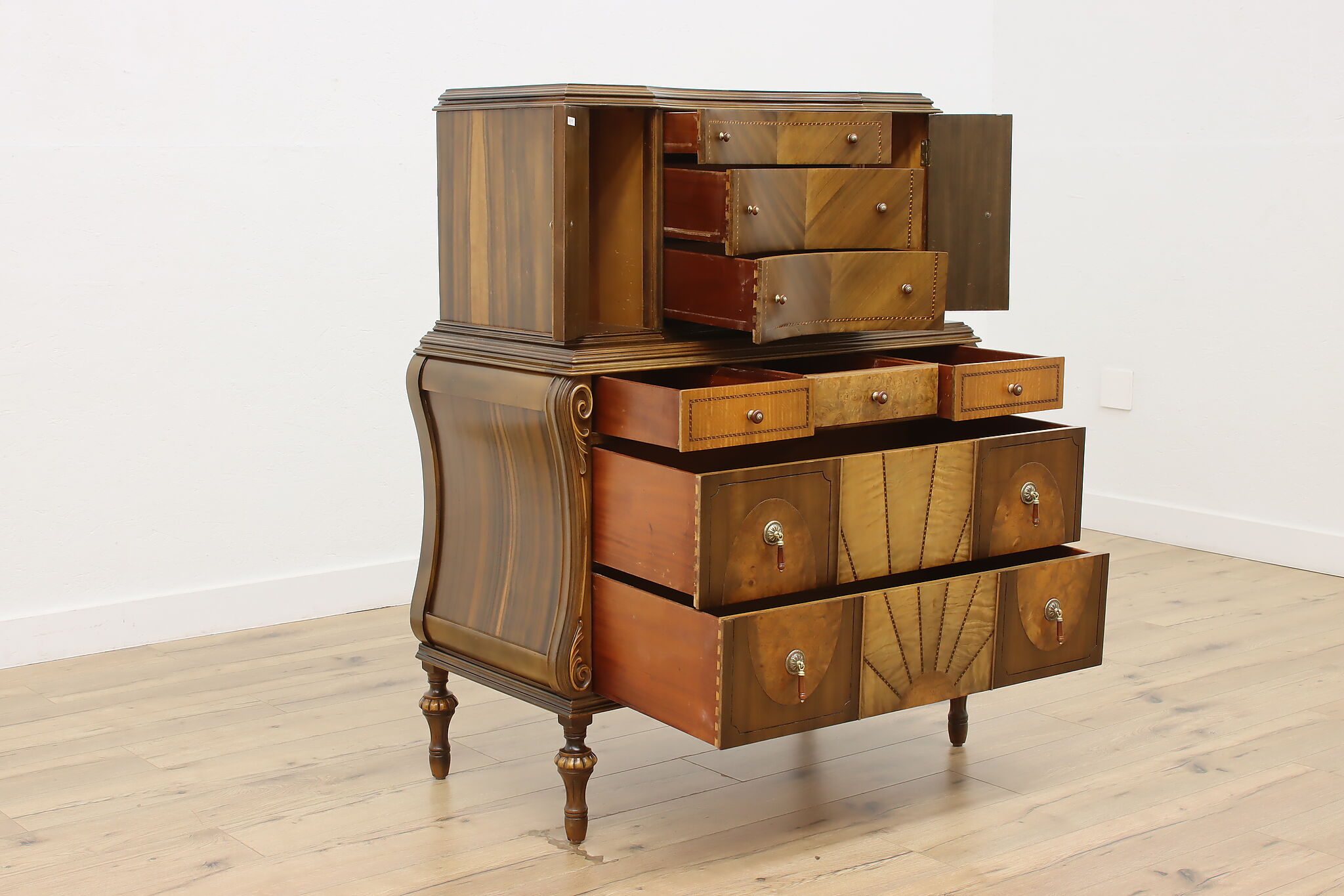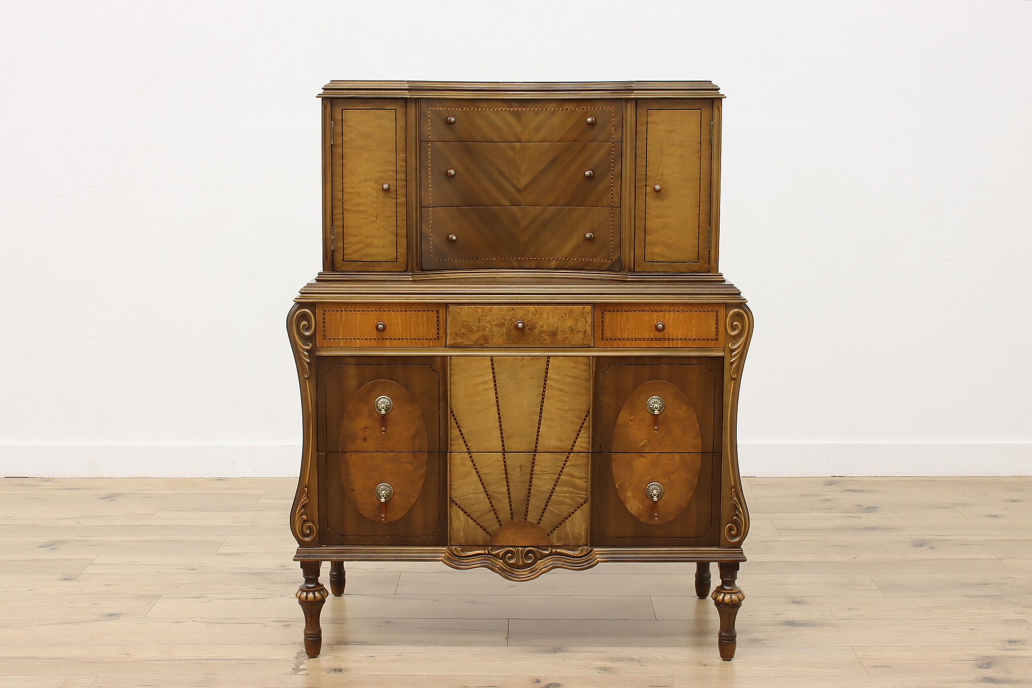 The beautiful craftsmanship of this French Art Deco design highboy or tall chest on chest will perfectly compliment your home.