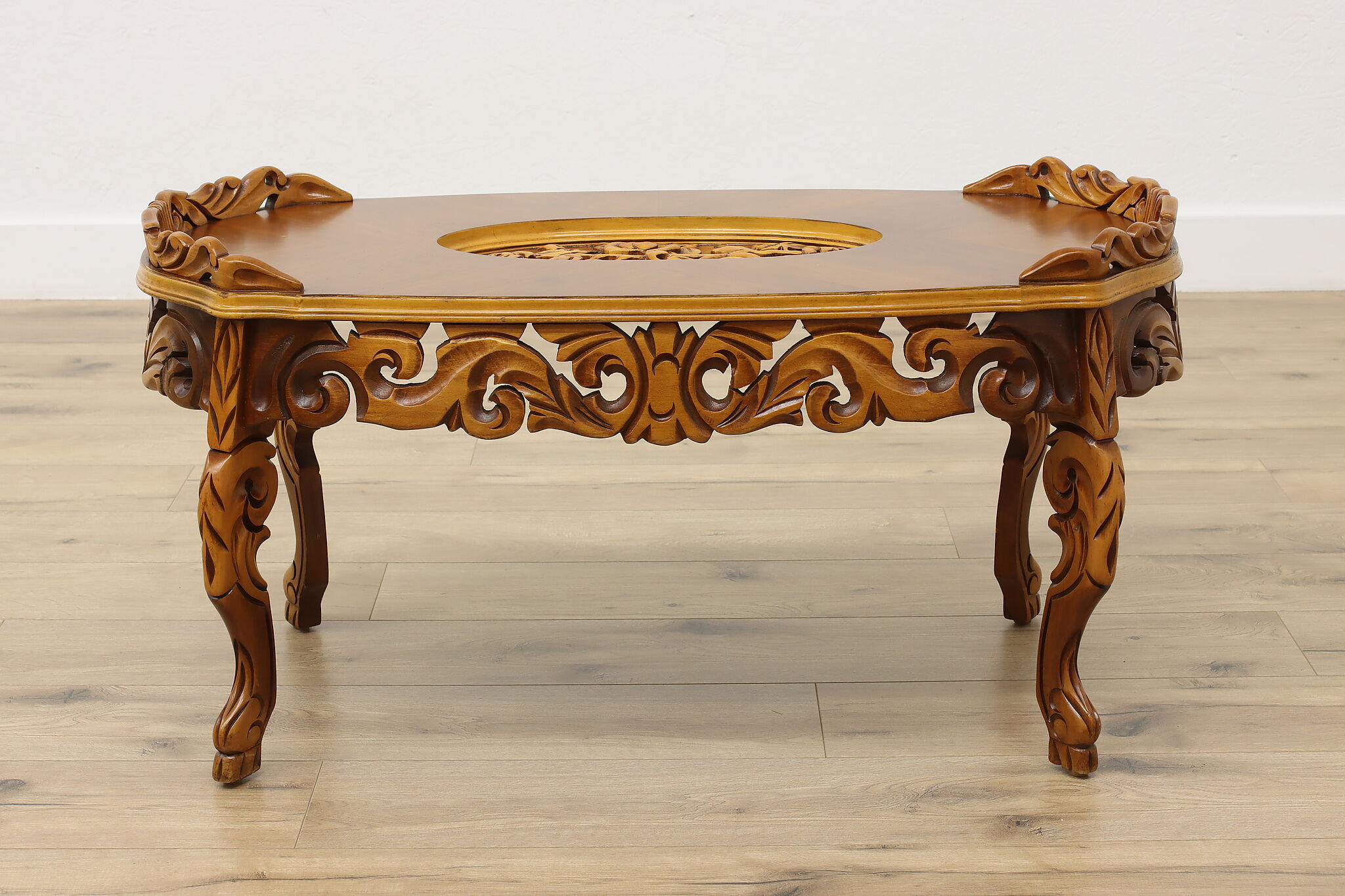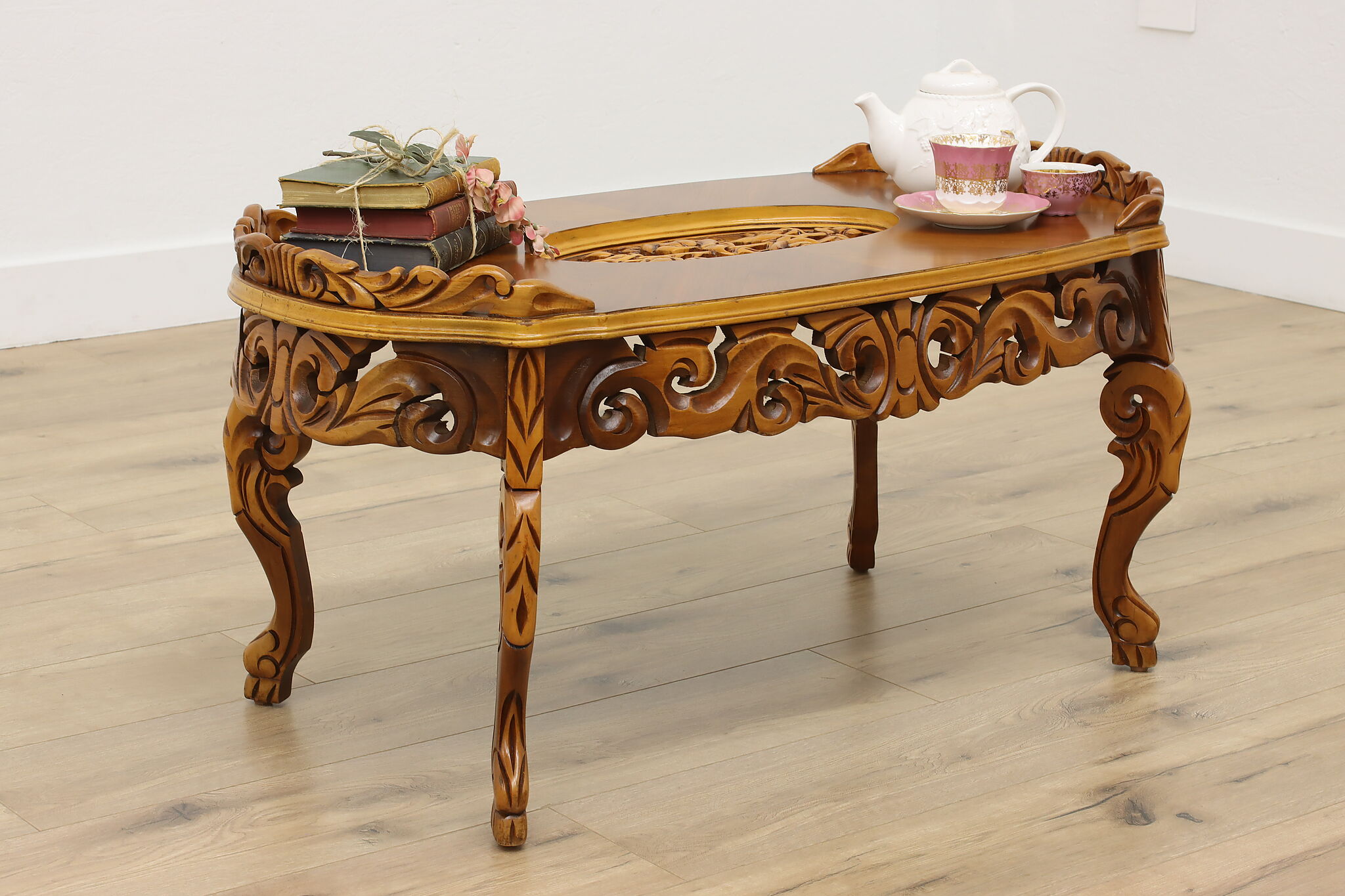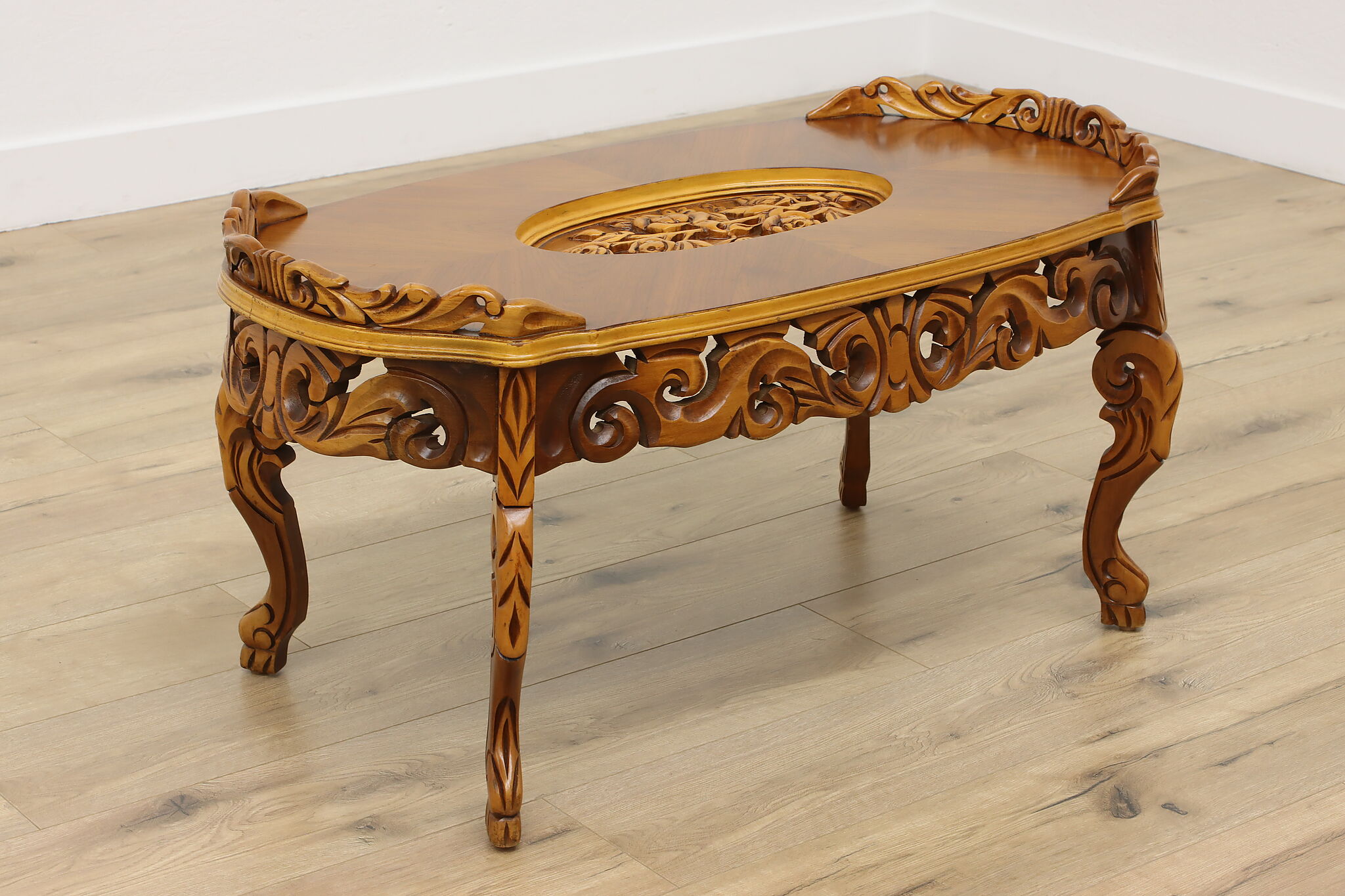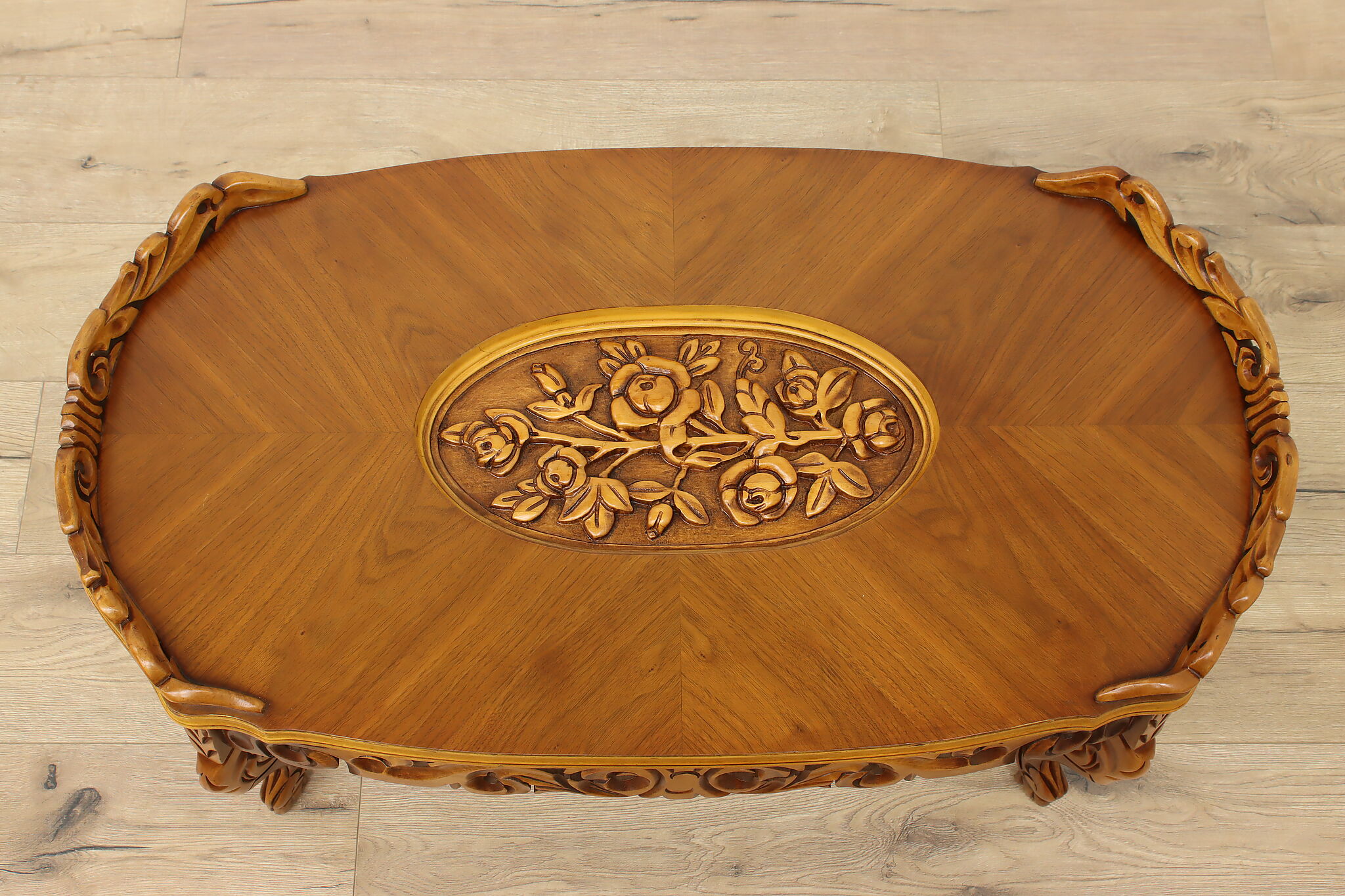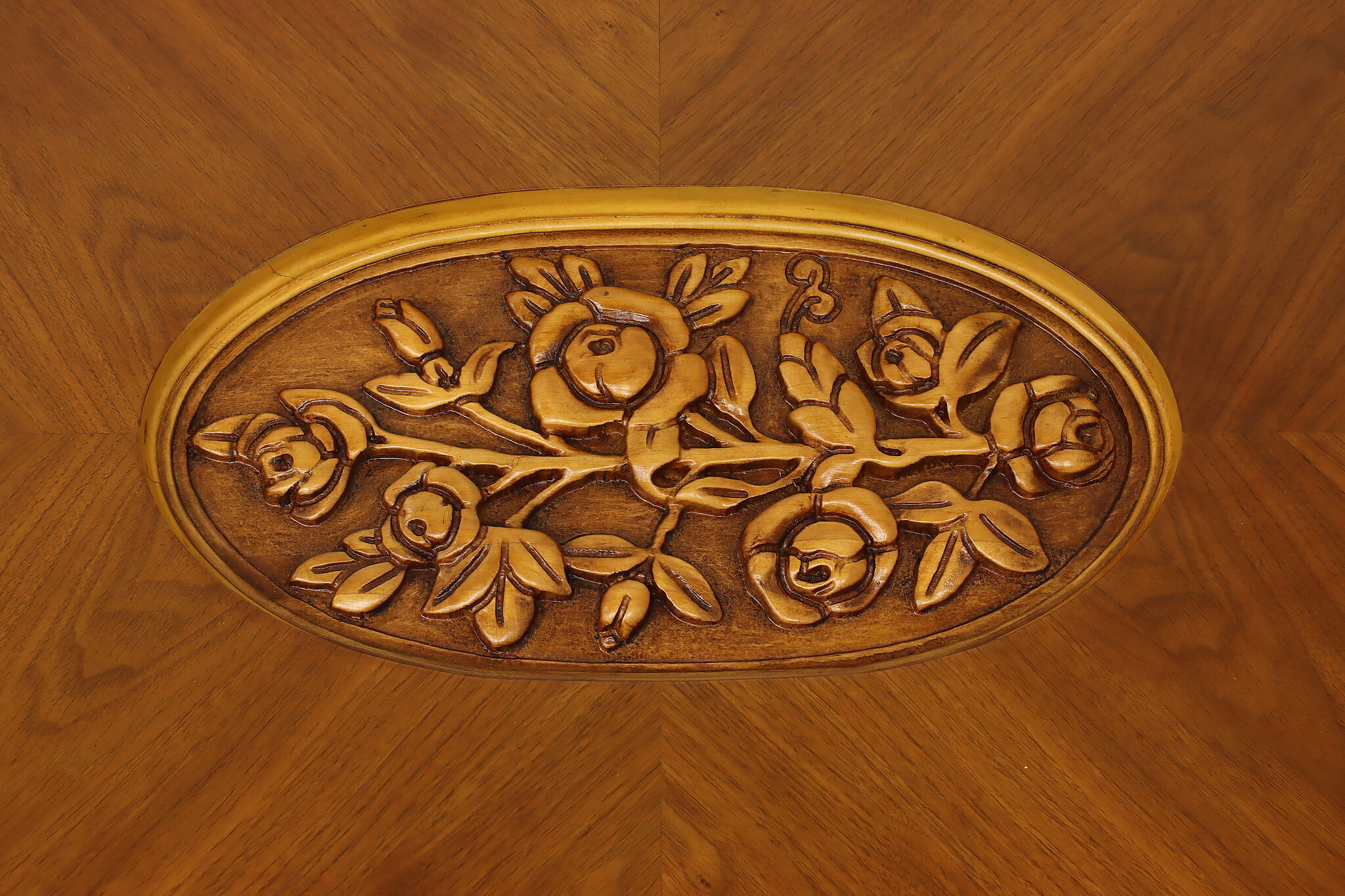 This beautiful French design oval coffee table has a beautiful top with carved floral motifs.