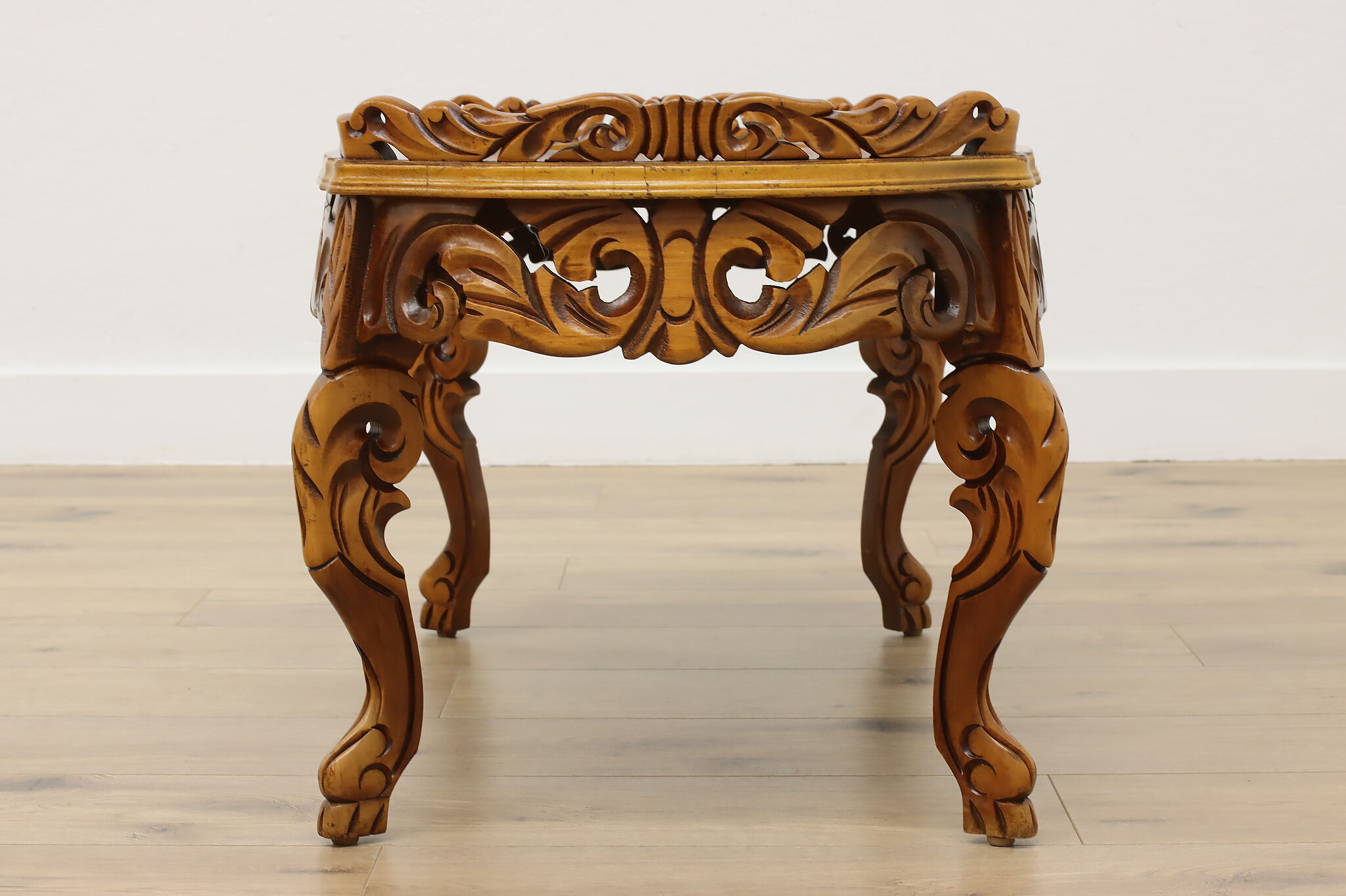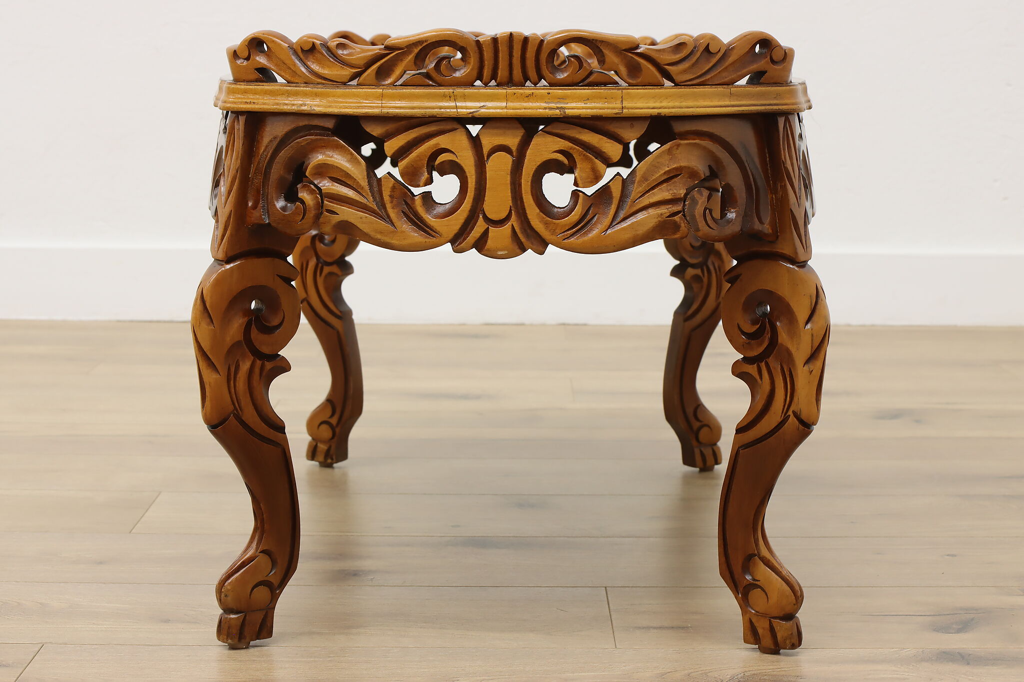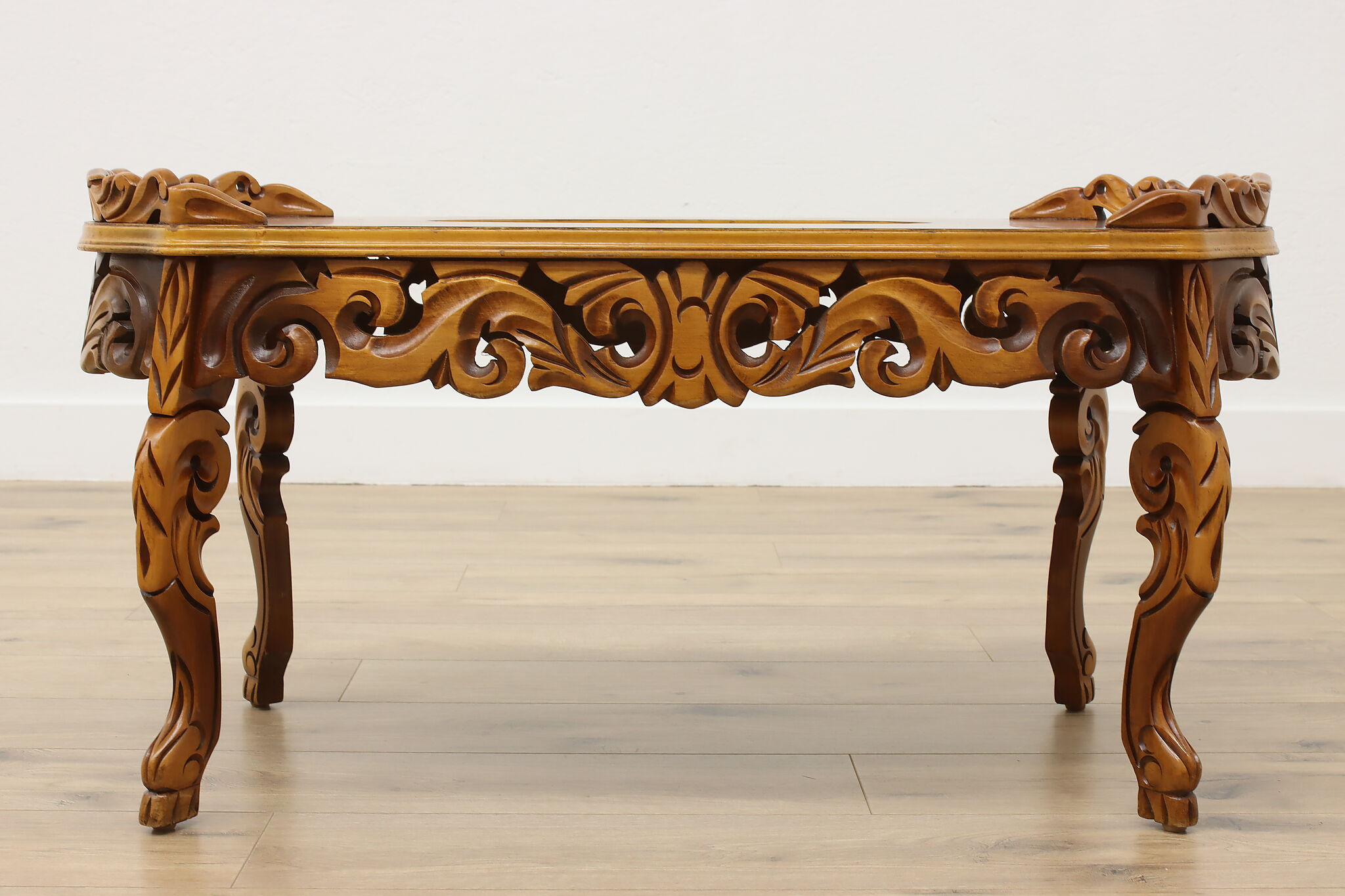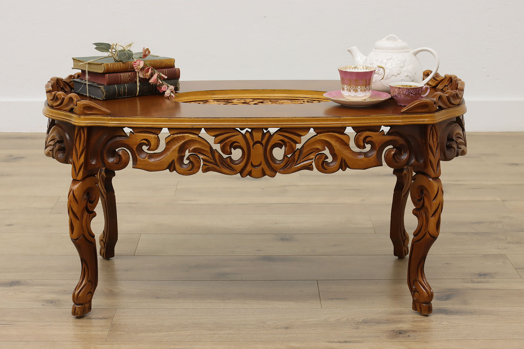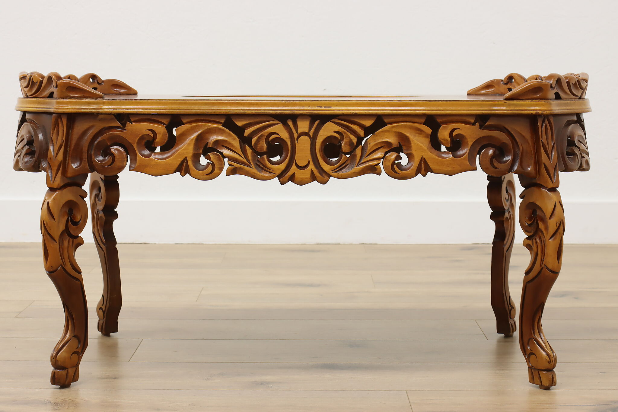 This beautiful French design oval coffee table has a beautiful top with carved floral motifs.