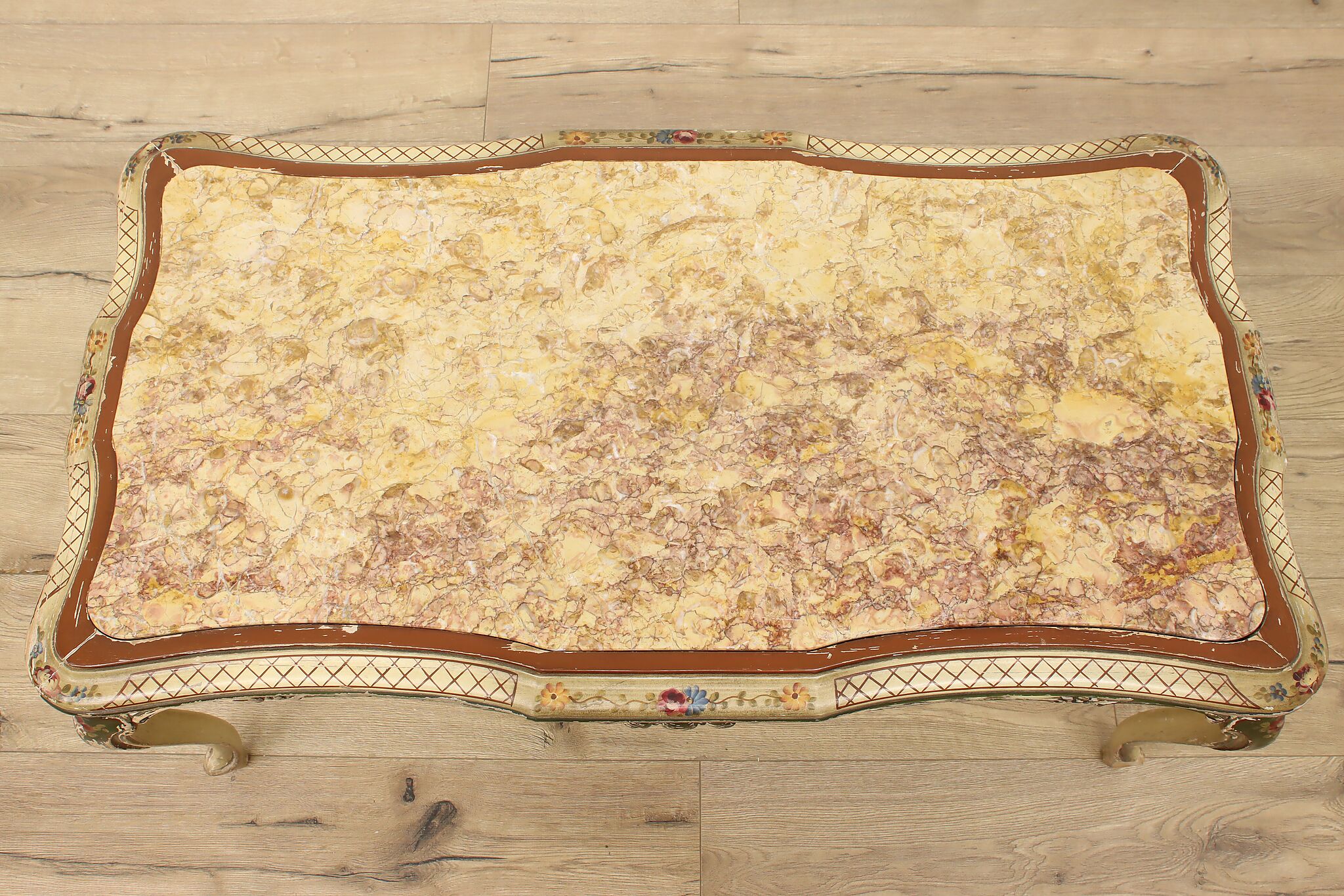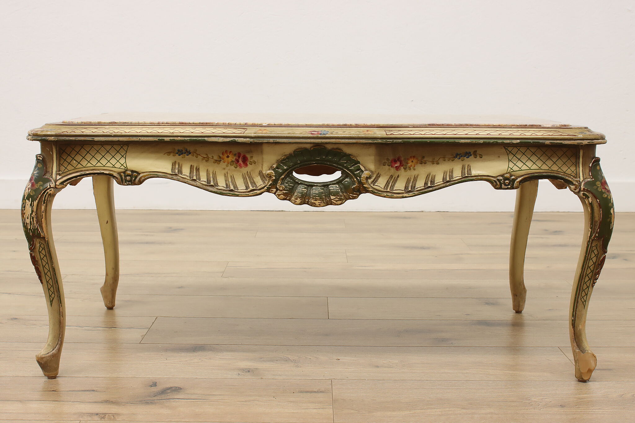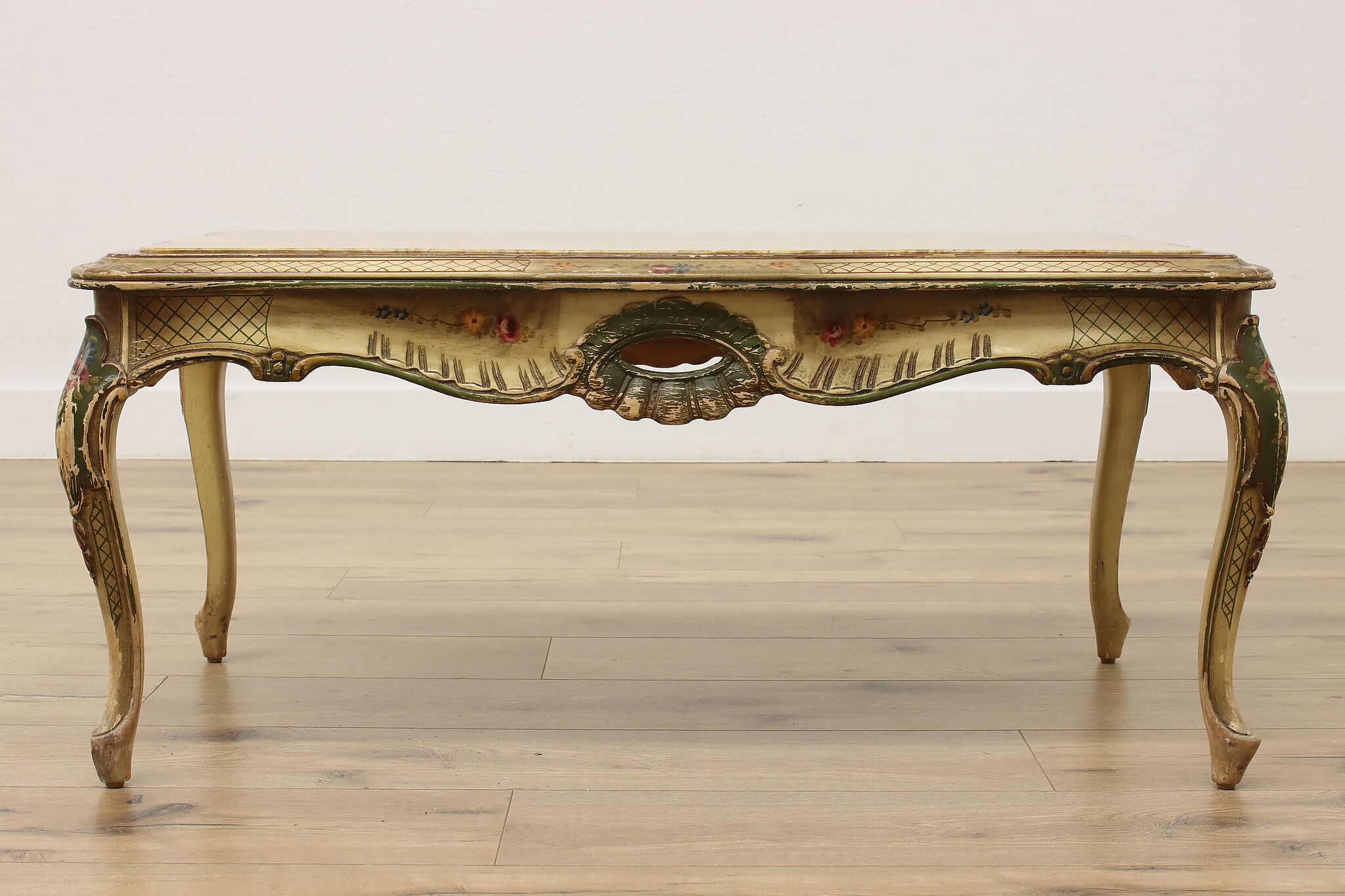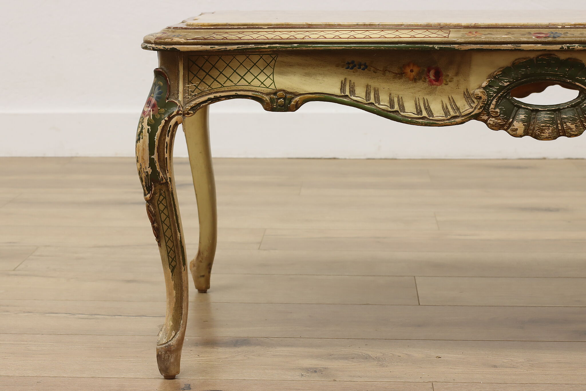 This coffee table has a charmingly well worn painted finish for a fantastic "antique" look.