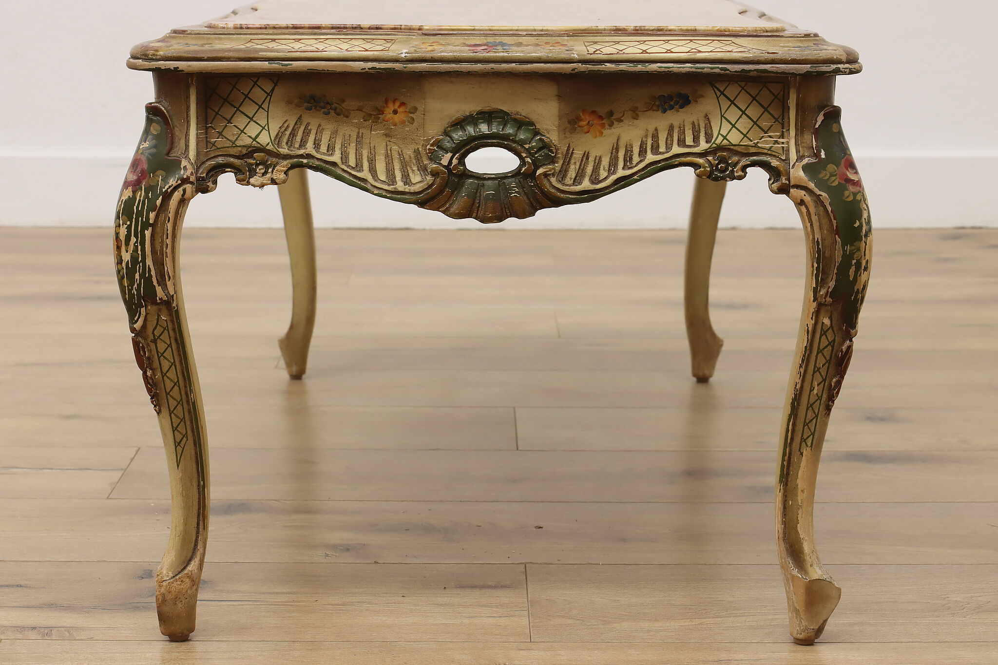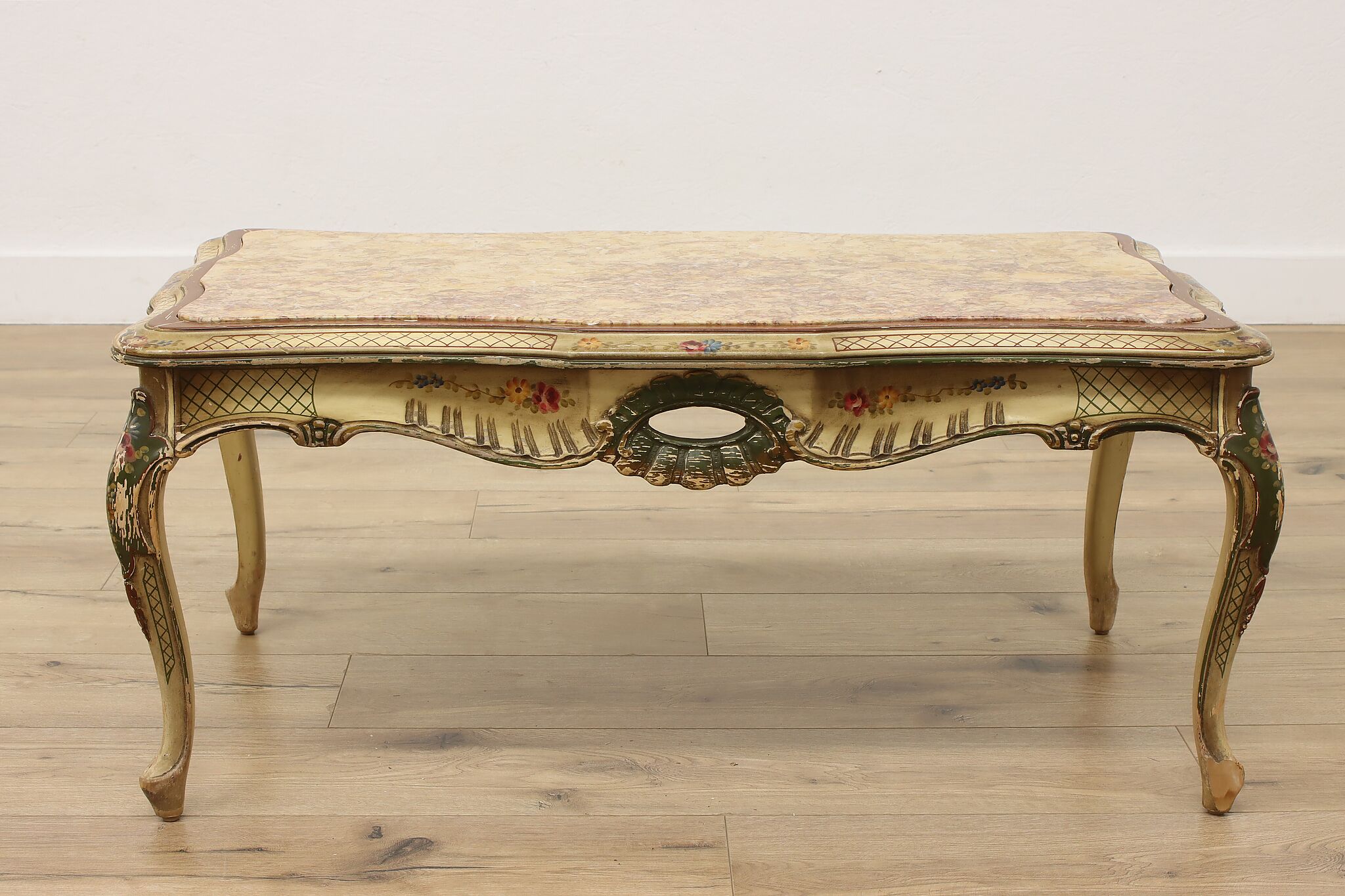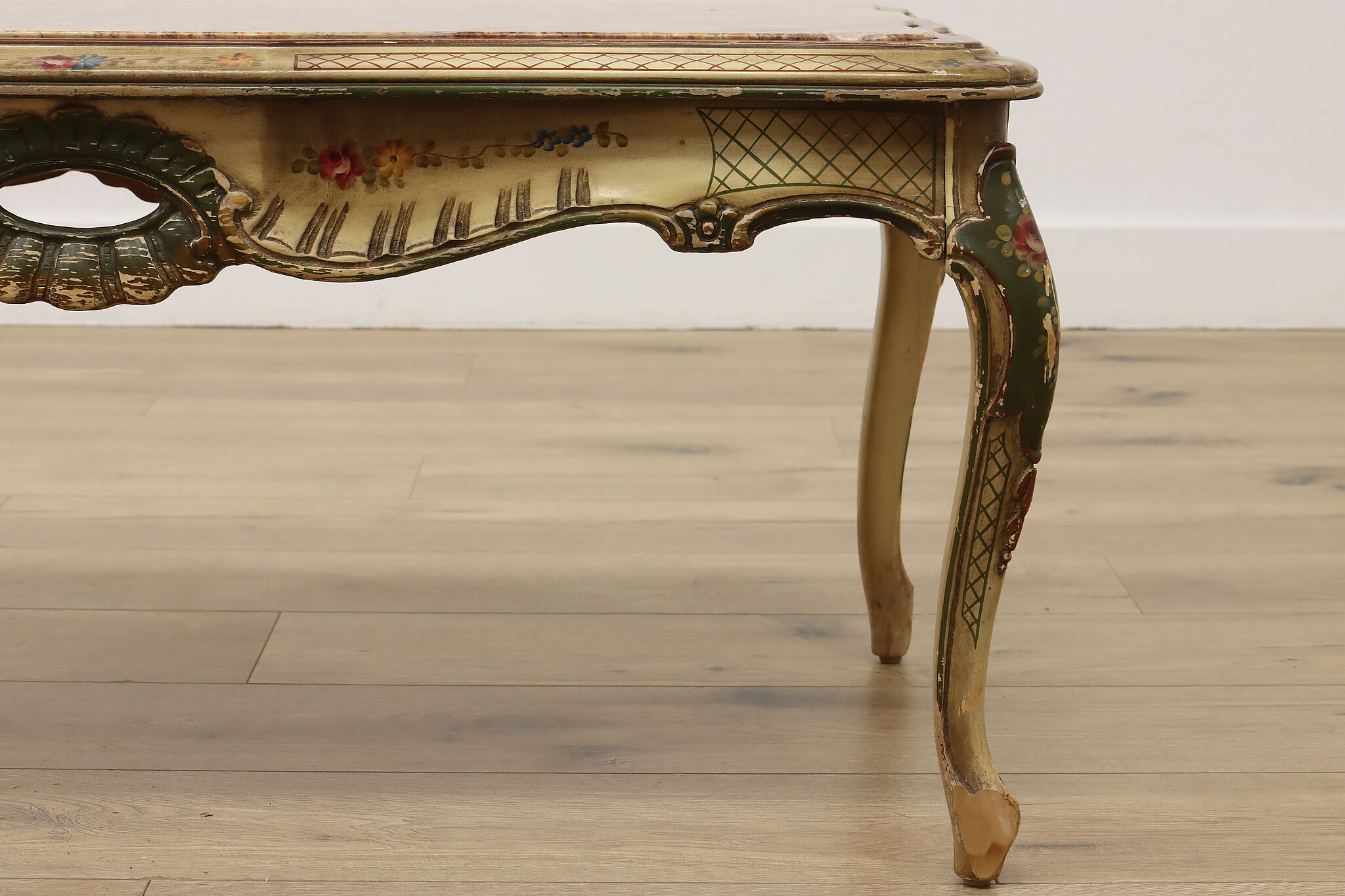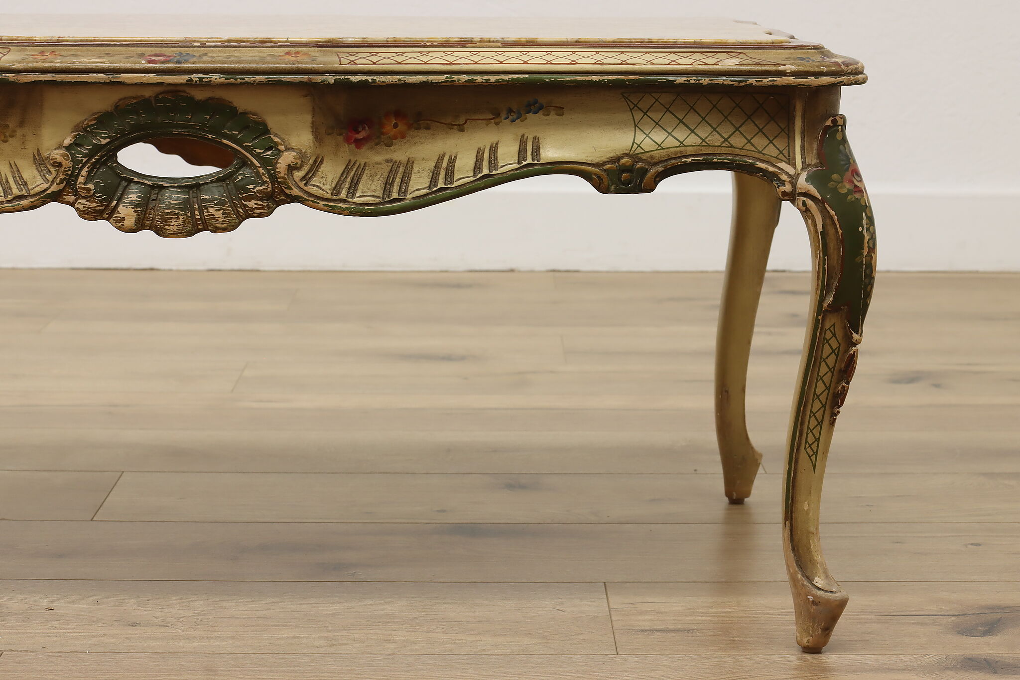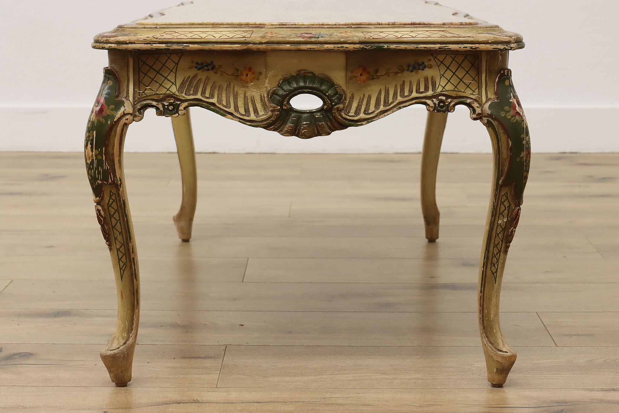 This coffee table has a charmingly well worn painted finish for a fantastic "antique" look.