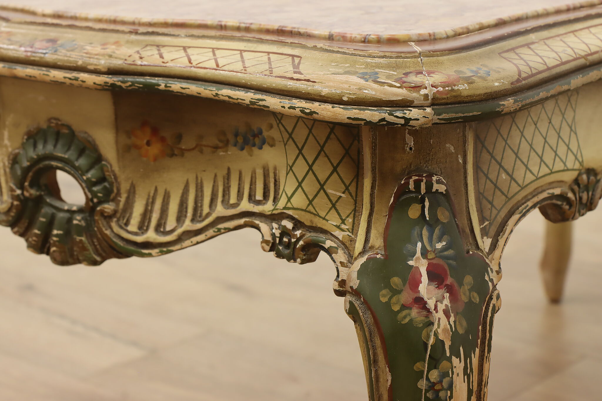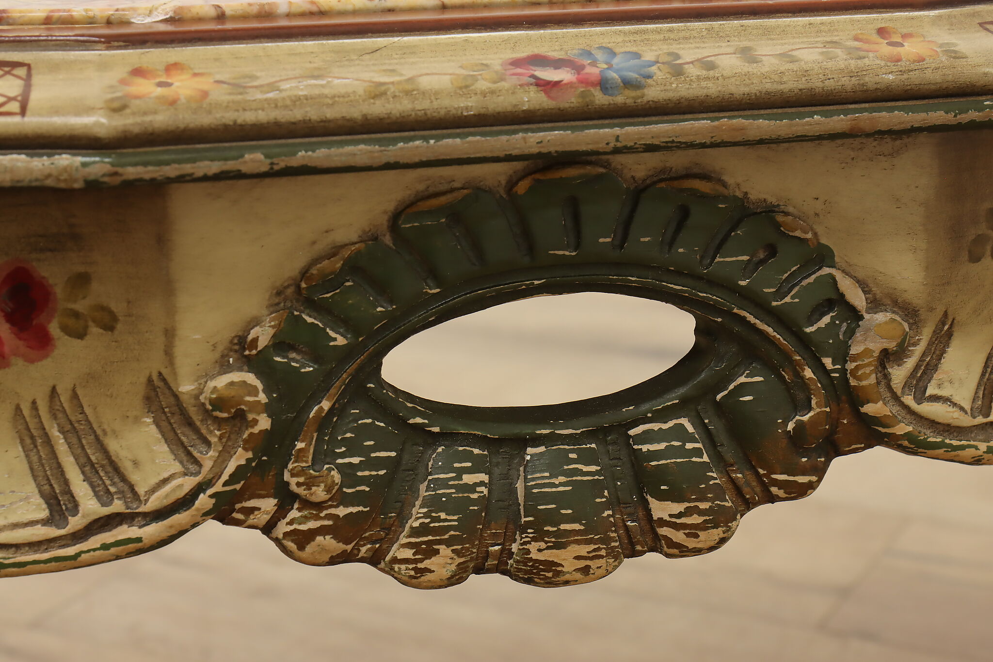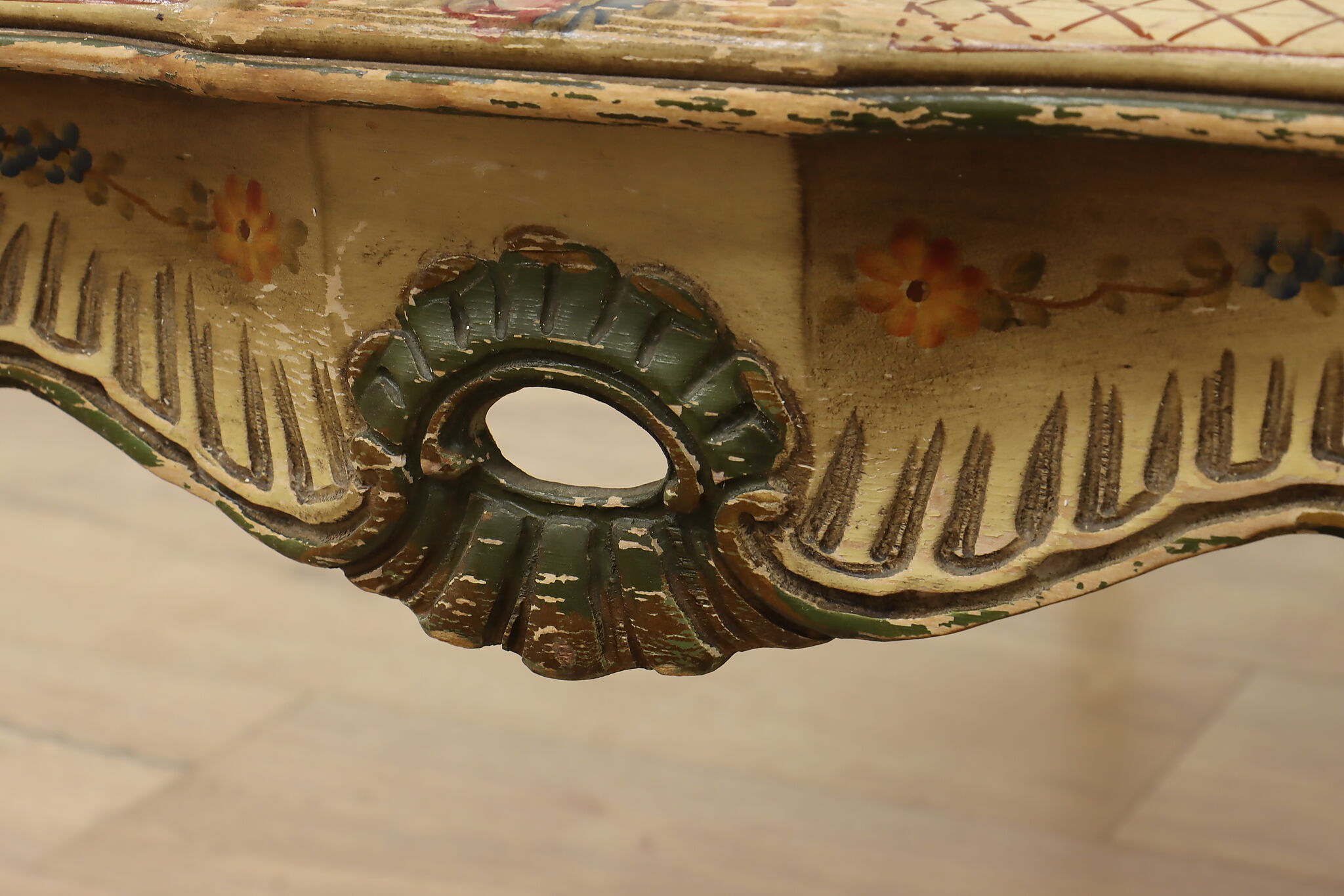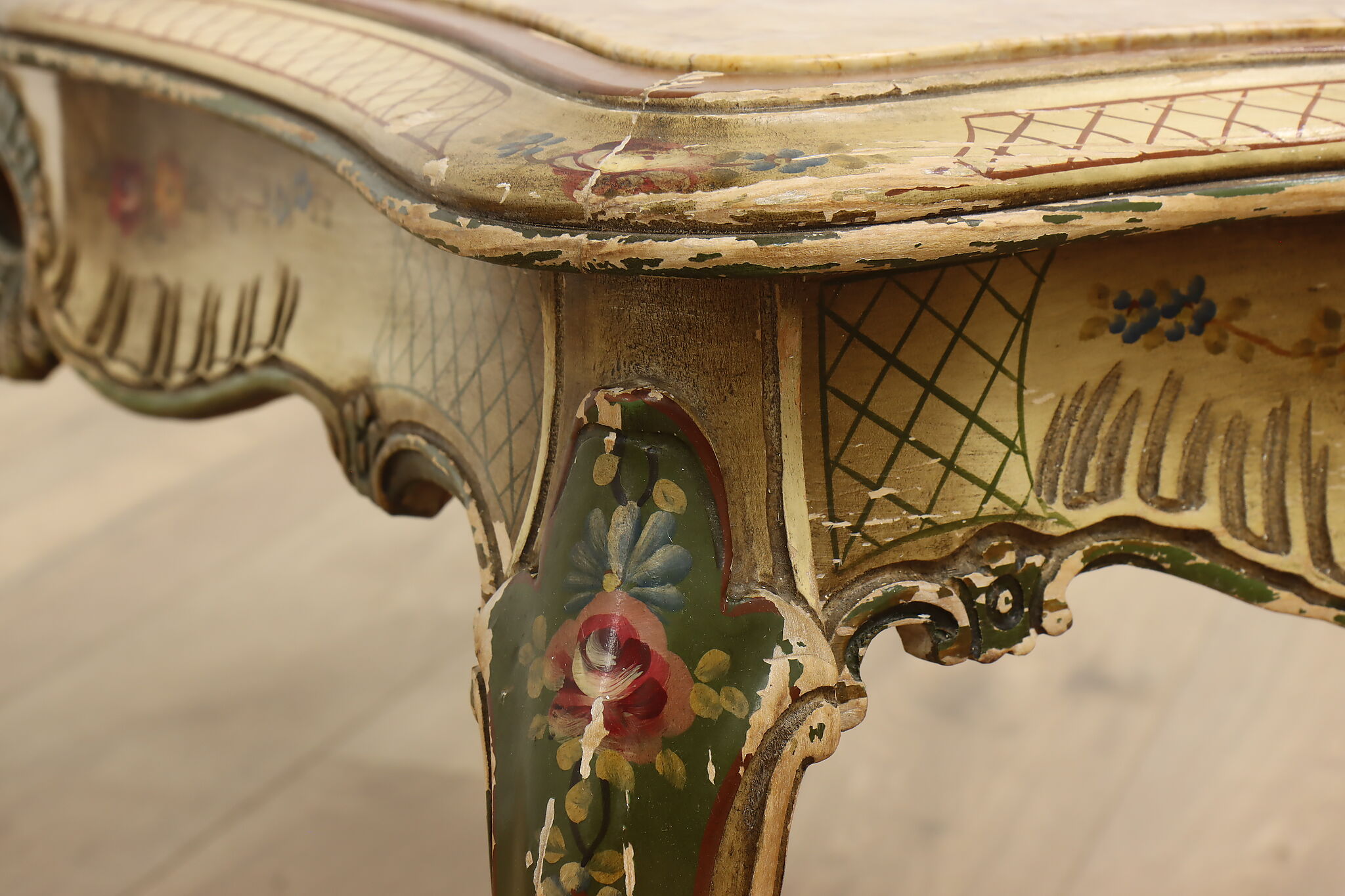 This coffee table has a charmingly well worn painted finish for a fantastic "antique" look.