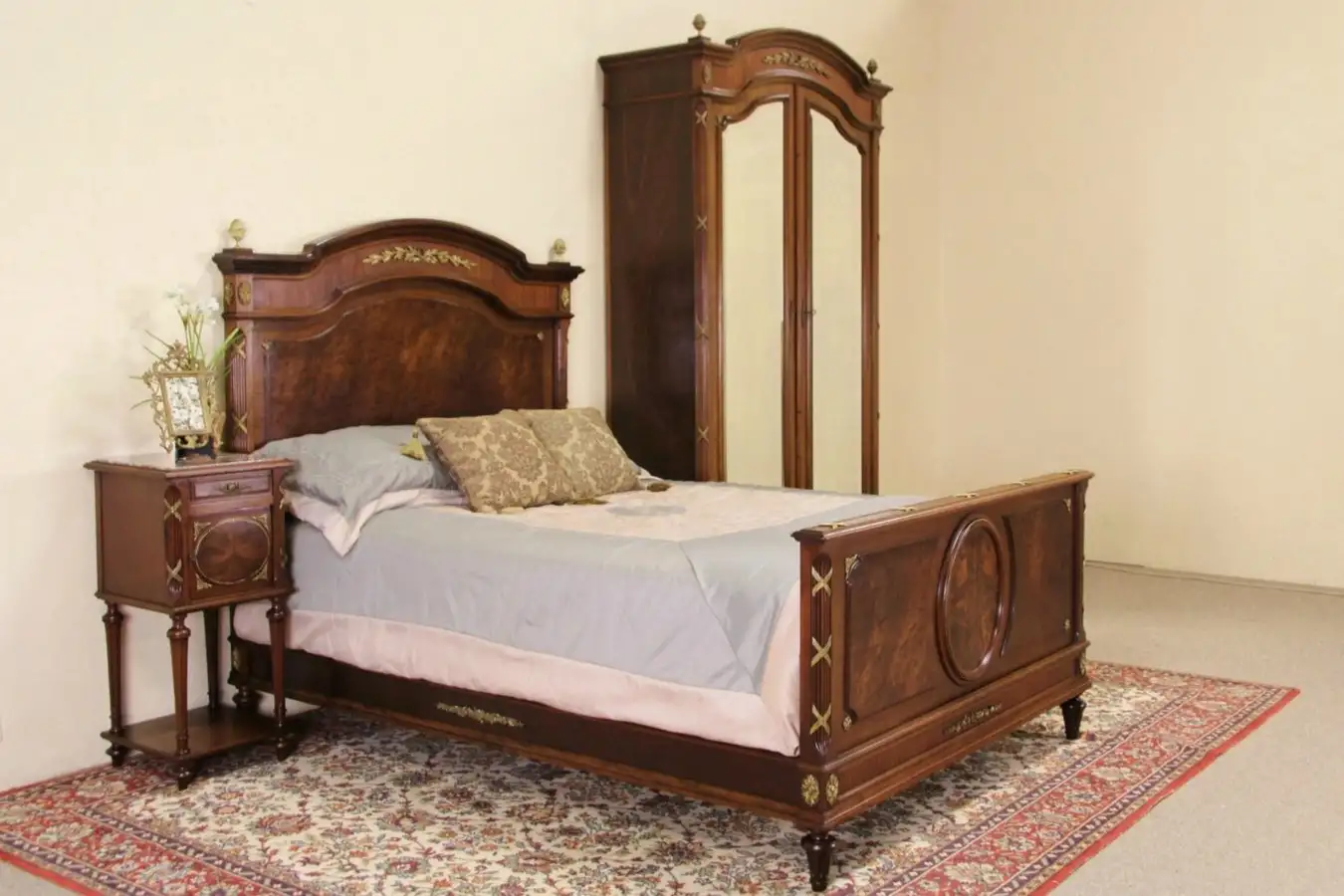 Expertly hand crafted in France about 1900, a classical three piece Empire bedroom set includes a full size bed, mirrored armoire and marble top nightstand.