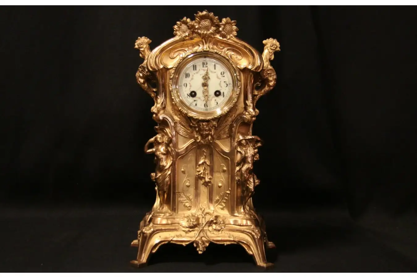 Maidens and roosters adorn this mantle clock with an opulent burnished gold dore finish, signed by its Paris maker about 1900.