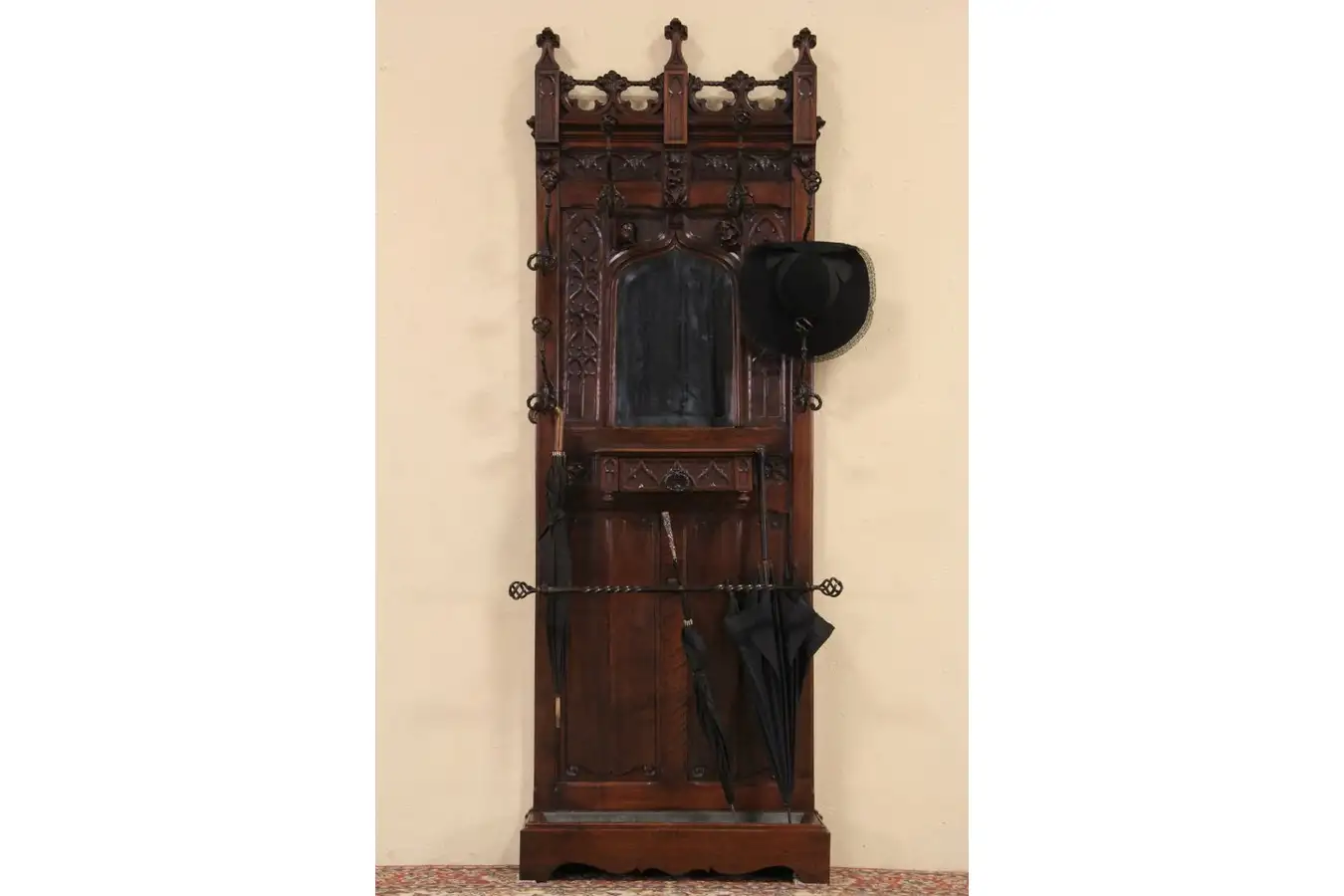 An original shaped and beveled mirror has antique "smoke" to show its age. There is a tin pan to catch drips from umbrellas. Hand wrought iron coat and hat hooks plus the umbrella holder are fabulous on this historic European furniture. The drawer has solid oak hand dovetailed sides.