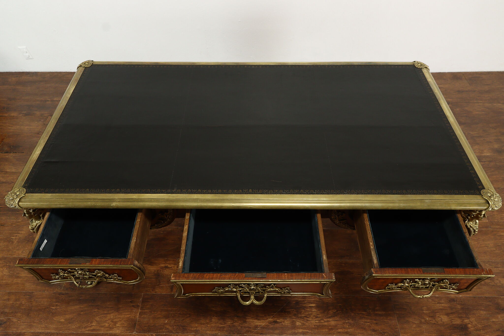 A palatial "Bureau Plat" a library or office desk, was hand crafted in the Louis XIV manner about 1900 in France. The inlaid marquetry includes rosewood, satinwood and mahogany.