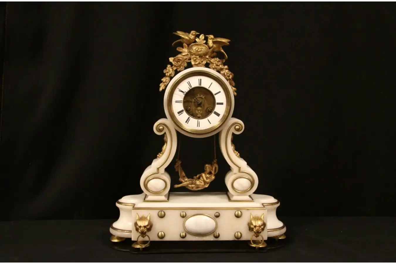 A magnificent marble and bronze mantel clock from France has a girl on a swing as a pendulum. Signed "Chappement Brevete," this exquisite antique keeps accurate time and chimes the hour and the half on a silvery bell.