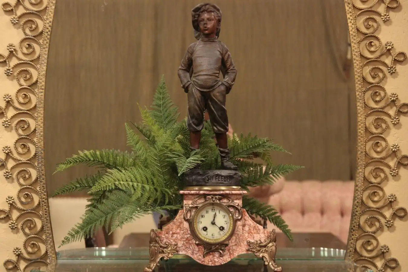A classic red marble French mantel clock has a sculpture of a whistling boy, "Siffleur," signed "H. Tremo." The 8 day clock is a good runner, and strikes the hour and half on a silvery toned bell. Marble and brass mounts are in superb condition, and this clock is an original from about 1900. There are difficult to see hairline cracks at the top of the dial - see photos