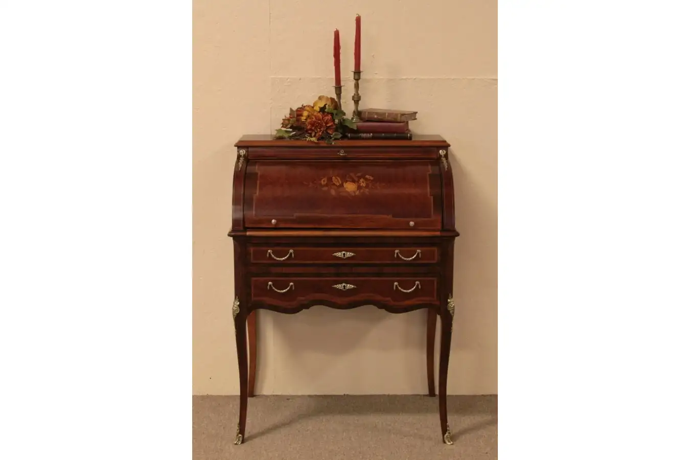 This exquisite marquetry desk with a cylinder or barrel roll top has diagonally matched mahogany inset with satinwood, tulipwood, ebony and rosewood plus banding surrounding the finely detailed designs. There are only minor mars or wear, the original polished finish is excellent.
