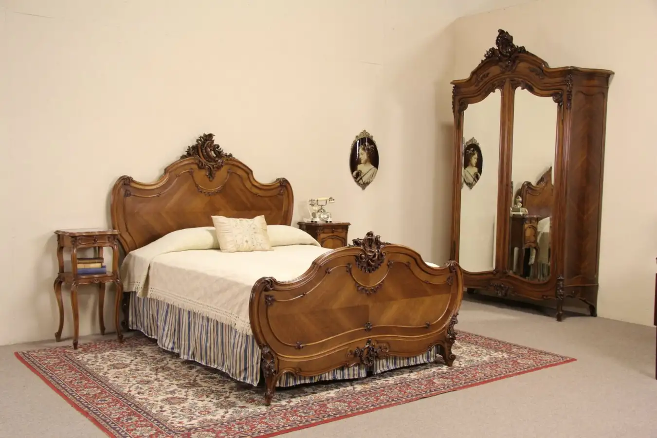 All original, this French walnut four piece bedroom set from around 1900 includes a queen size bed, two nightstands and an armoire. There are magnificent hand carved shell motif crests.