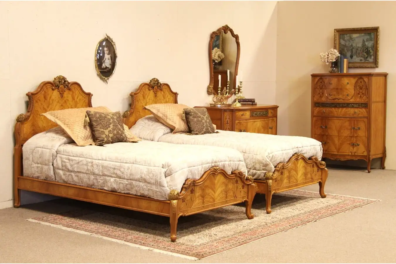 An exquisite 5 piece bedroom set in the French manner is glowing satinwood with inlaid marquetry, and includes 2 twin or single beds, curved dresser, tall chest and wall mirror.