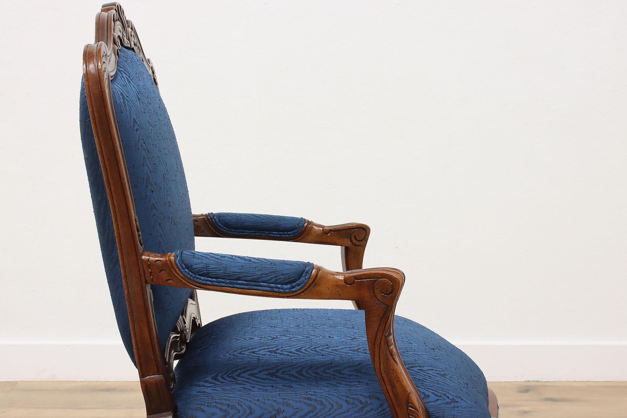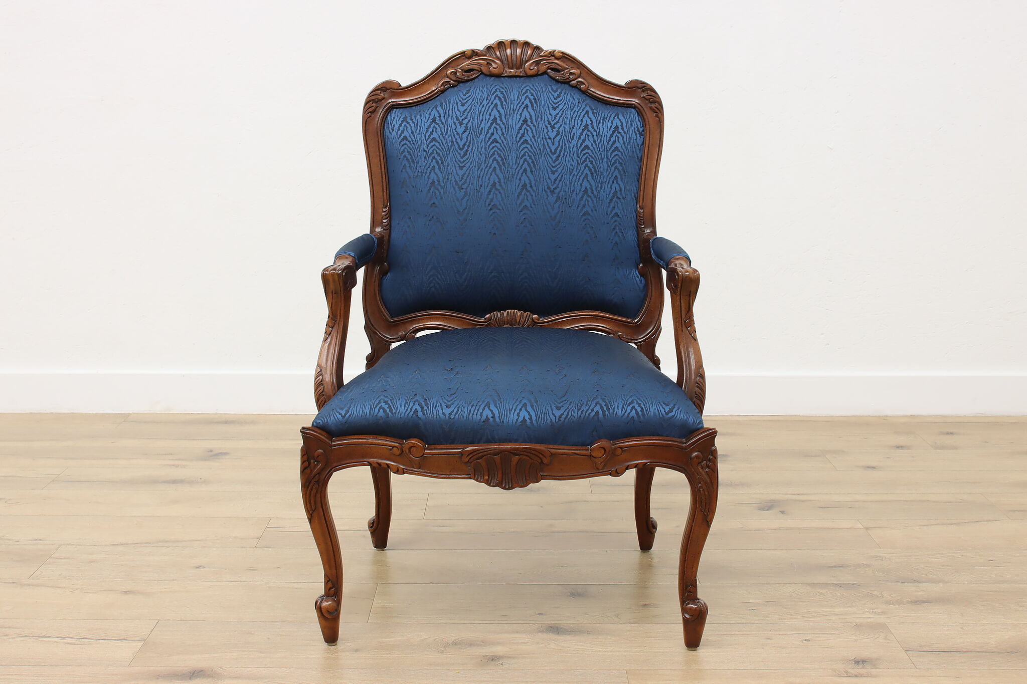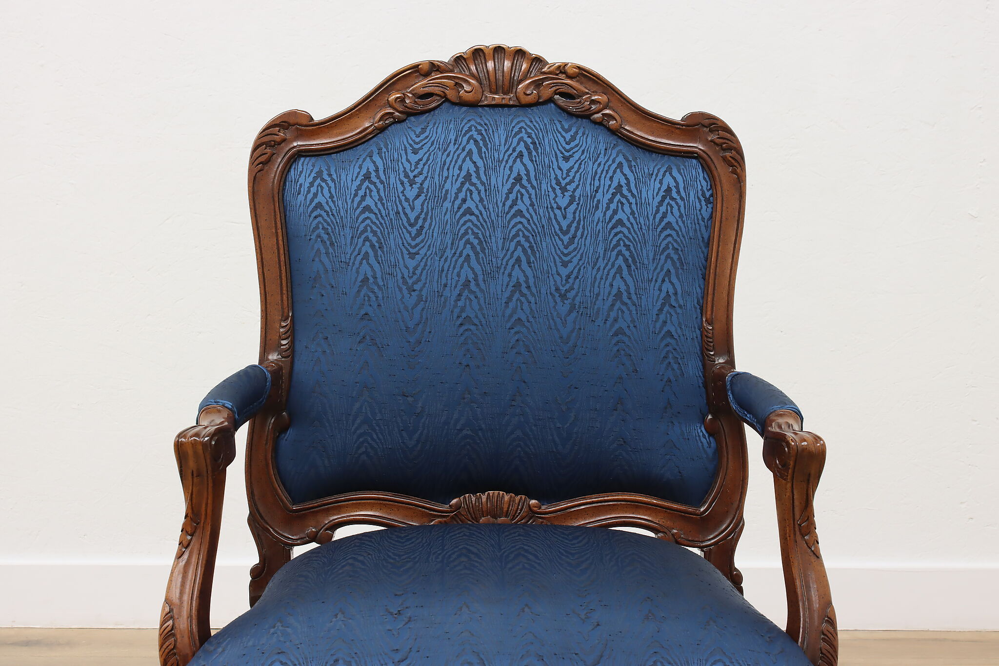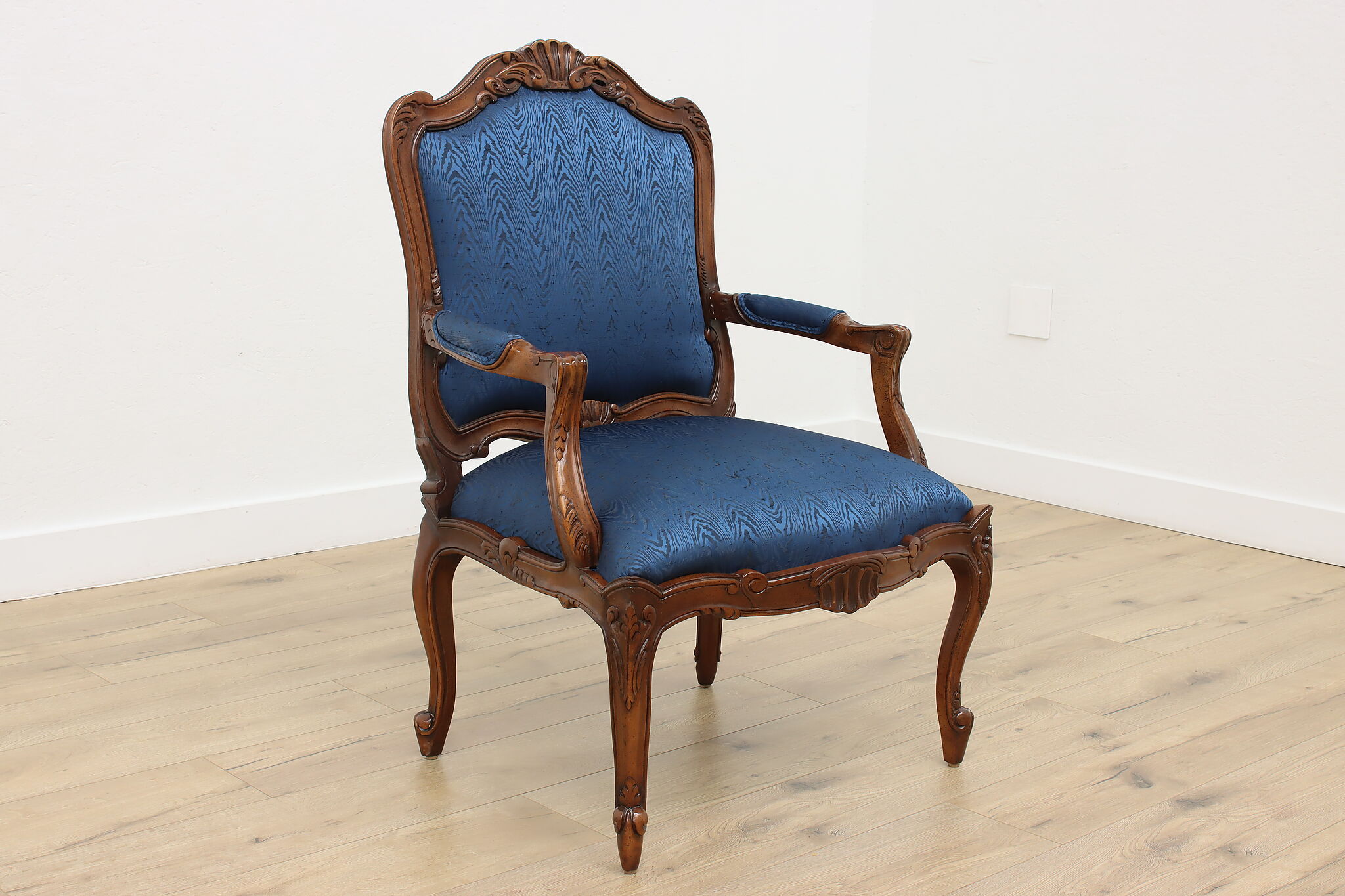 This French design library or office armchair has lovely carved shell motifs, a design found throughout history. Many cultures used seashells as currency and jewelry, and during the 16th century when Rococo design emerged, shells became one of the most popular motifs in art and furniture.