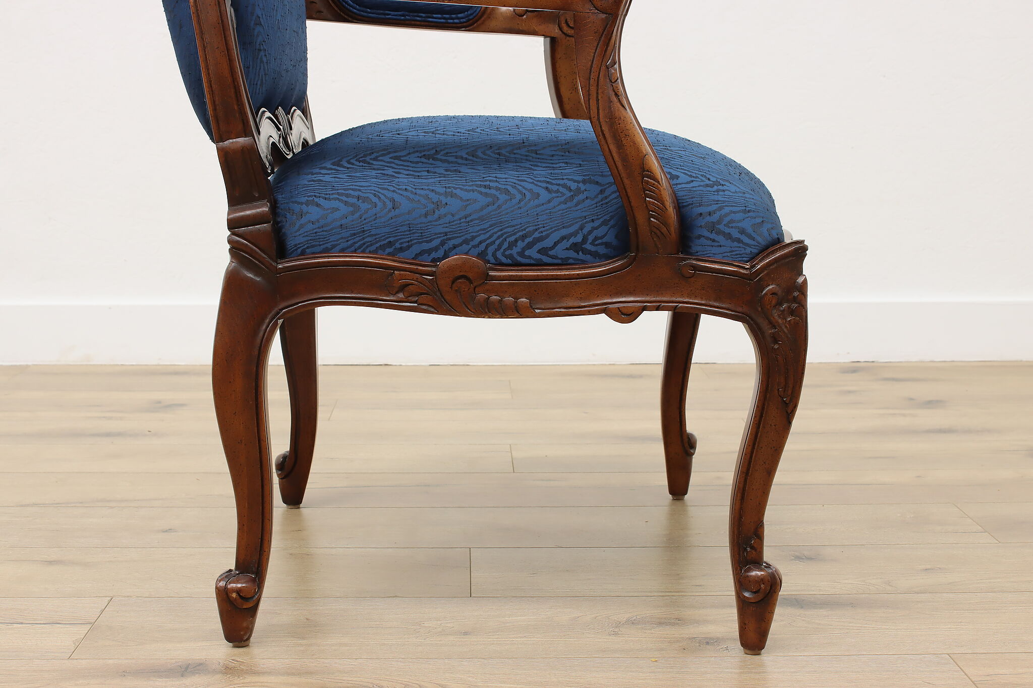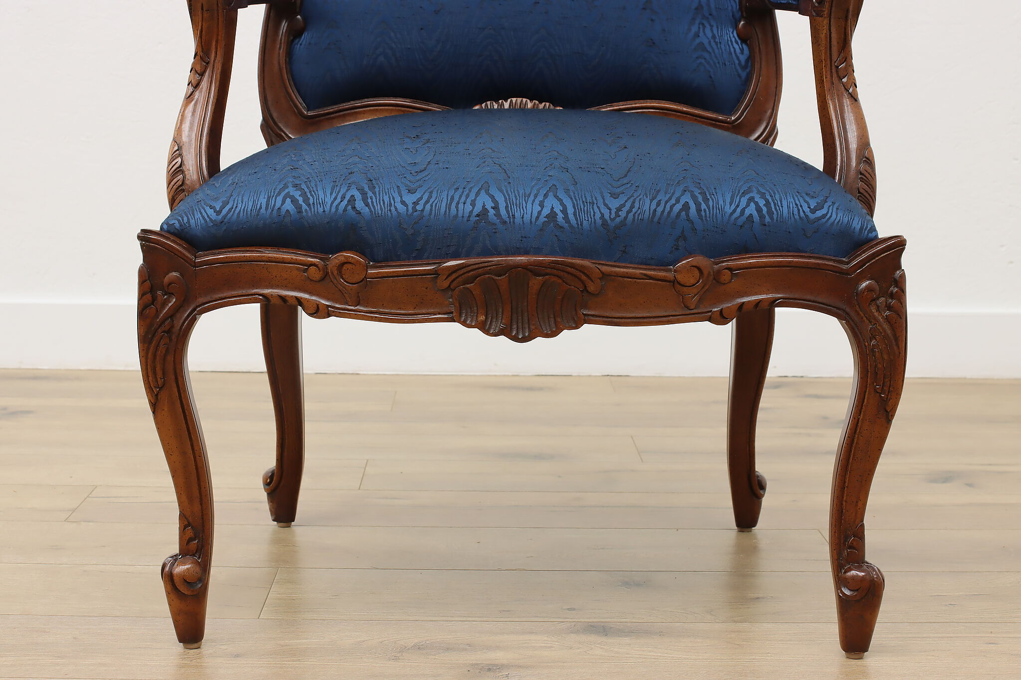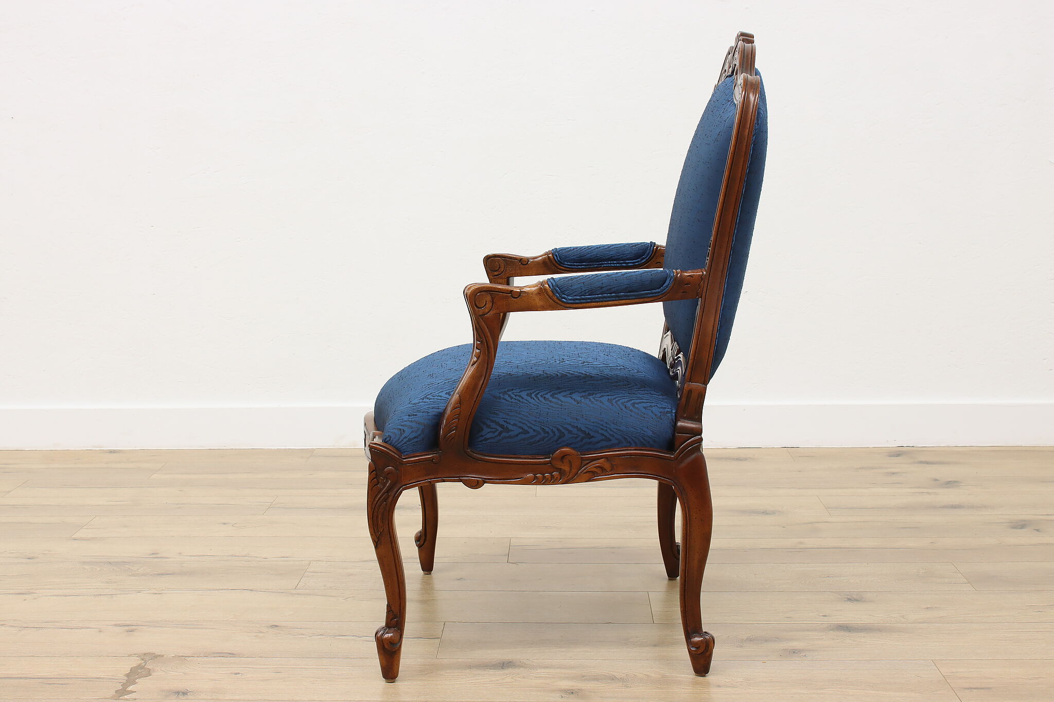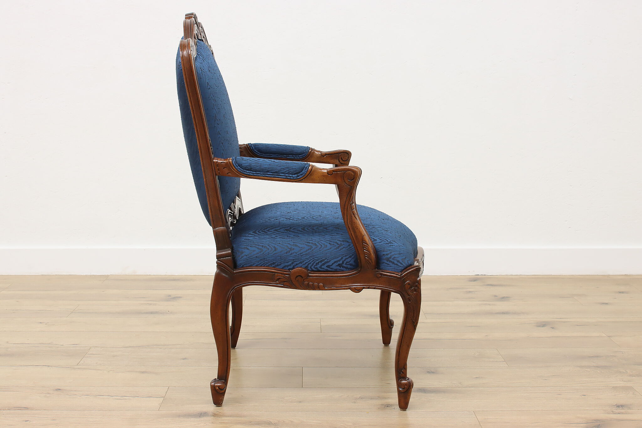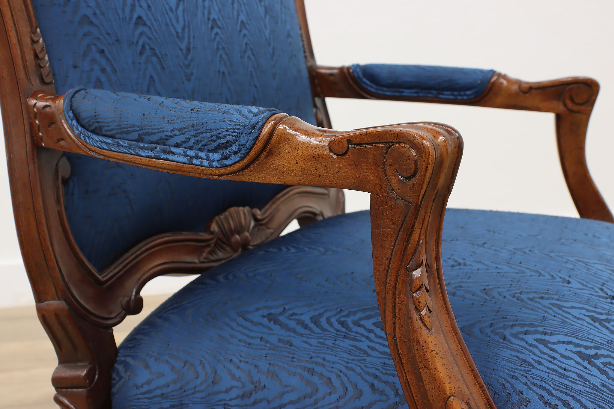 This French design library or office armchair has lovely carved shell motifs, a design found throughout history. Many cultures used seashells as currency and jewelry, and during the 16th century when Rococo design emerged, shells became one of the most popular motifs in art and furniture.