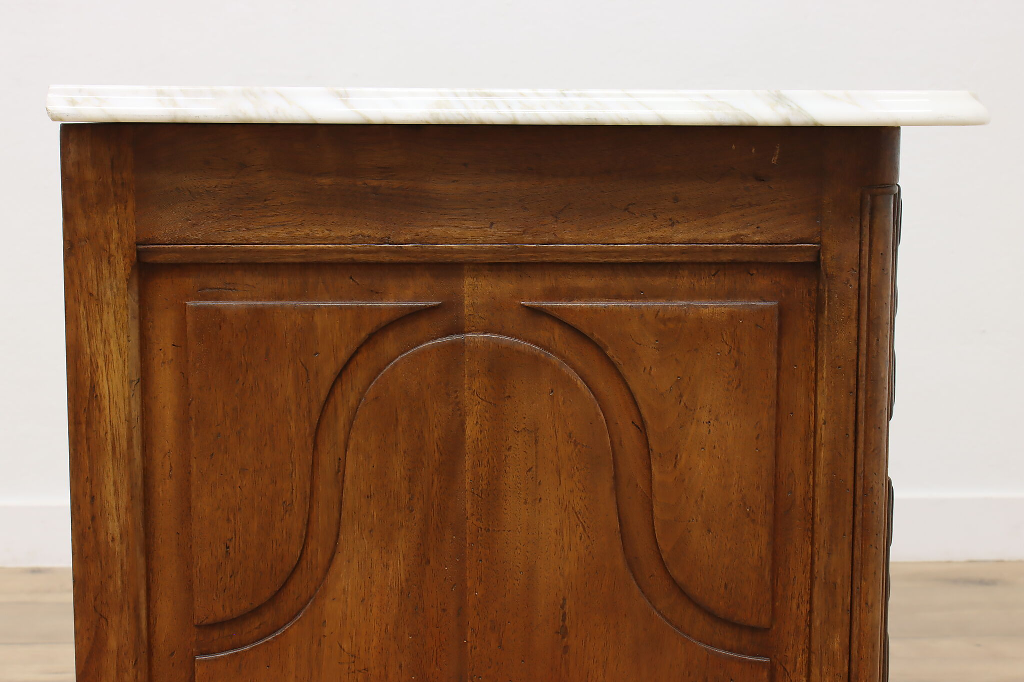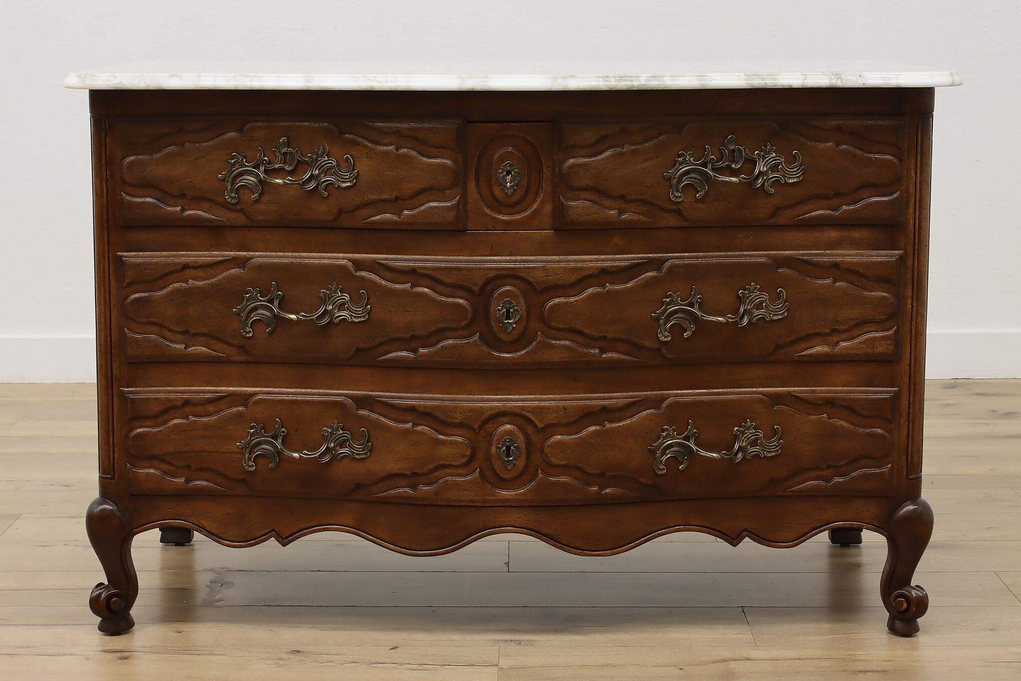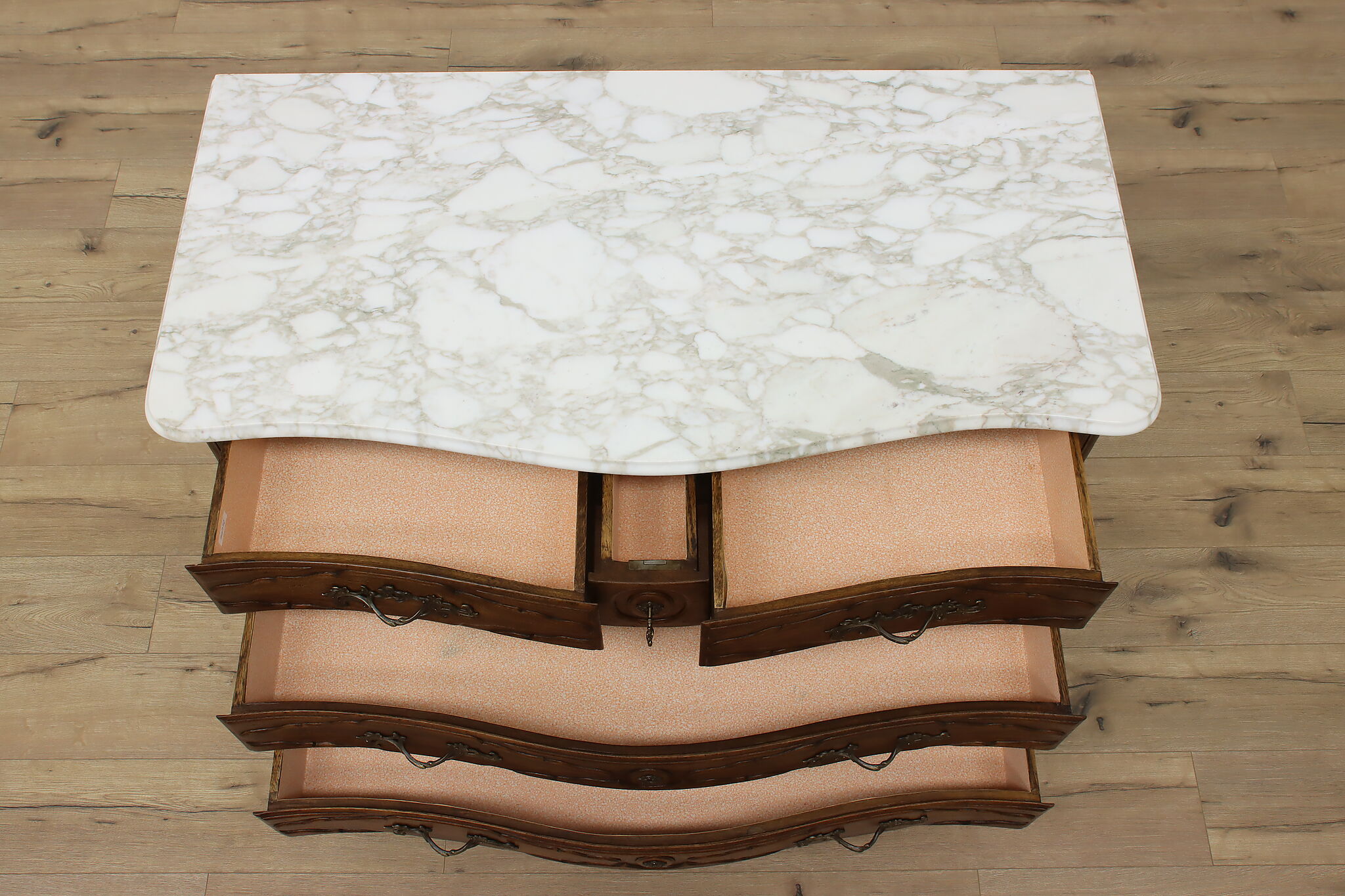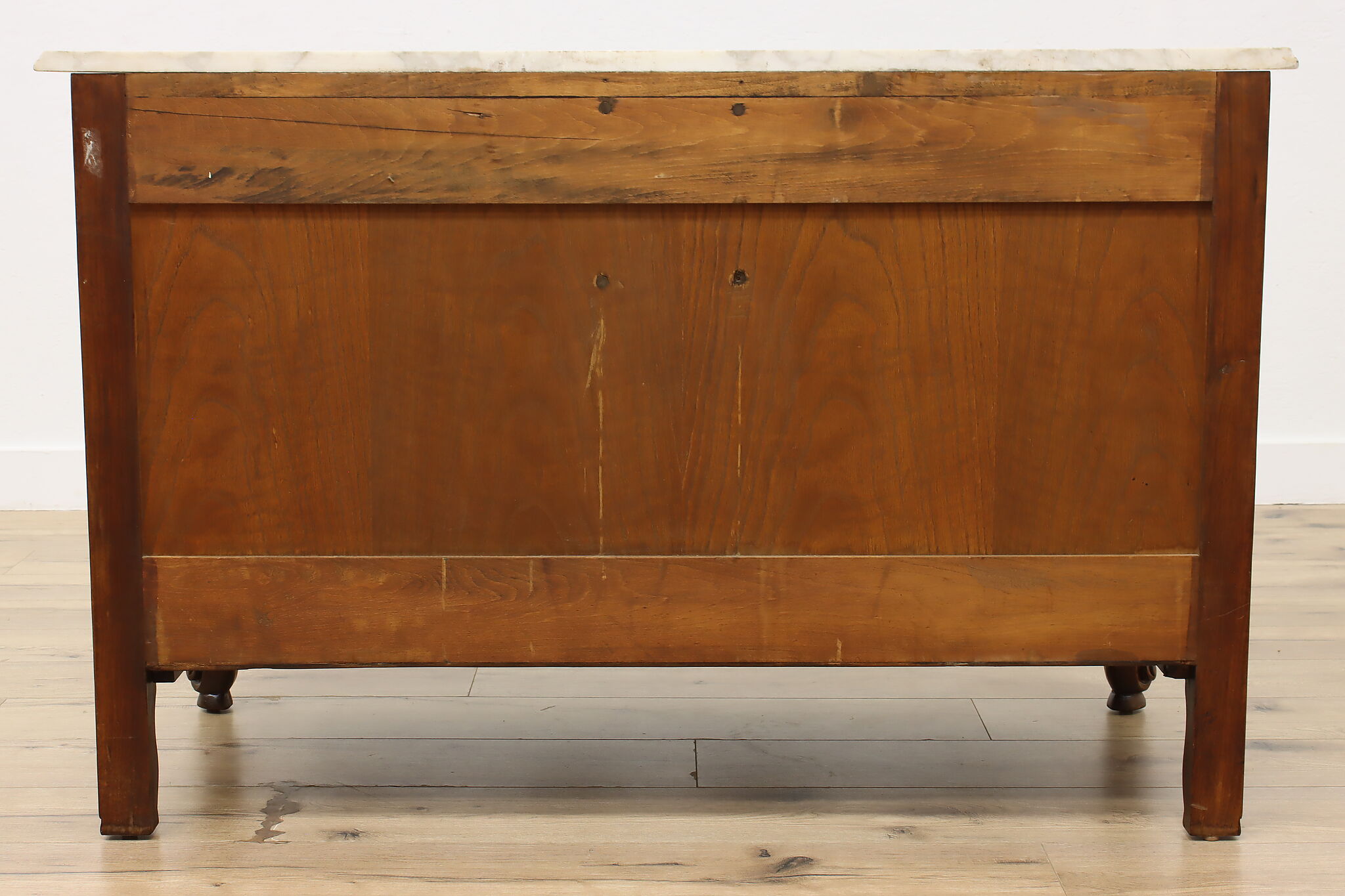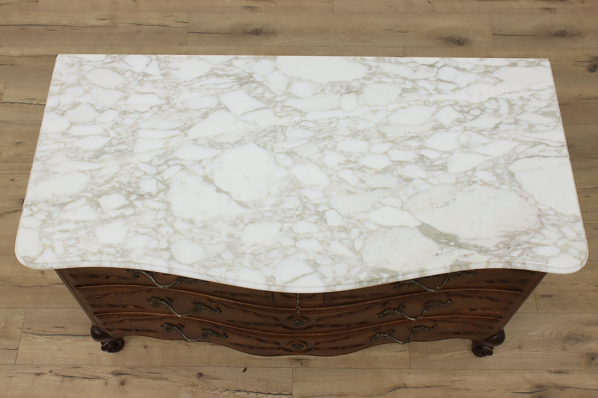 Designed after beautiful 18th century furniture, this outstanding dresser or chest has a fabulous white marble top.