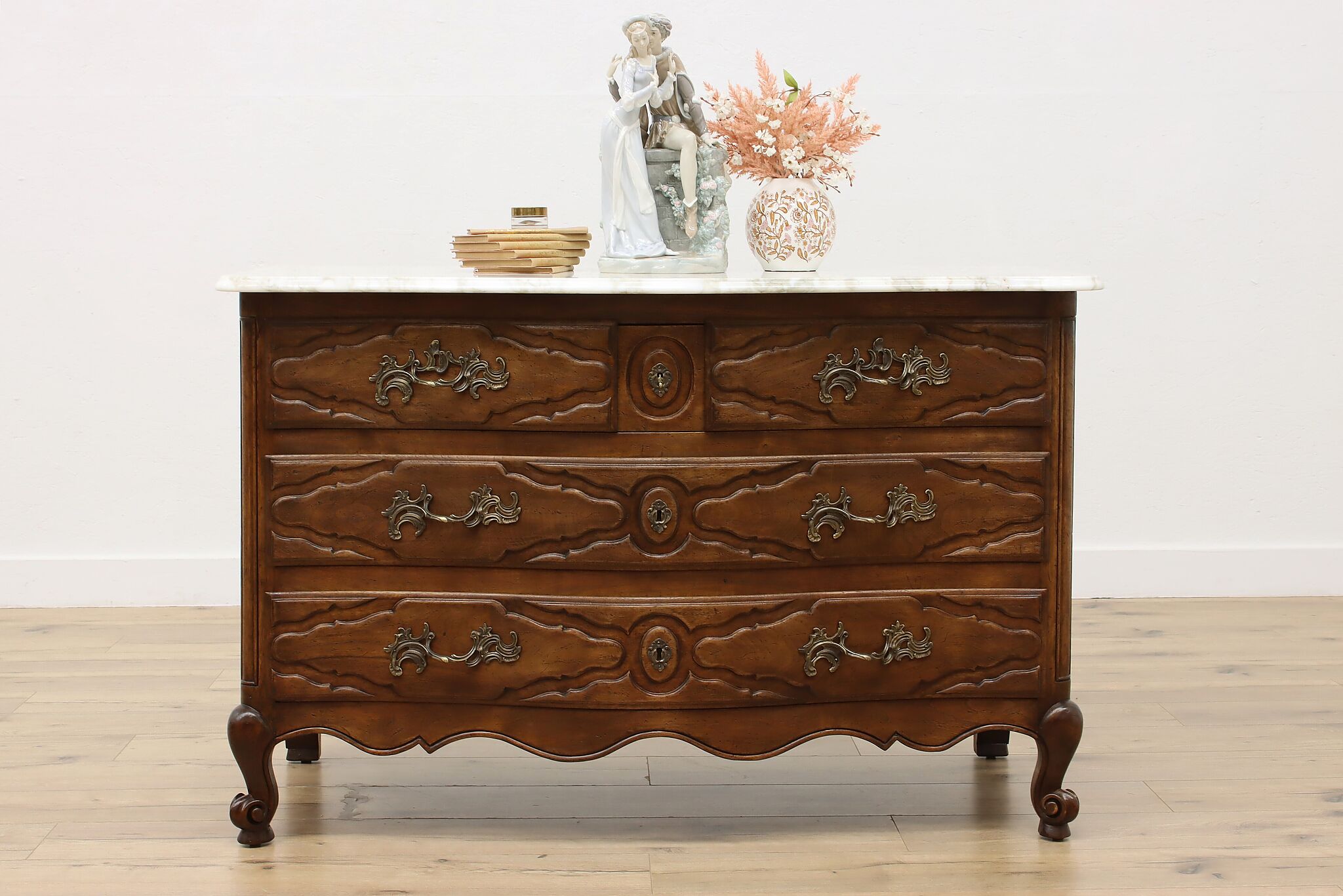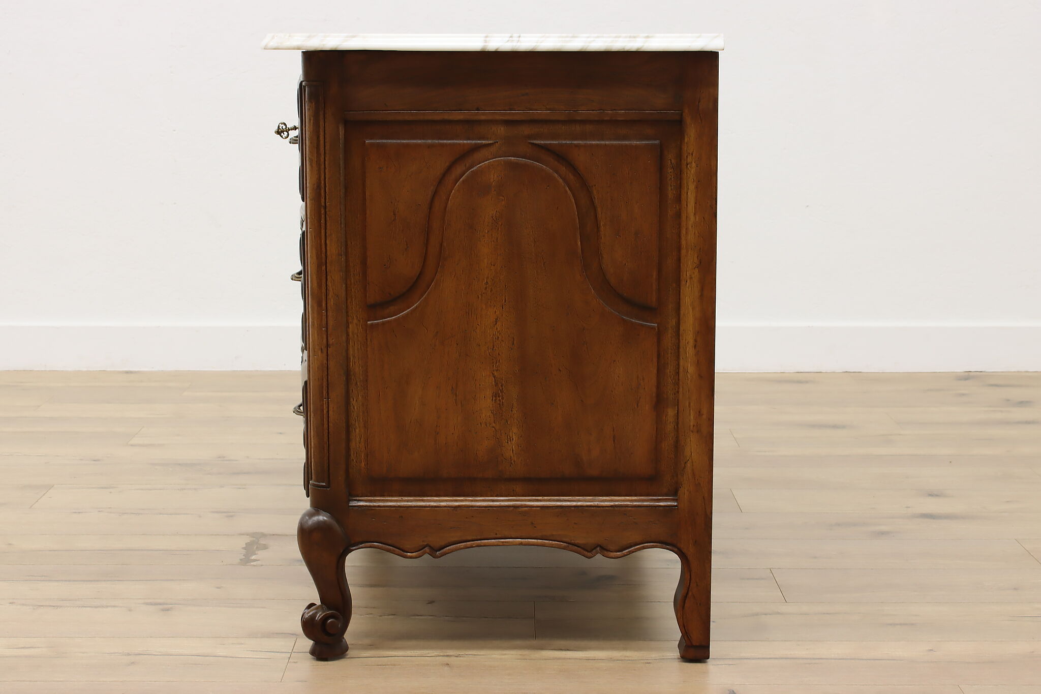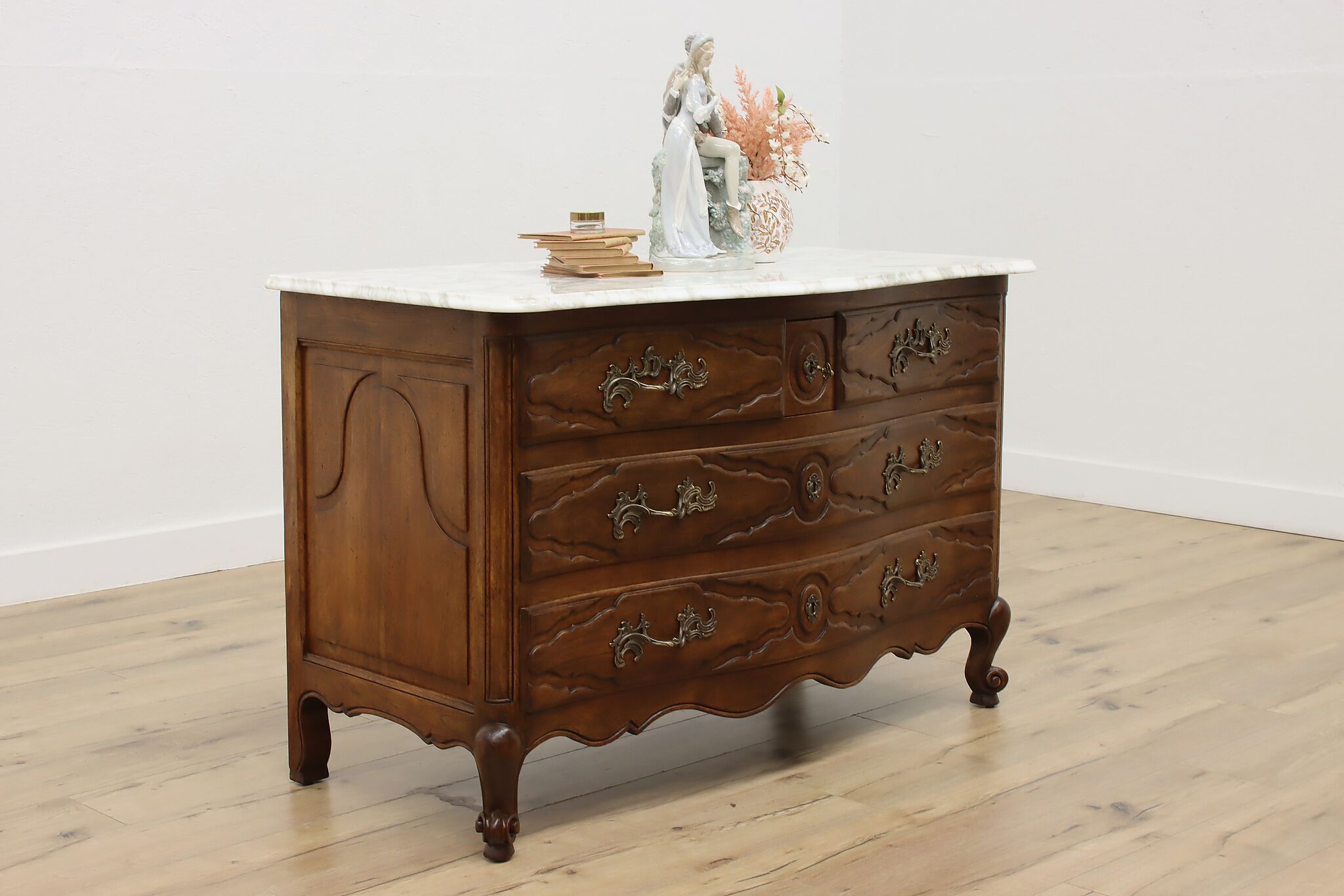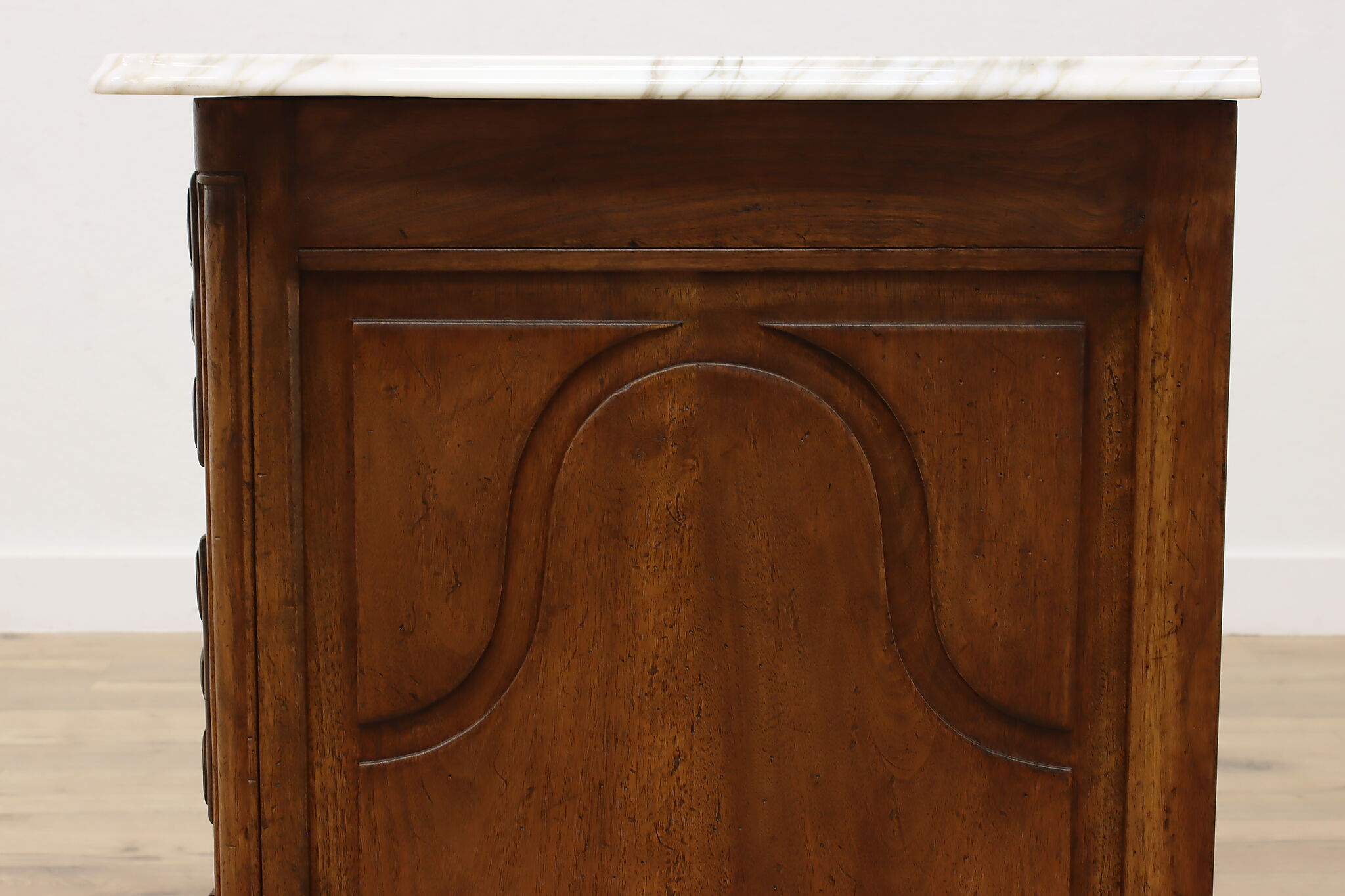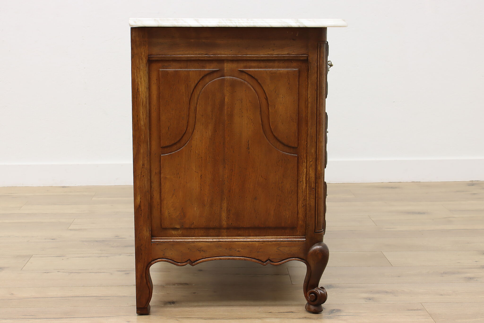 Designed after beautiful 18th century furniture, this outstanding dresser or chest has a fabulous white marble top.