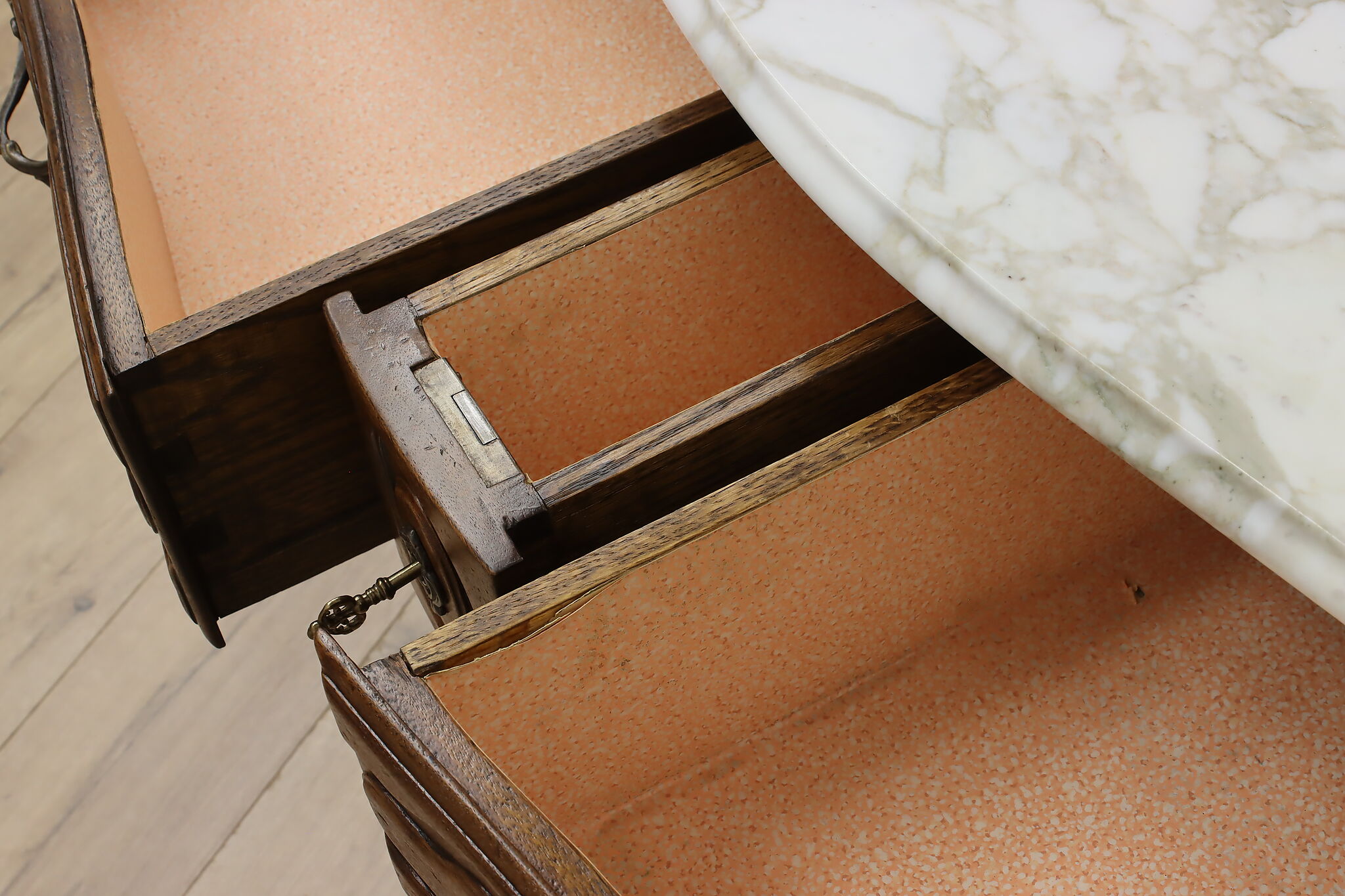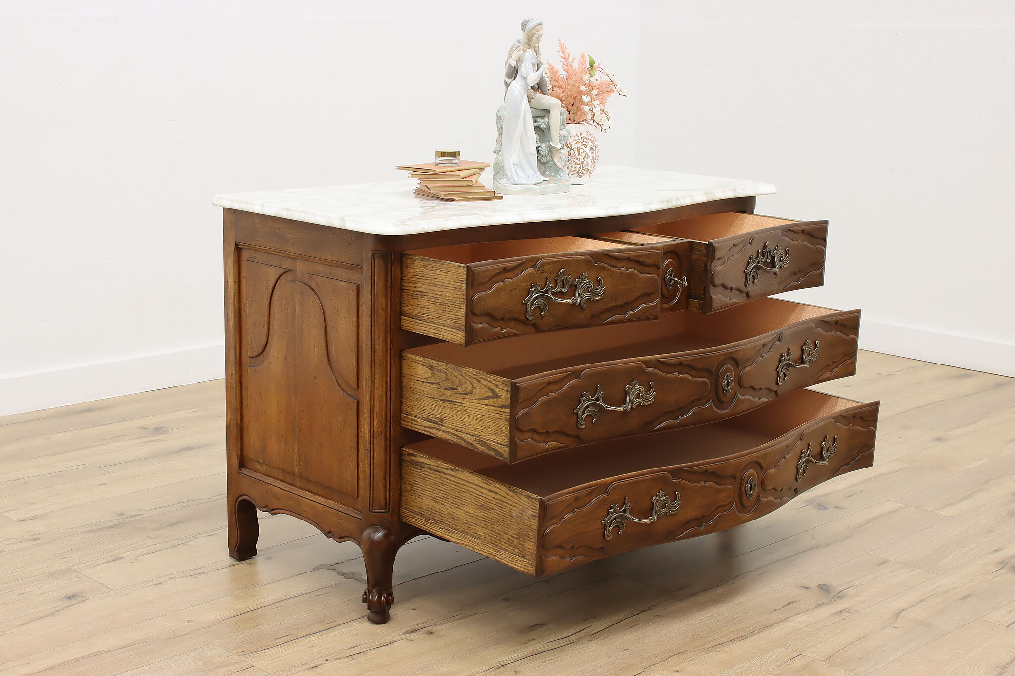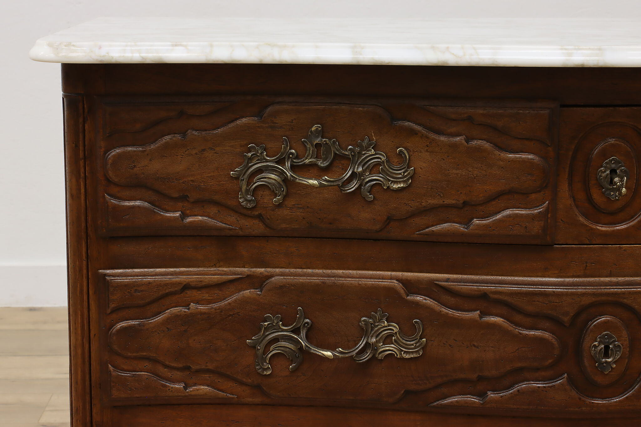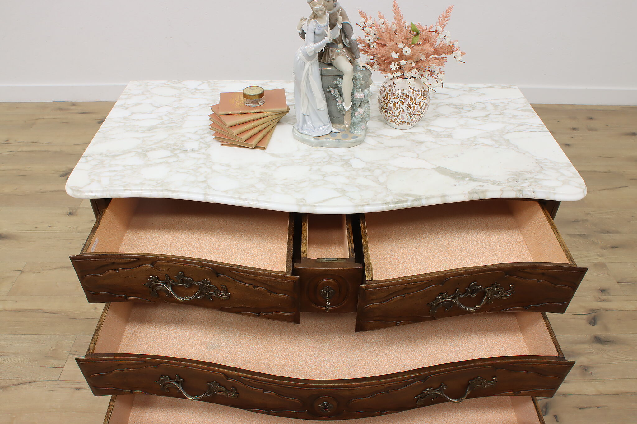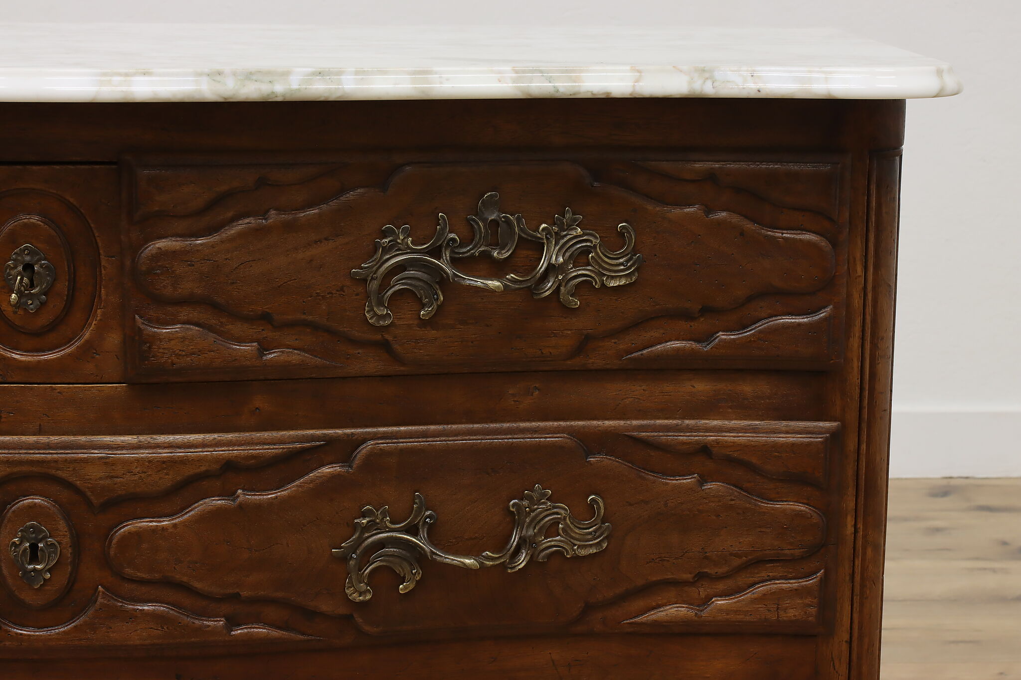 Designed after beautiful 18th century furniture, this outstanding dresser or chest has a fabulous white marble top.