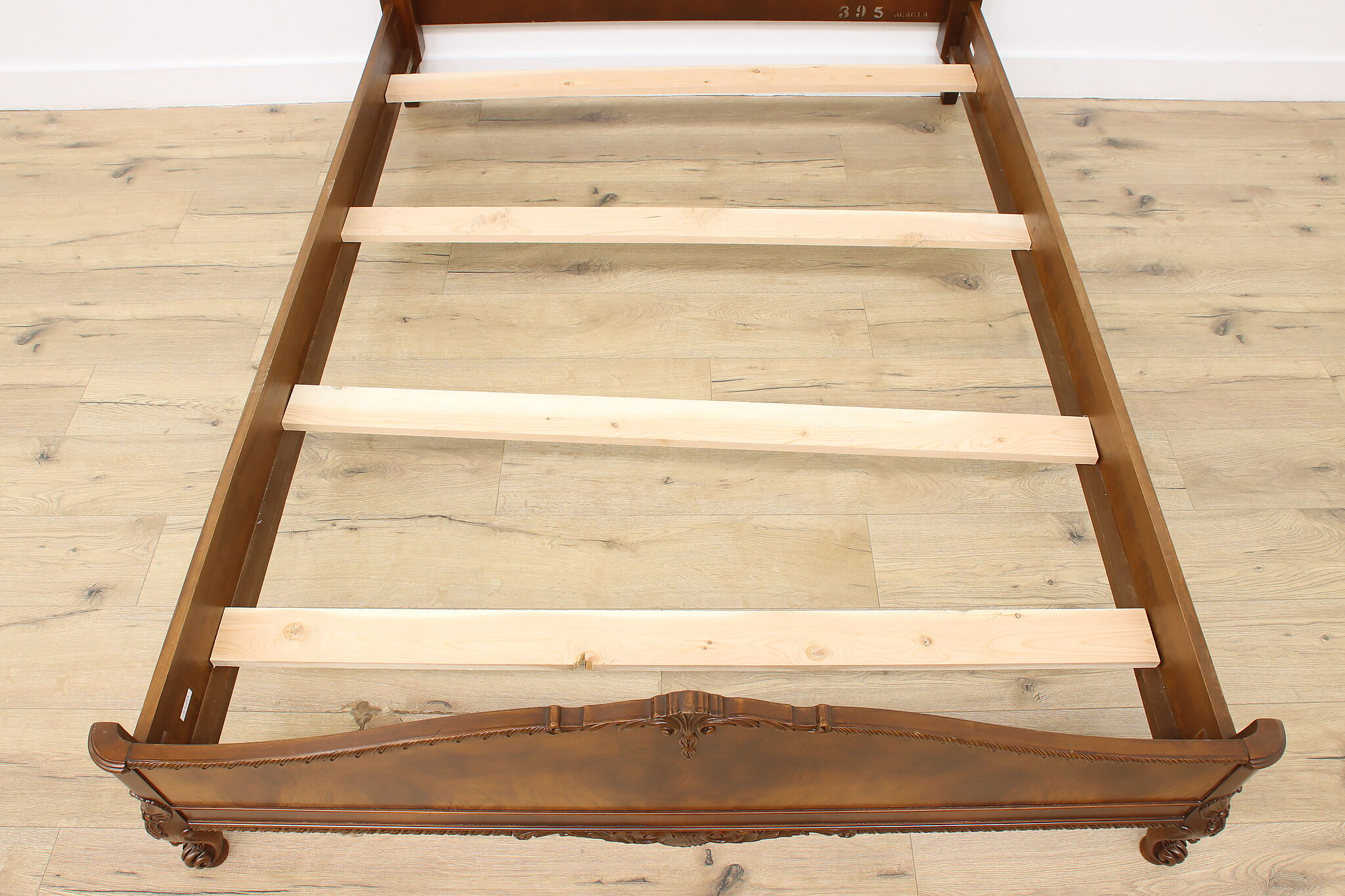 Bed size is 78.5" long and 59" wide. Headboard is 45" tall and the footboard is 22" tall. Slats sit 8.5" from ground and the demonstrator mattress is 14" thick. Interior dimensions of the bed frame are 73” long and 52” wide.