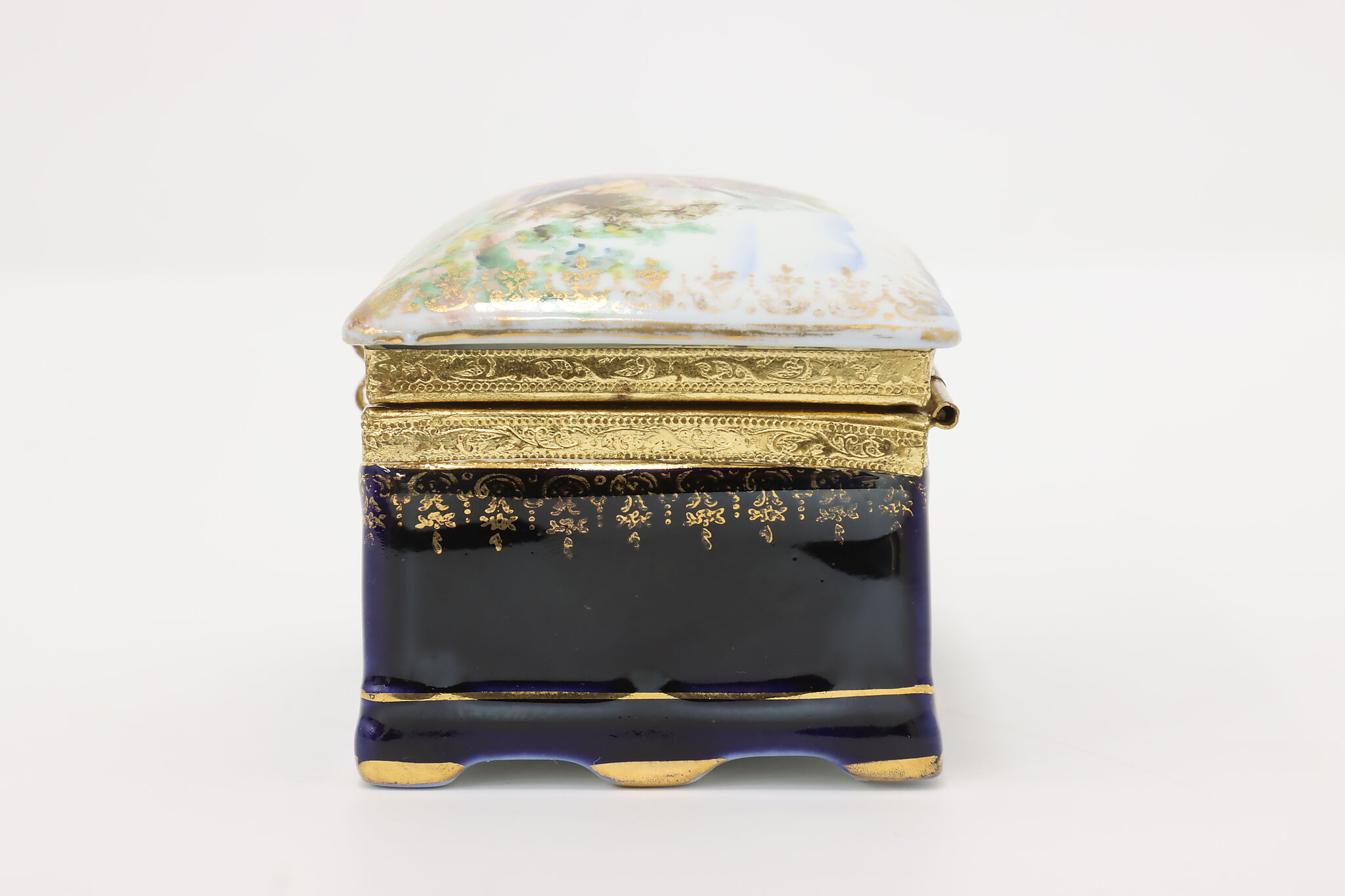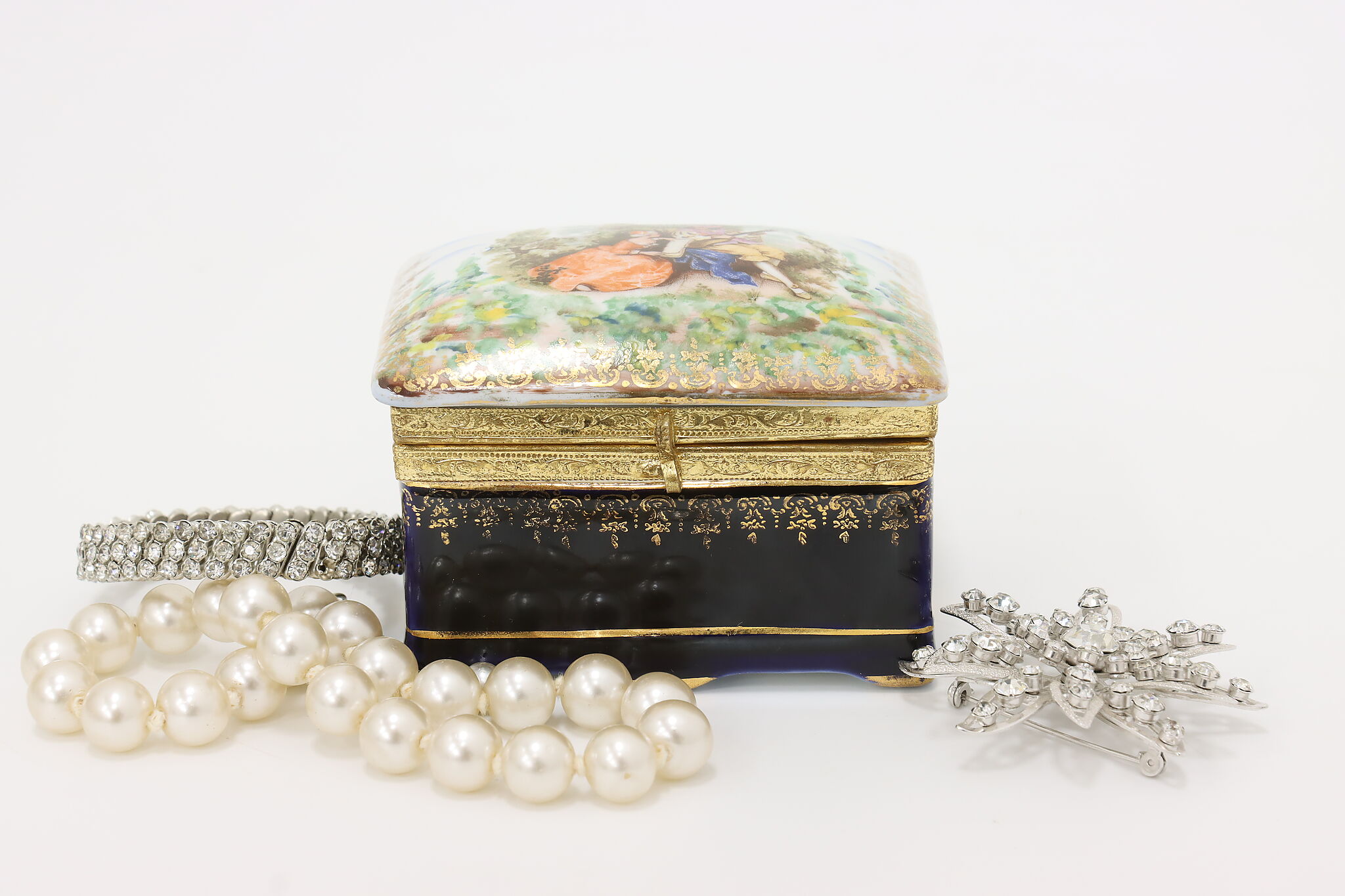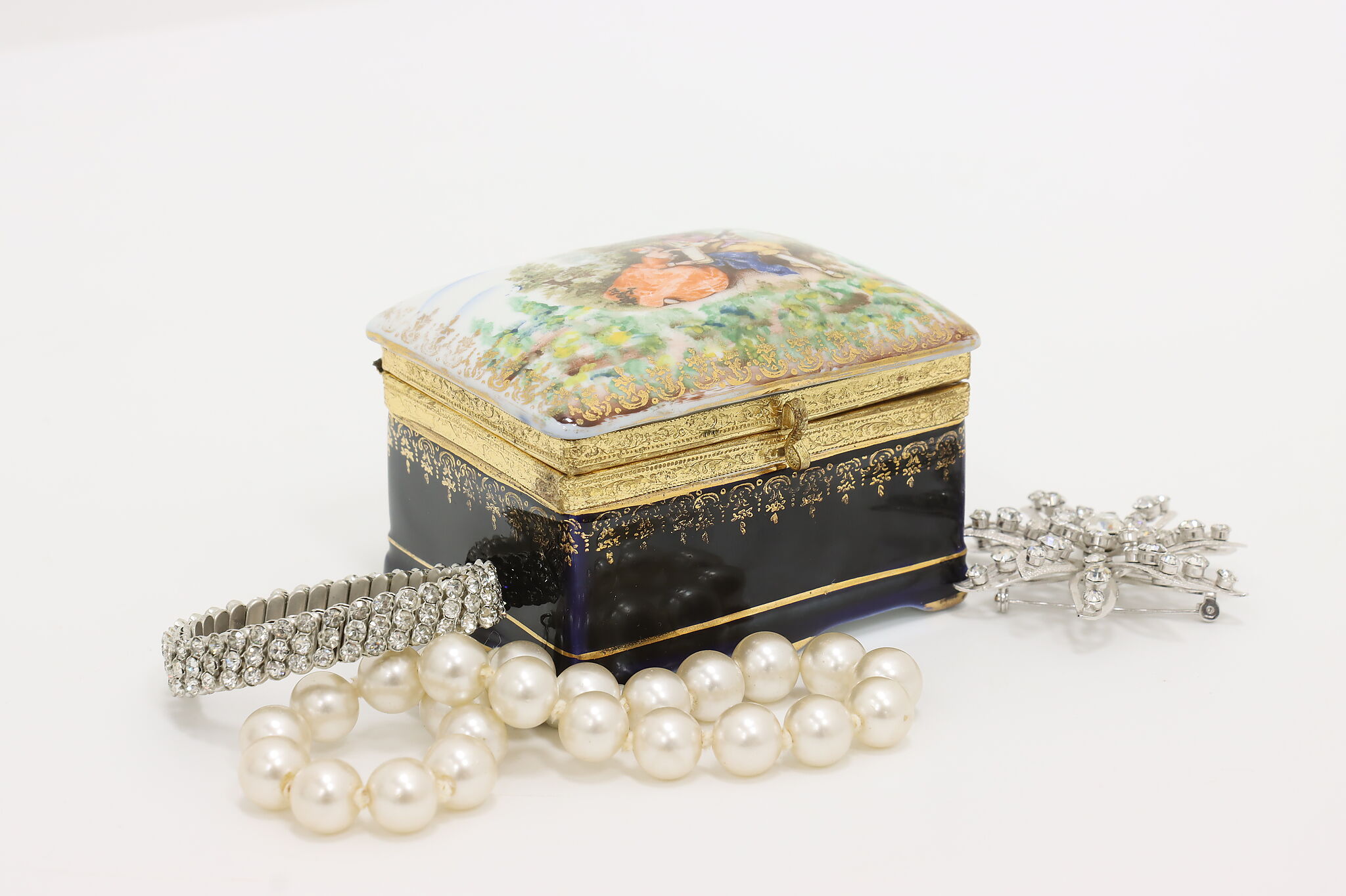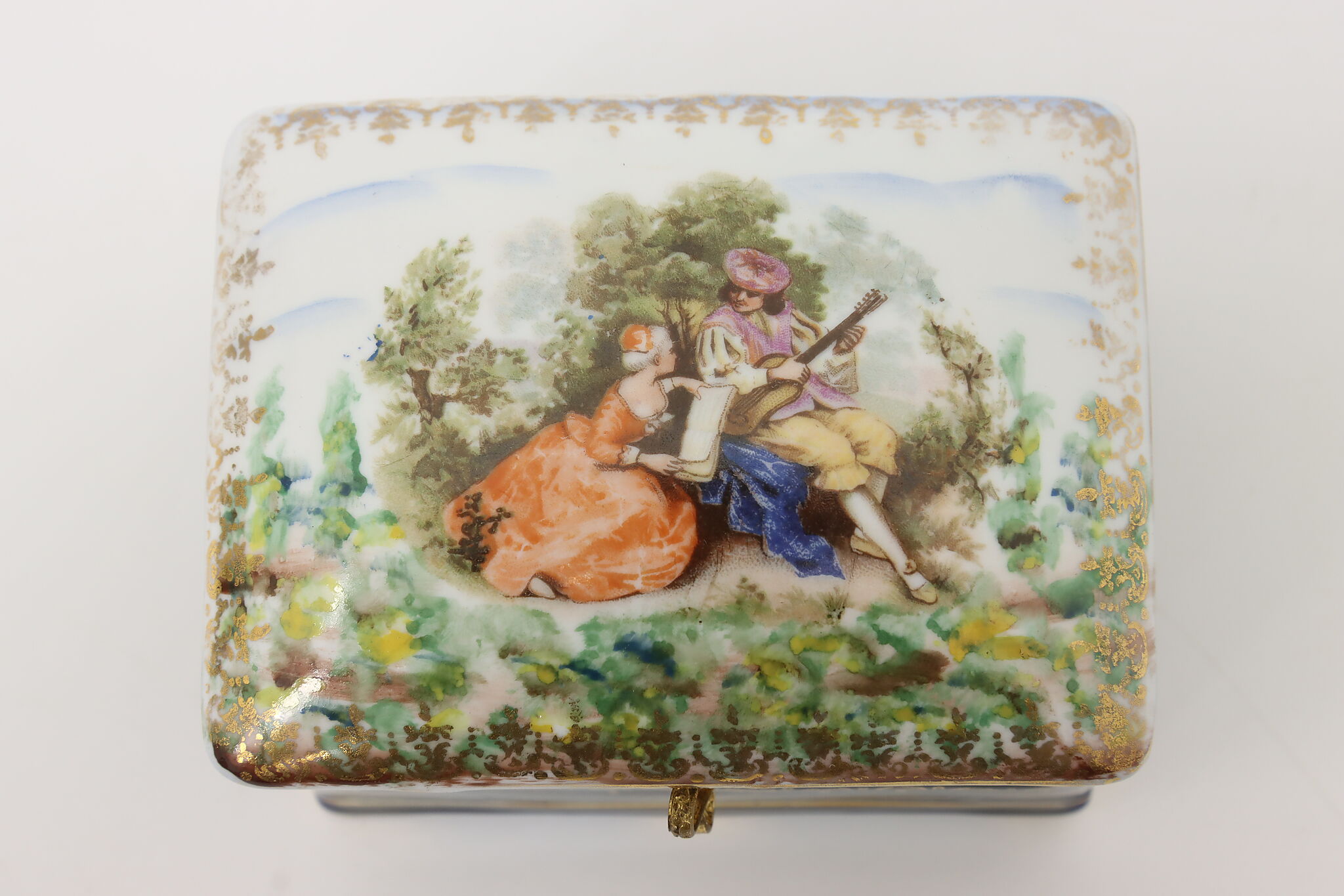Many of the French aristocracy dreamed of an idyllic pastoral lifestyle, decorating their art like this jewelry box with a courting couple in a blooming garden.