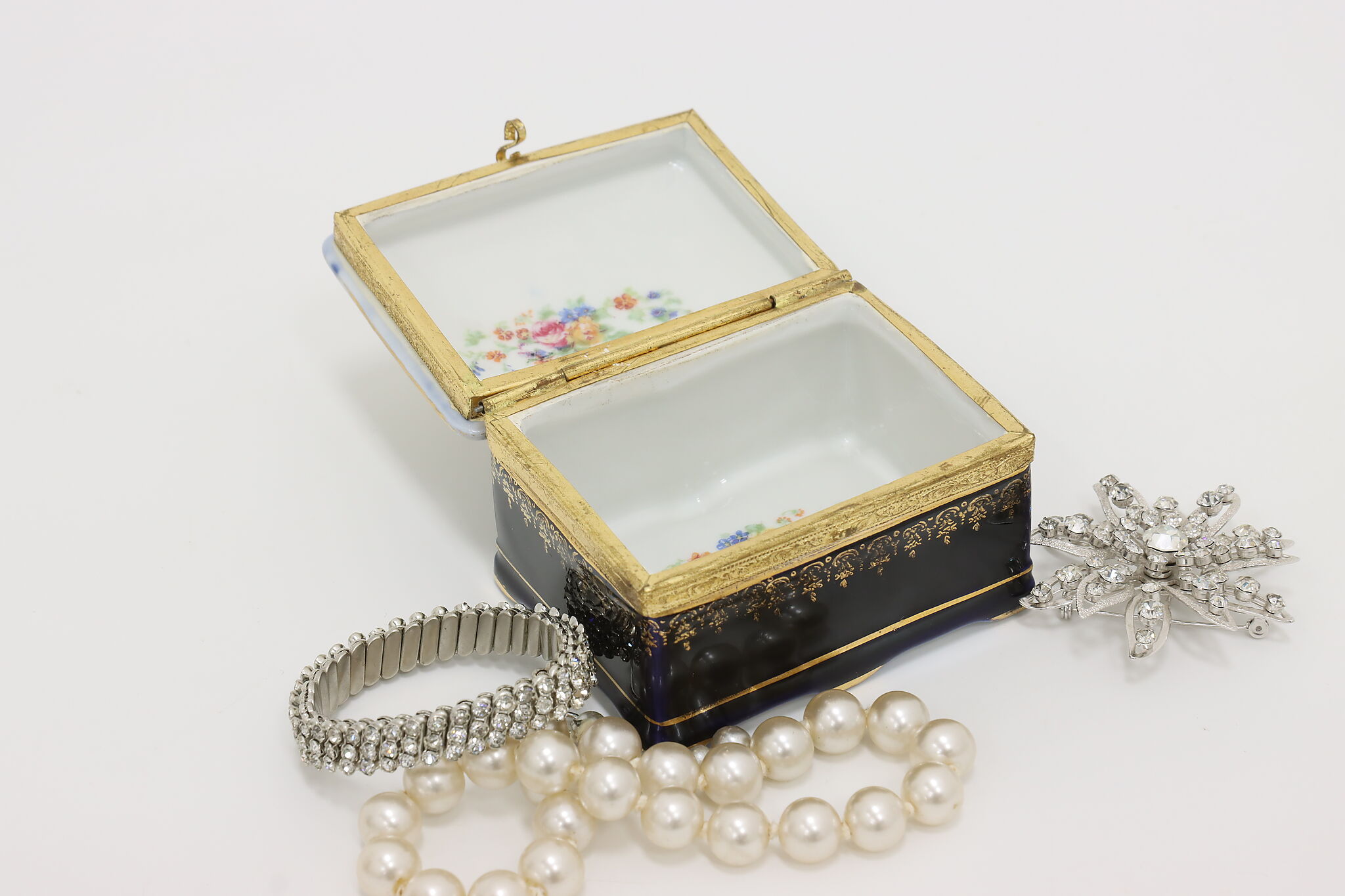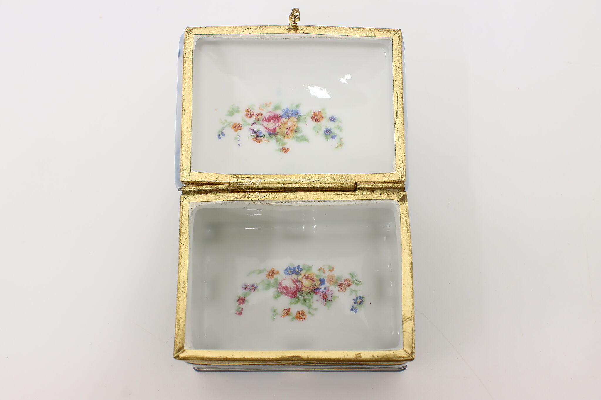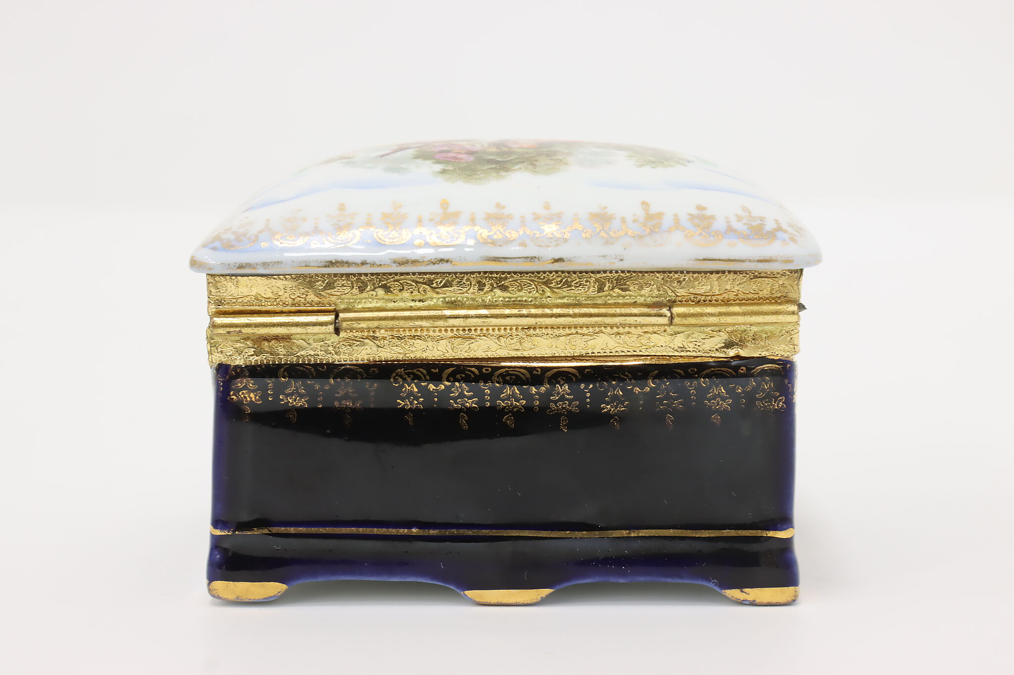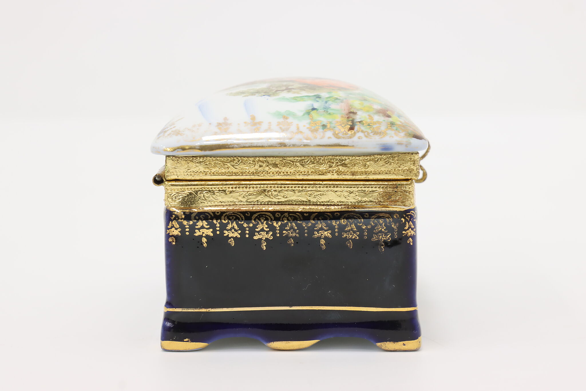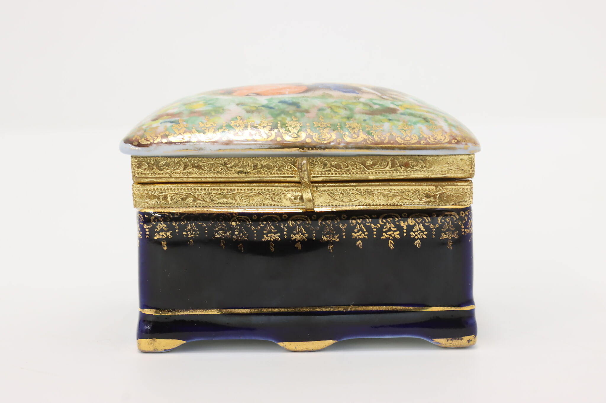 Many of the French aristocracy dreamed of an idyllic pastoral lifestyle, decorating their art like this jewelry box with a courting couple in a blooming garden.