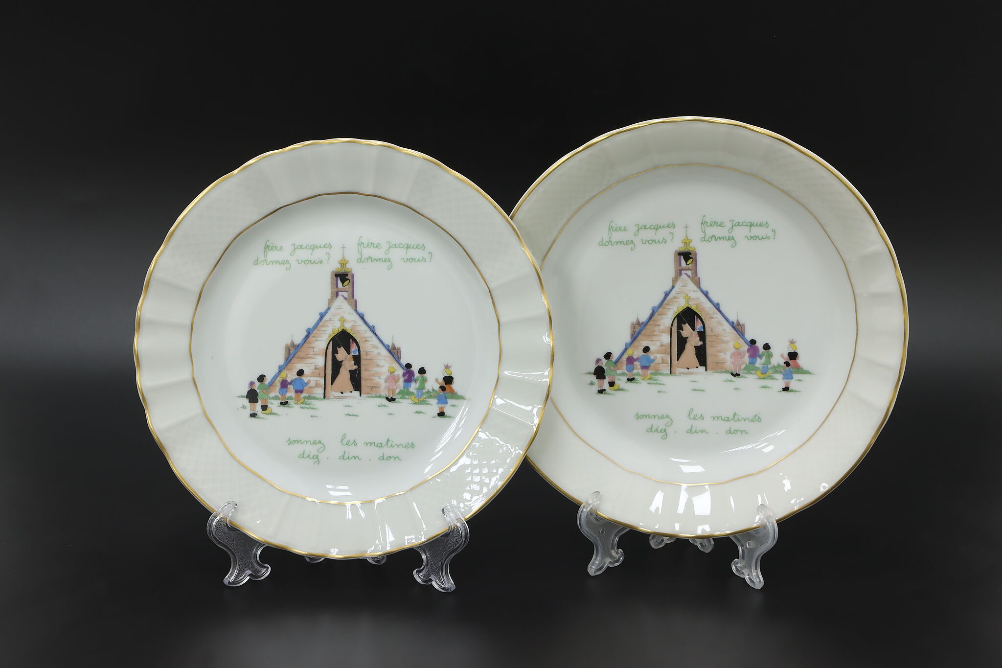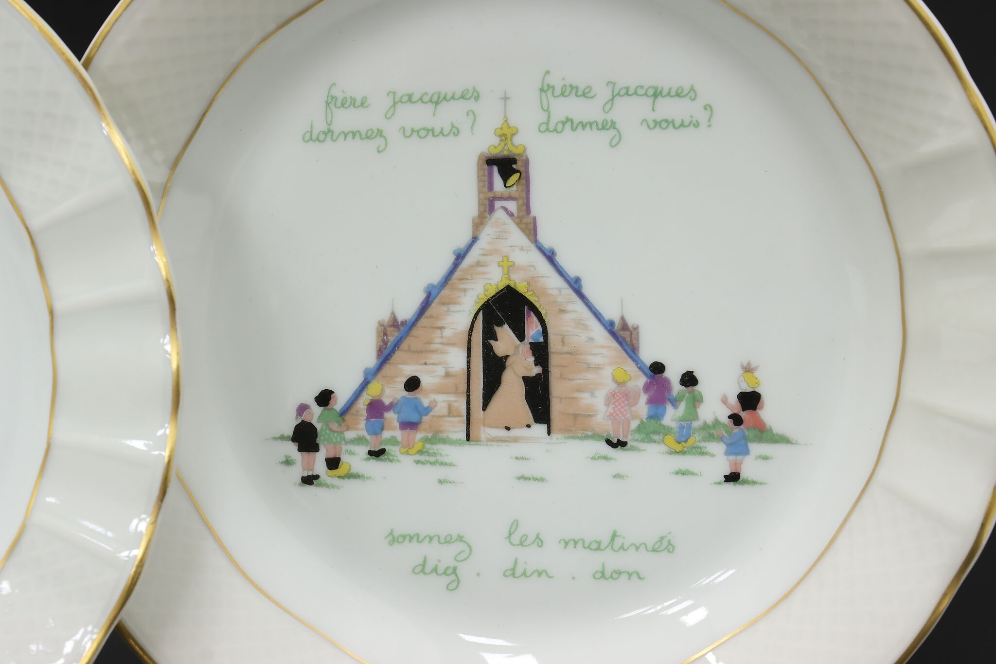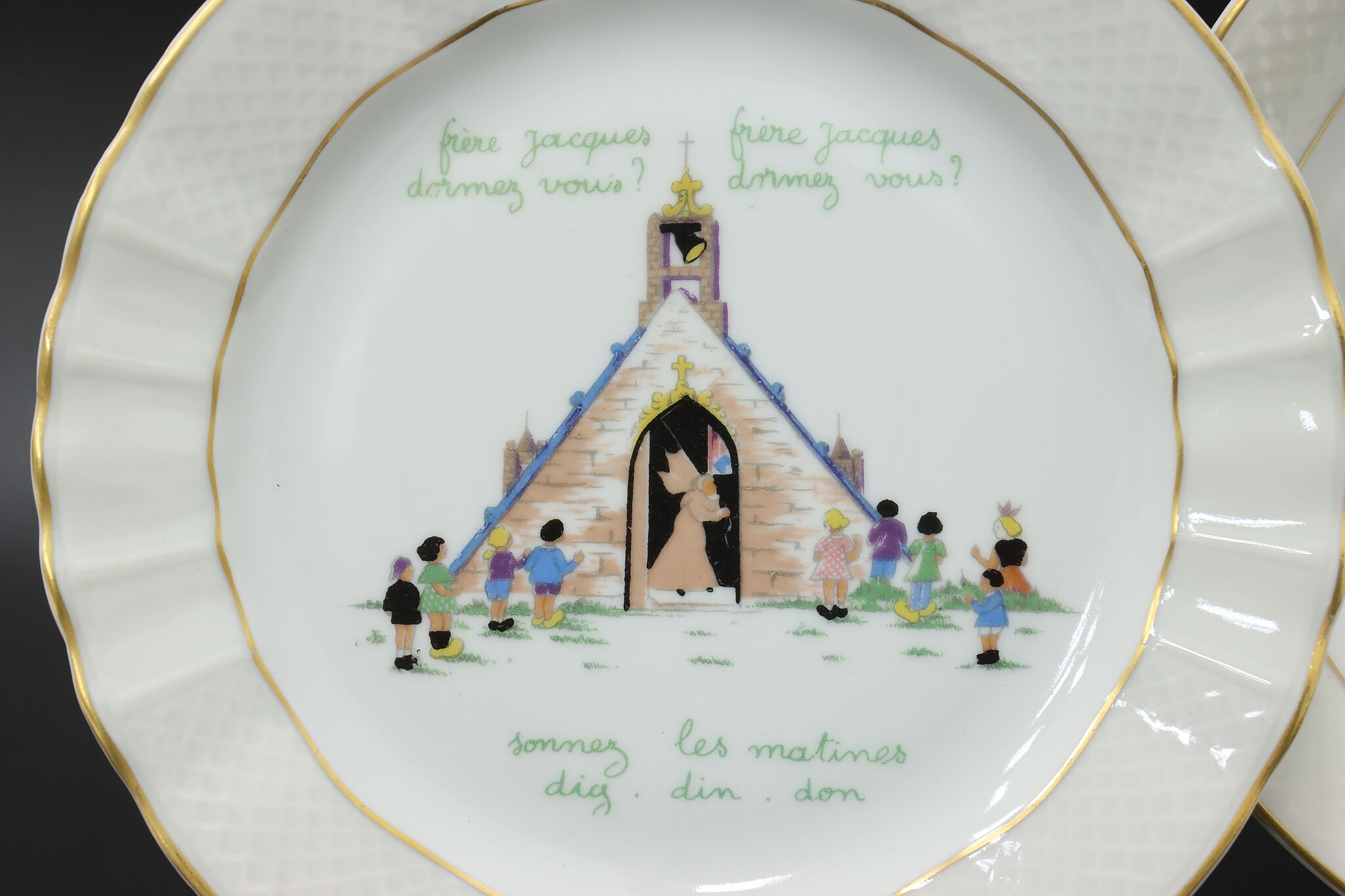 This French Limoges plate and bowl set has painted scenes of the famous French nursey rhyme, "Frere Jacques."
