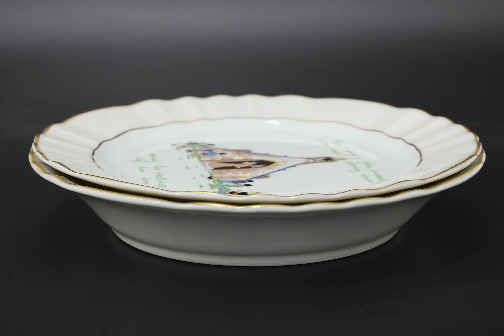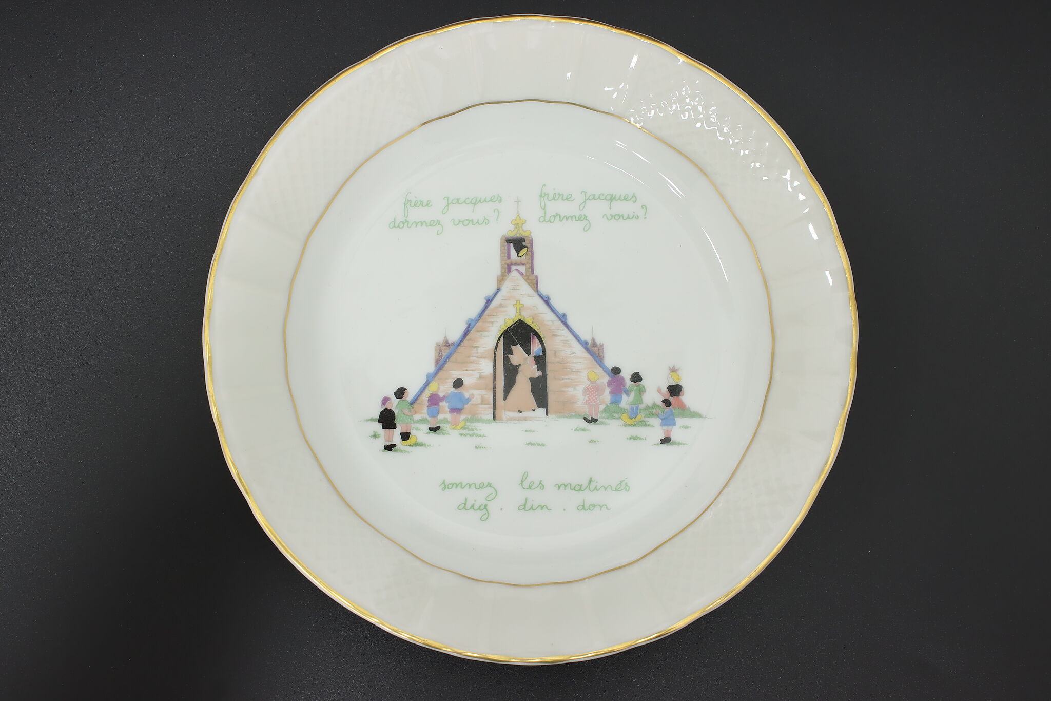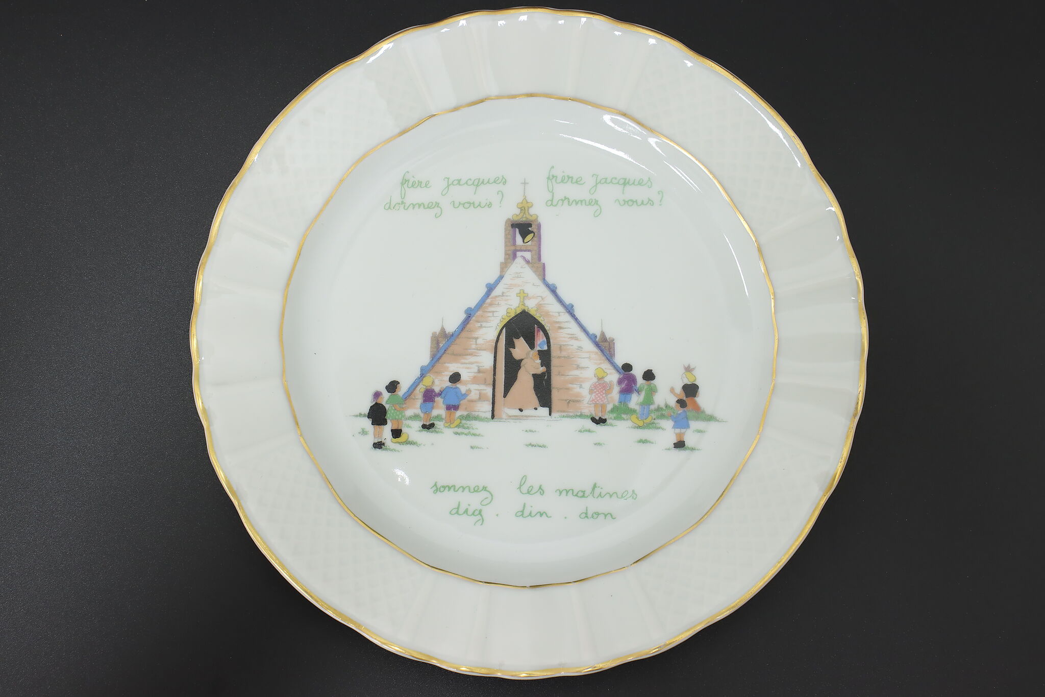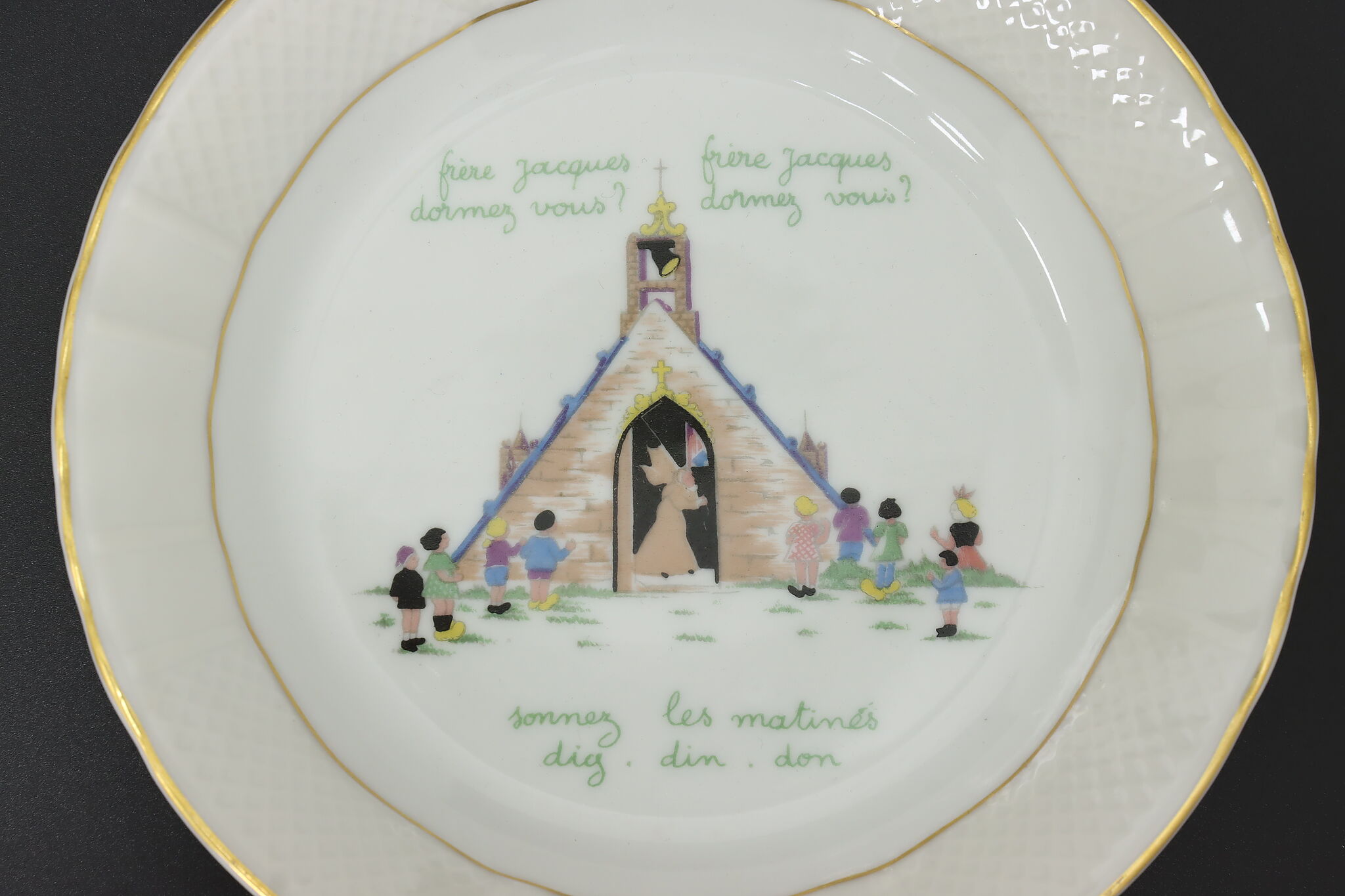 This French Limoges plate and bowl set has painted scenes of the famous French nursey rhyme, "Frere Jacques."
