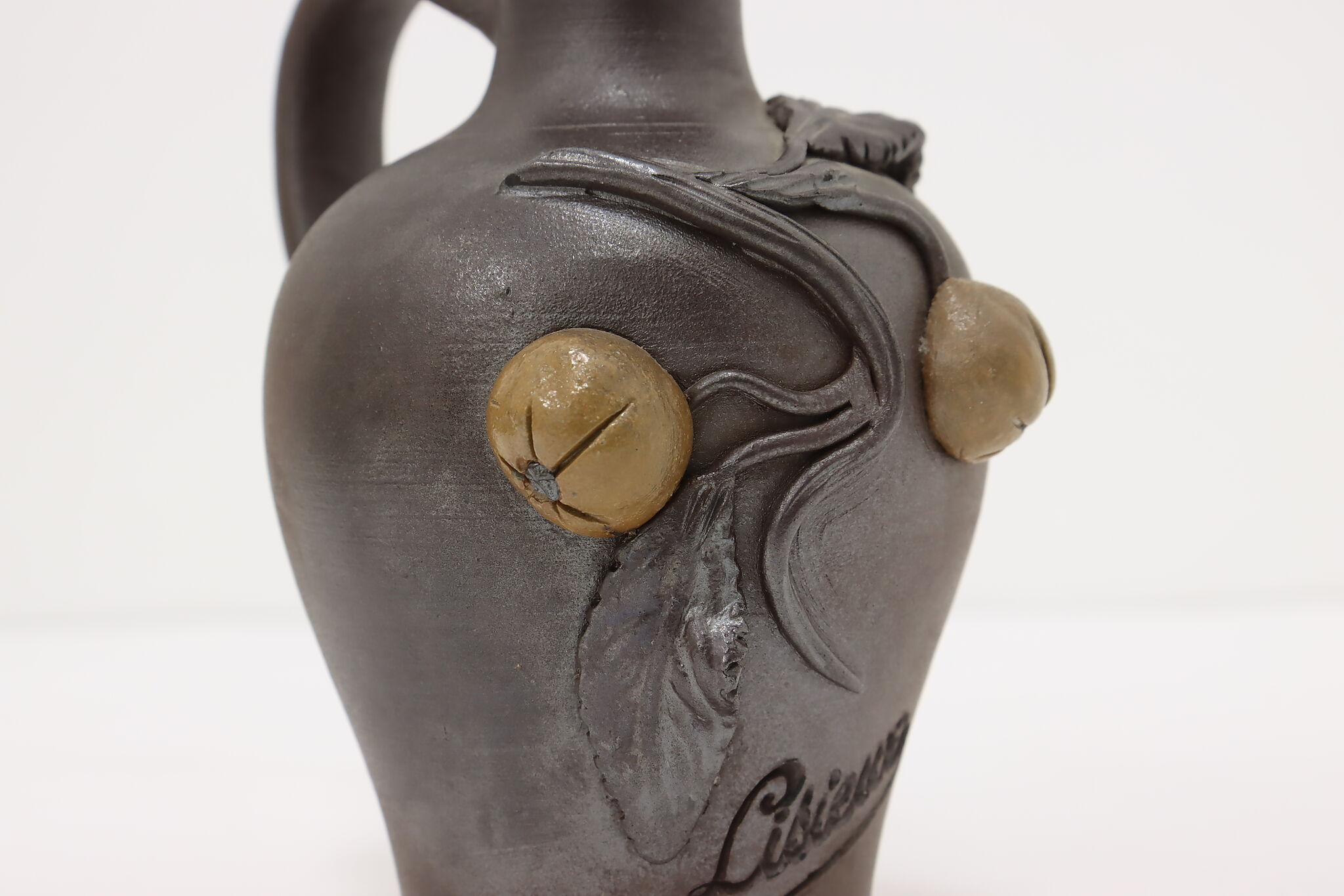 This fabulous pottery jug or vase with details of leaves and apples was made in Lisieux, France in the Normandy region.