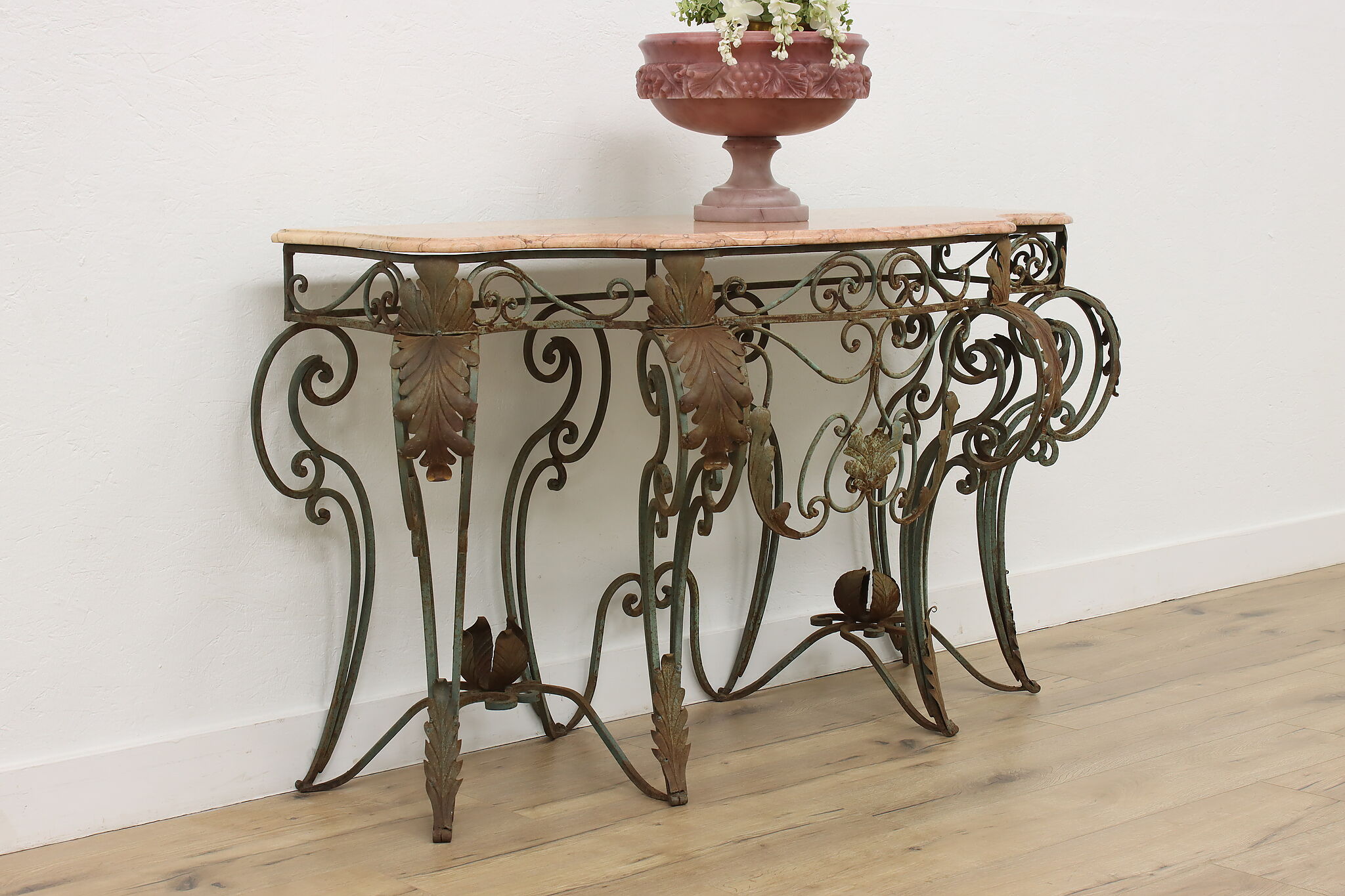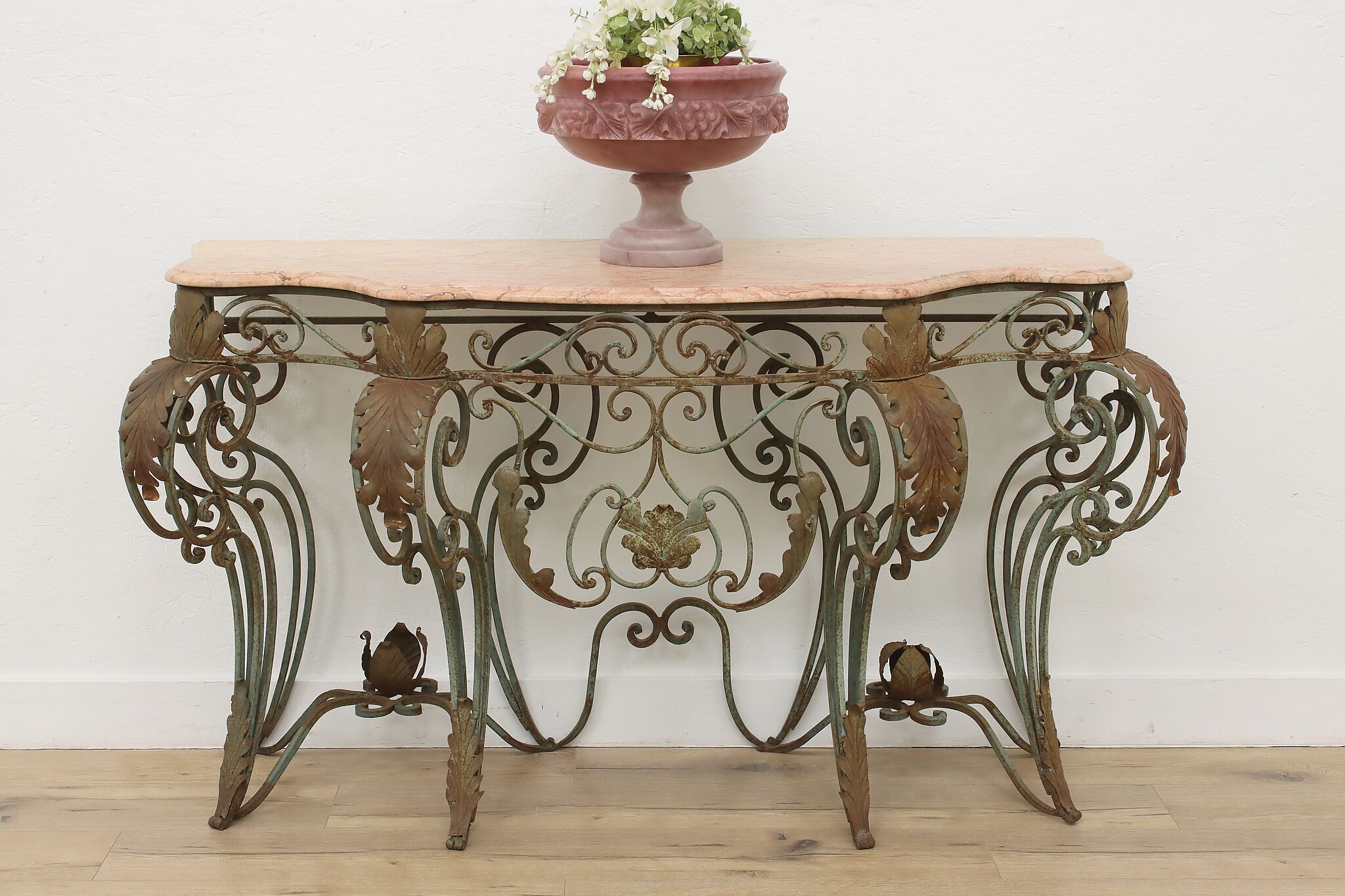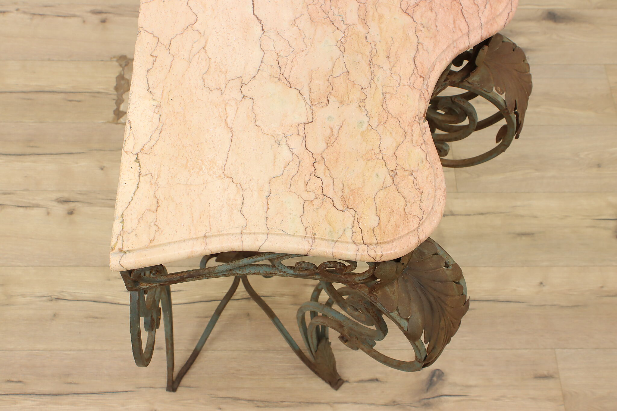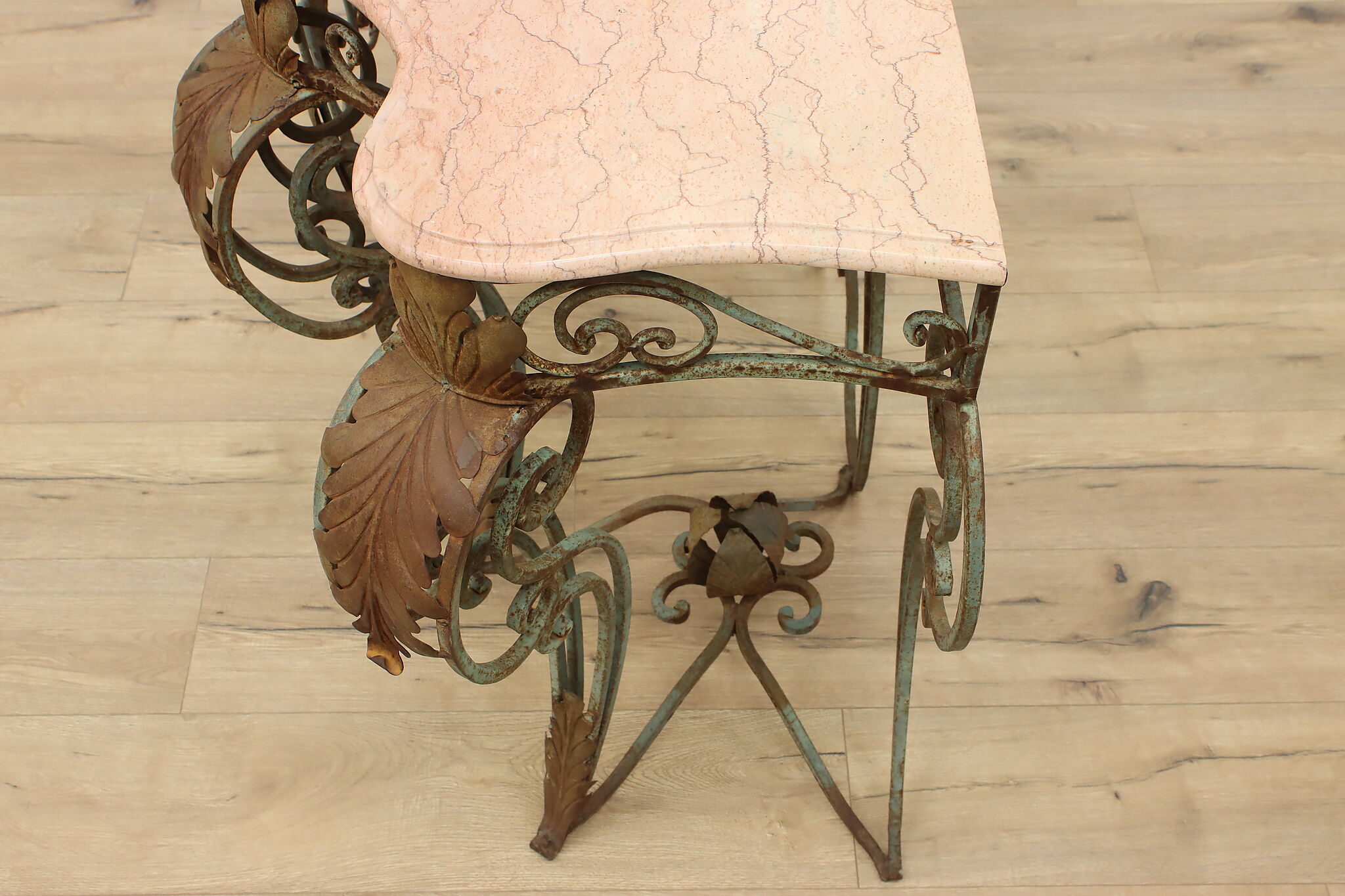 This charming French sofa or hall console has a gorgeous rose marble top that adds color and beauty to your living space.