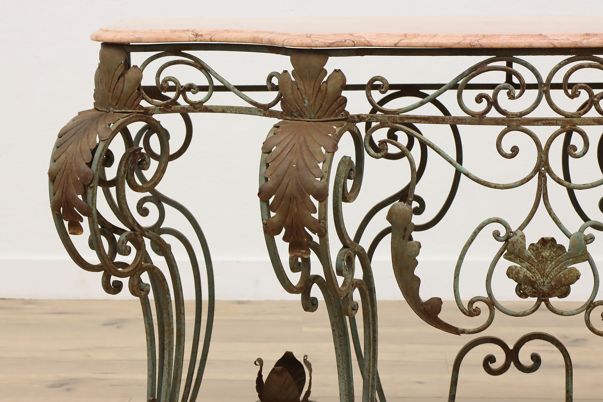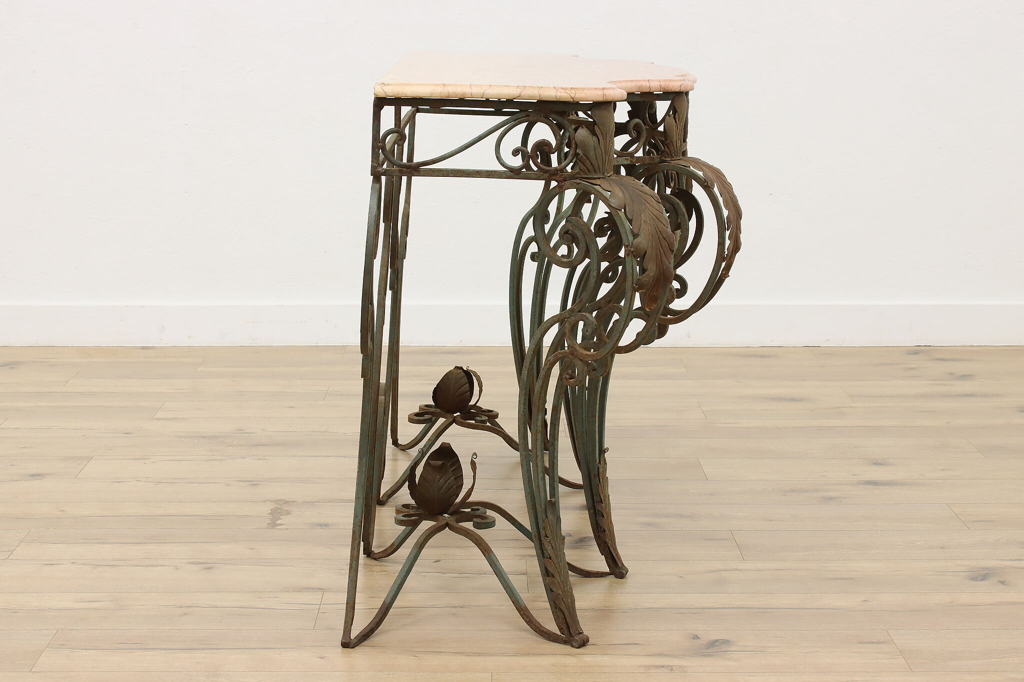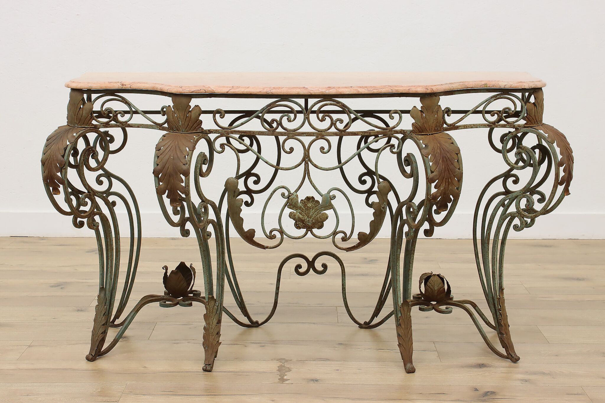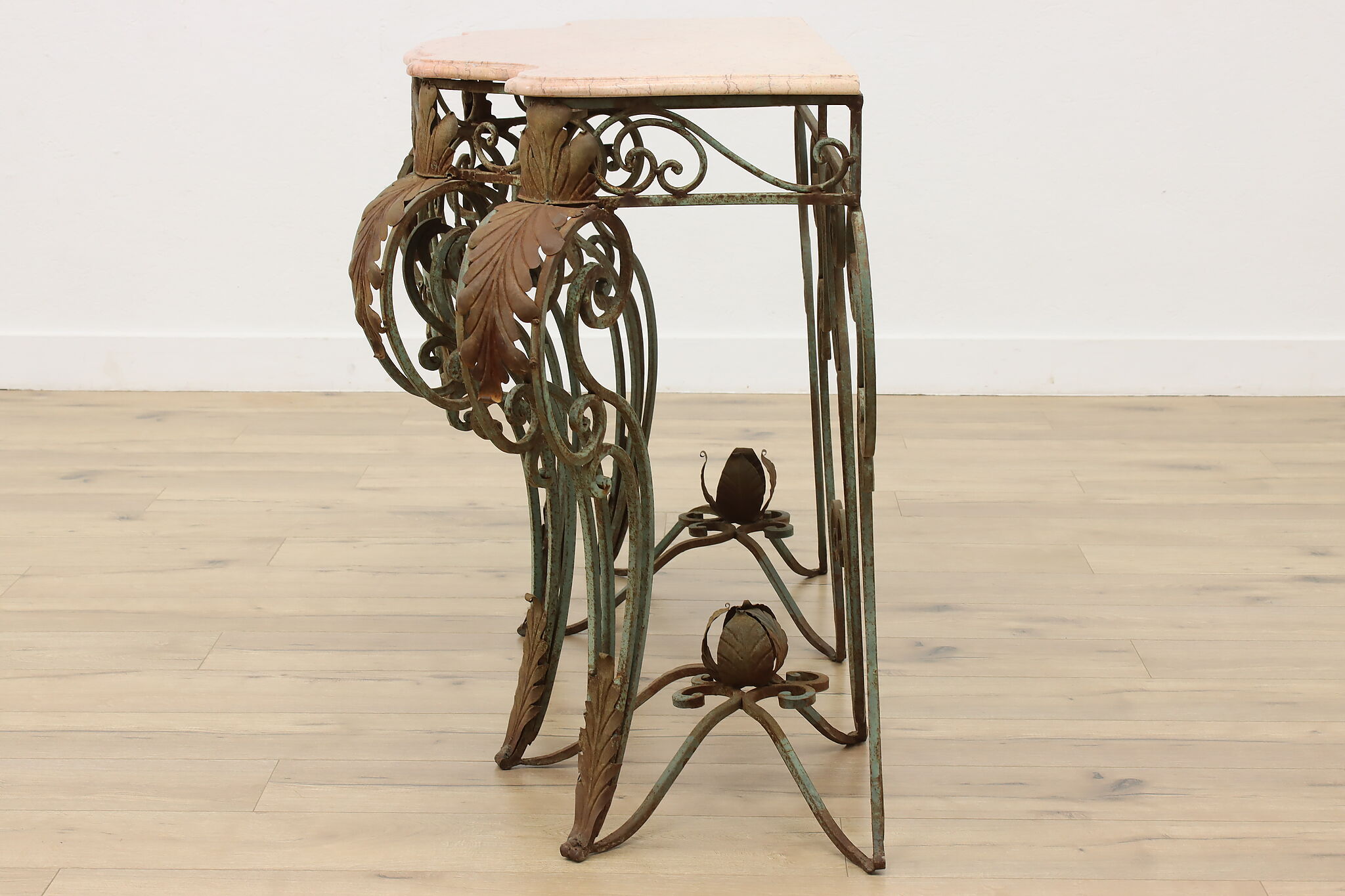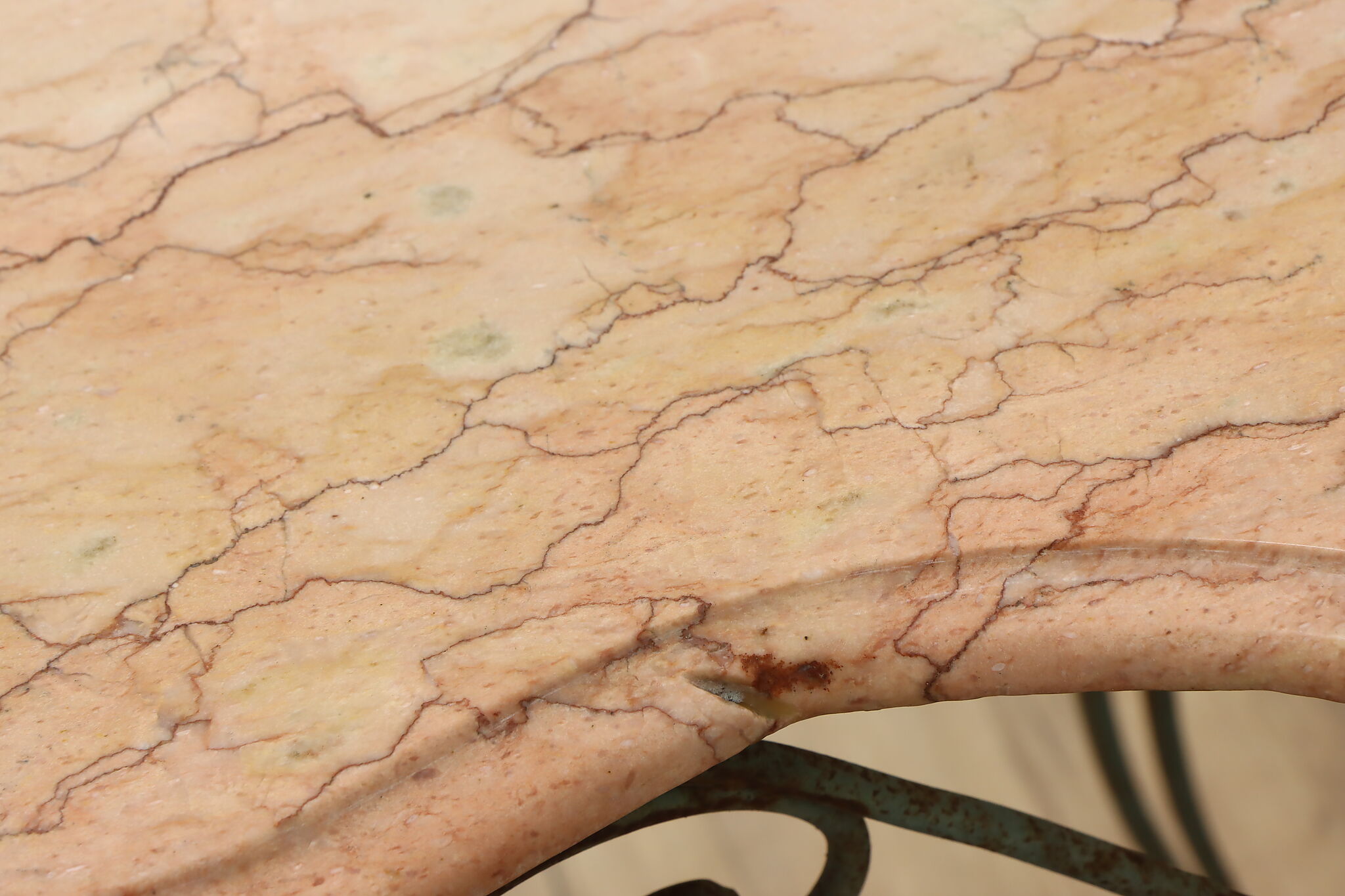This charming French sofa or hall console has a gorgeous rose marble top that adds color and beauty to your living space.