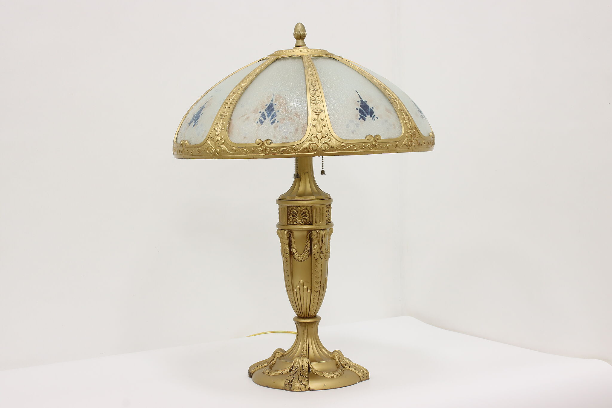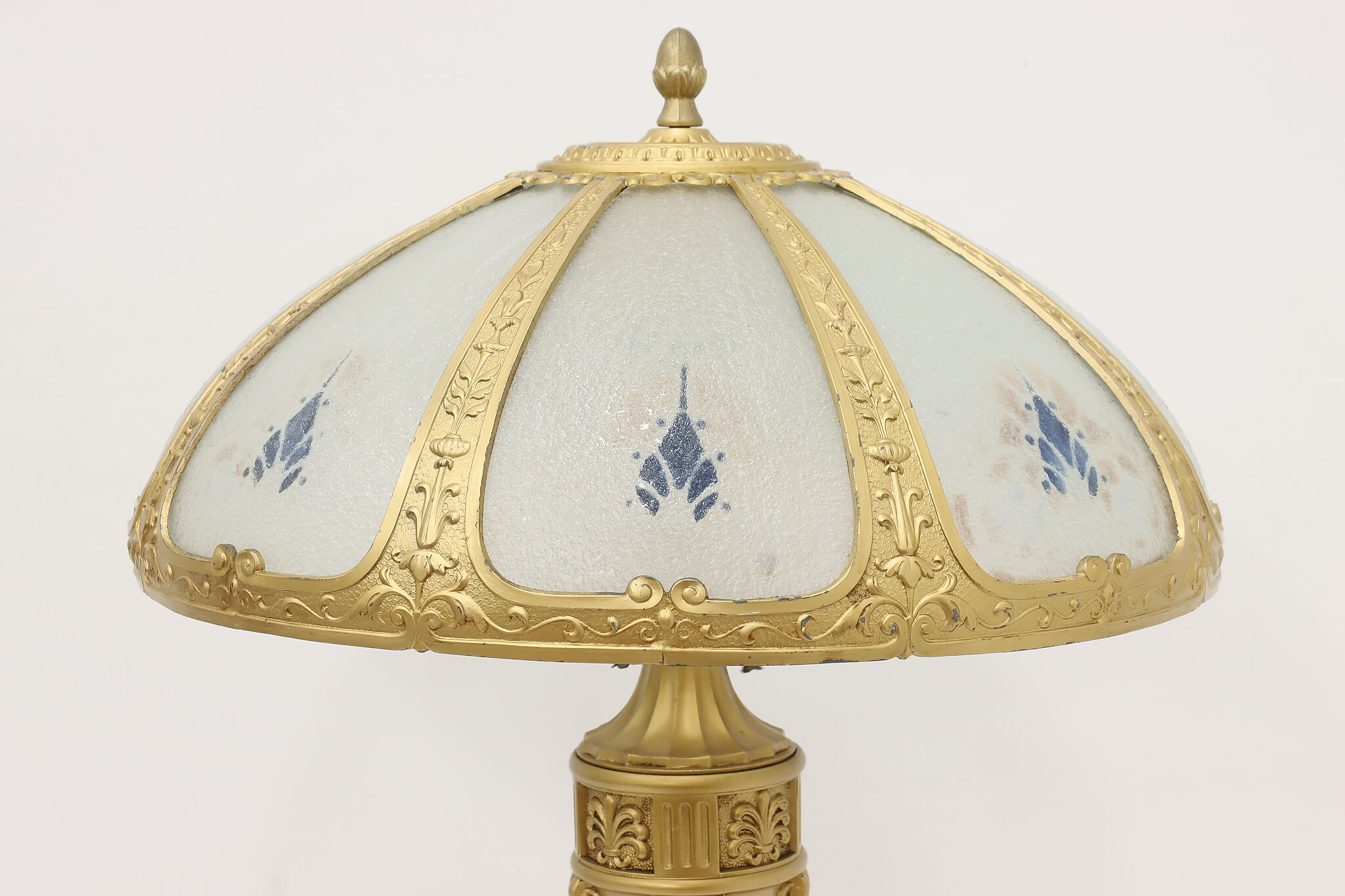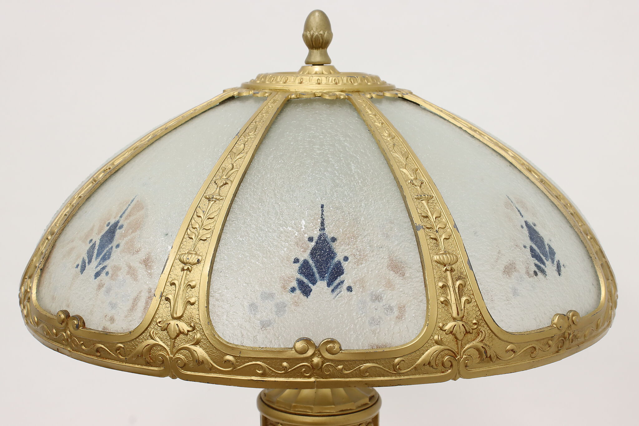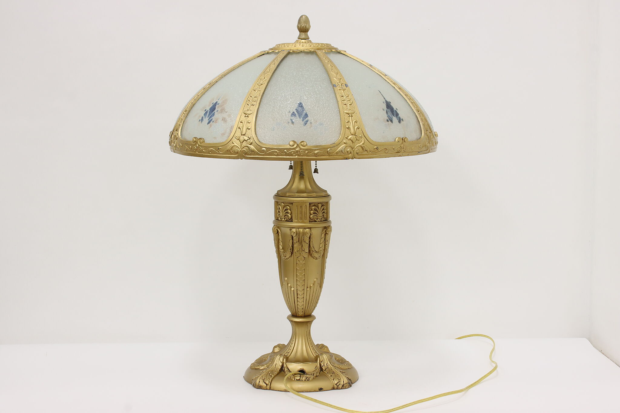Placed in a library or office, this Art Deco lamp has a gorgeous "hammered" curved glass shade with reverse painted patterns, complemented by the bright gold finish.