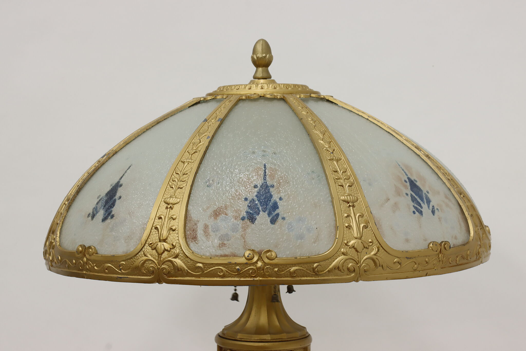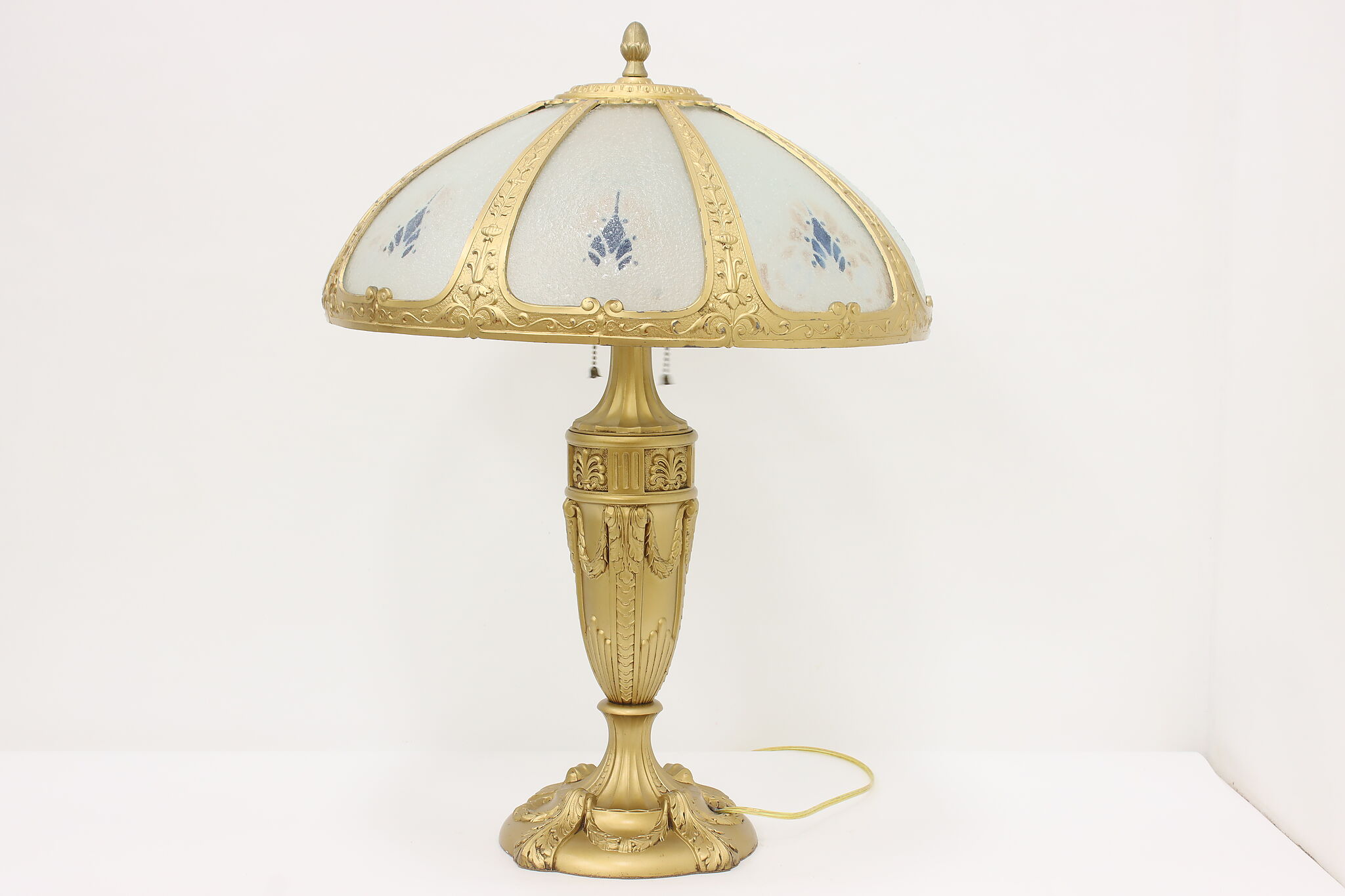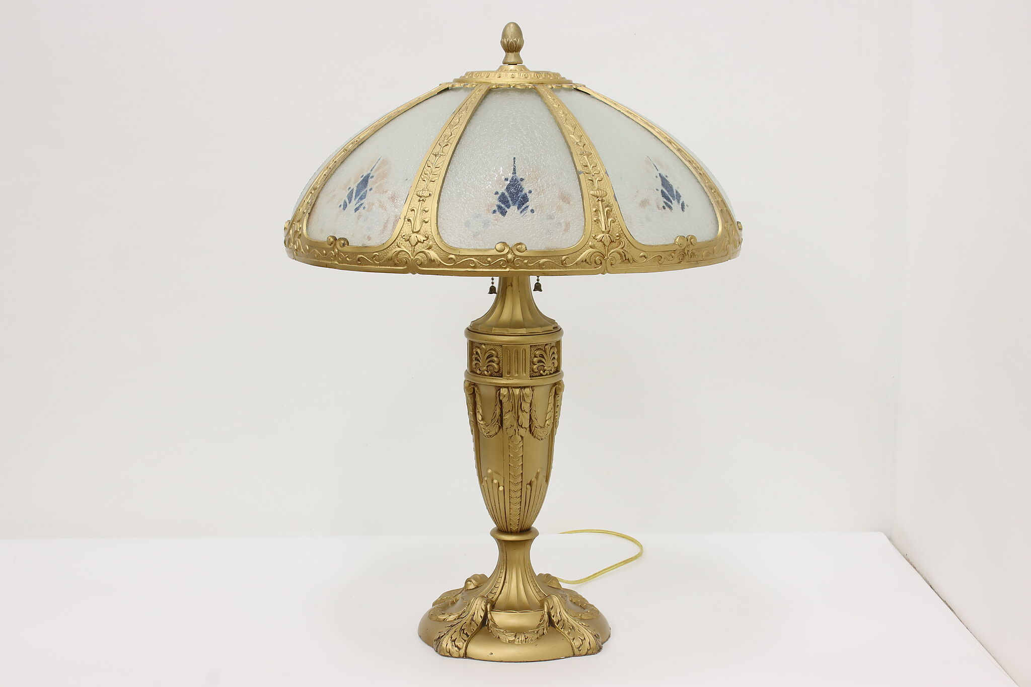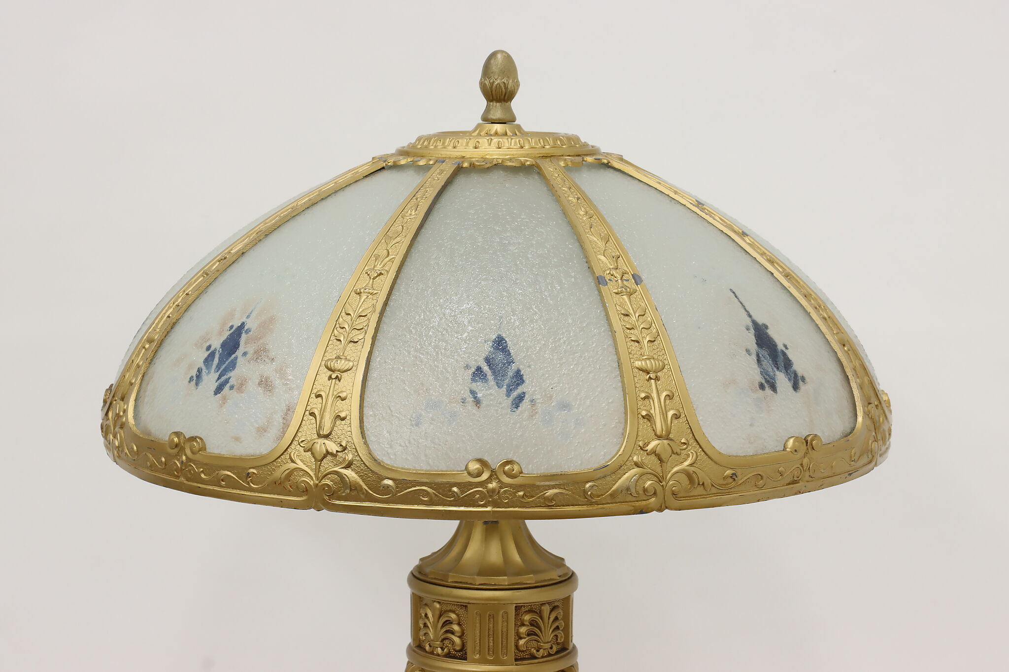 Placed in a library or office, this Art Deco lamp has a gorgeous "hammered" curved glass shade with reverse painted patterns, complemented by the bright gold finish.