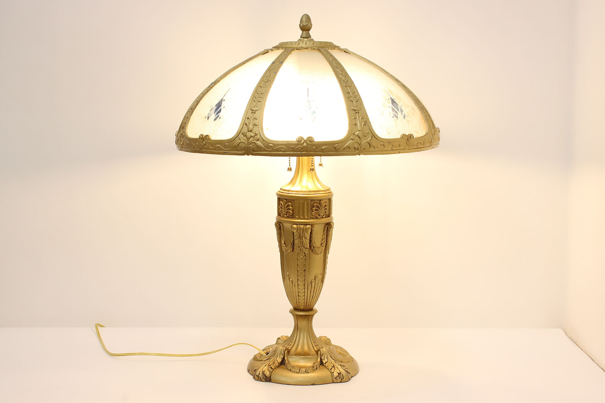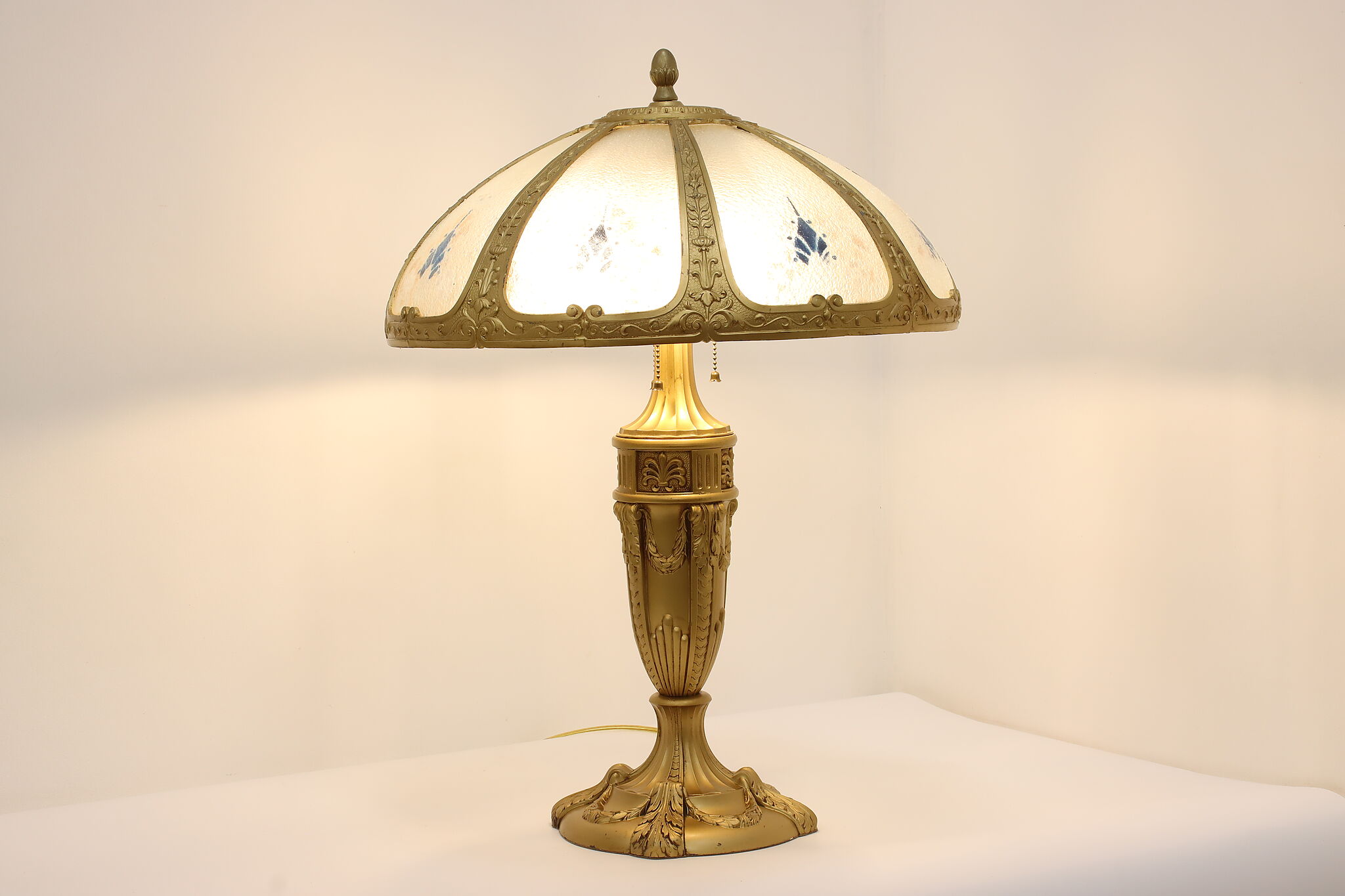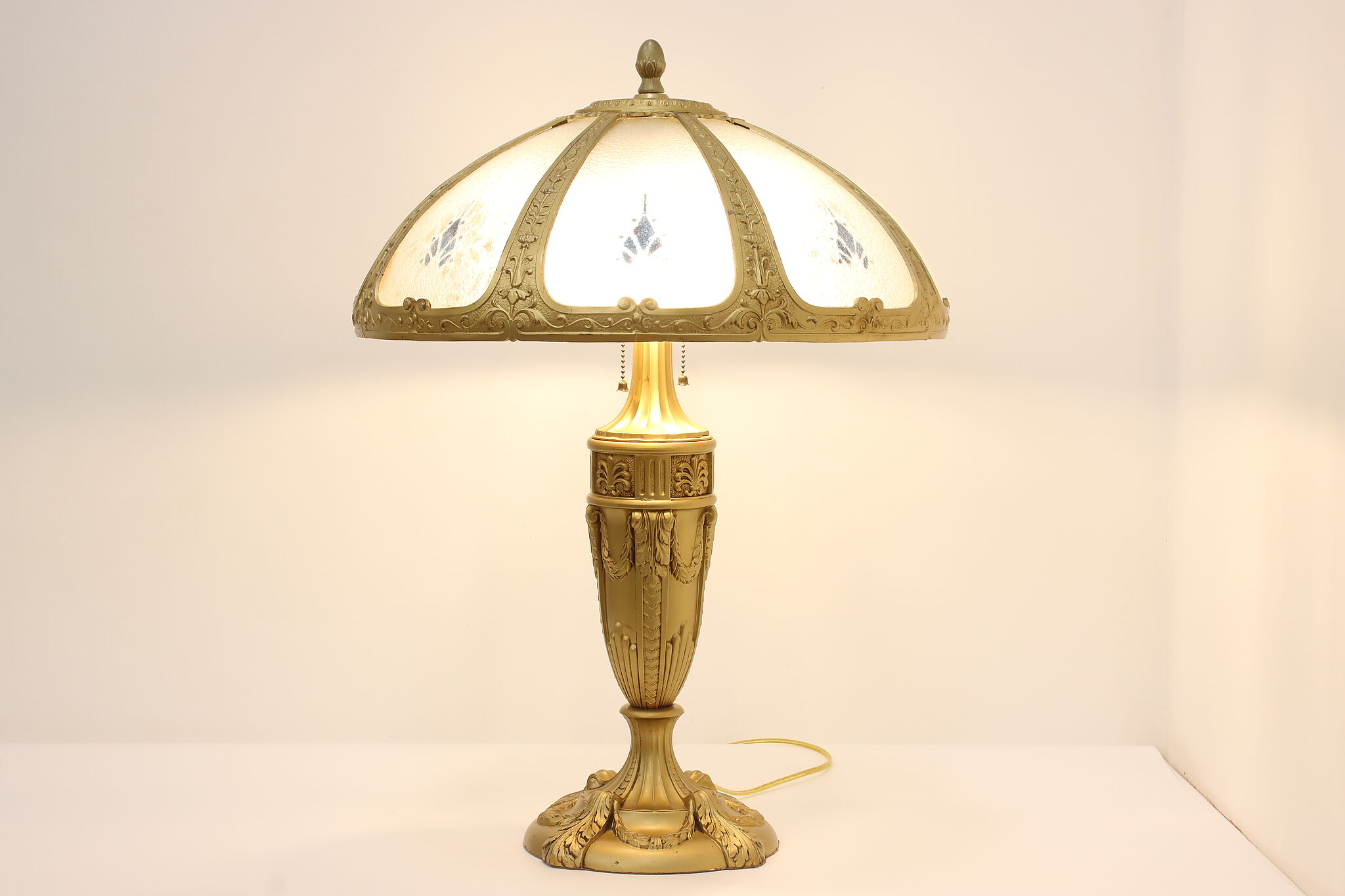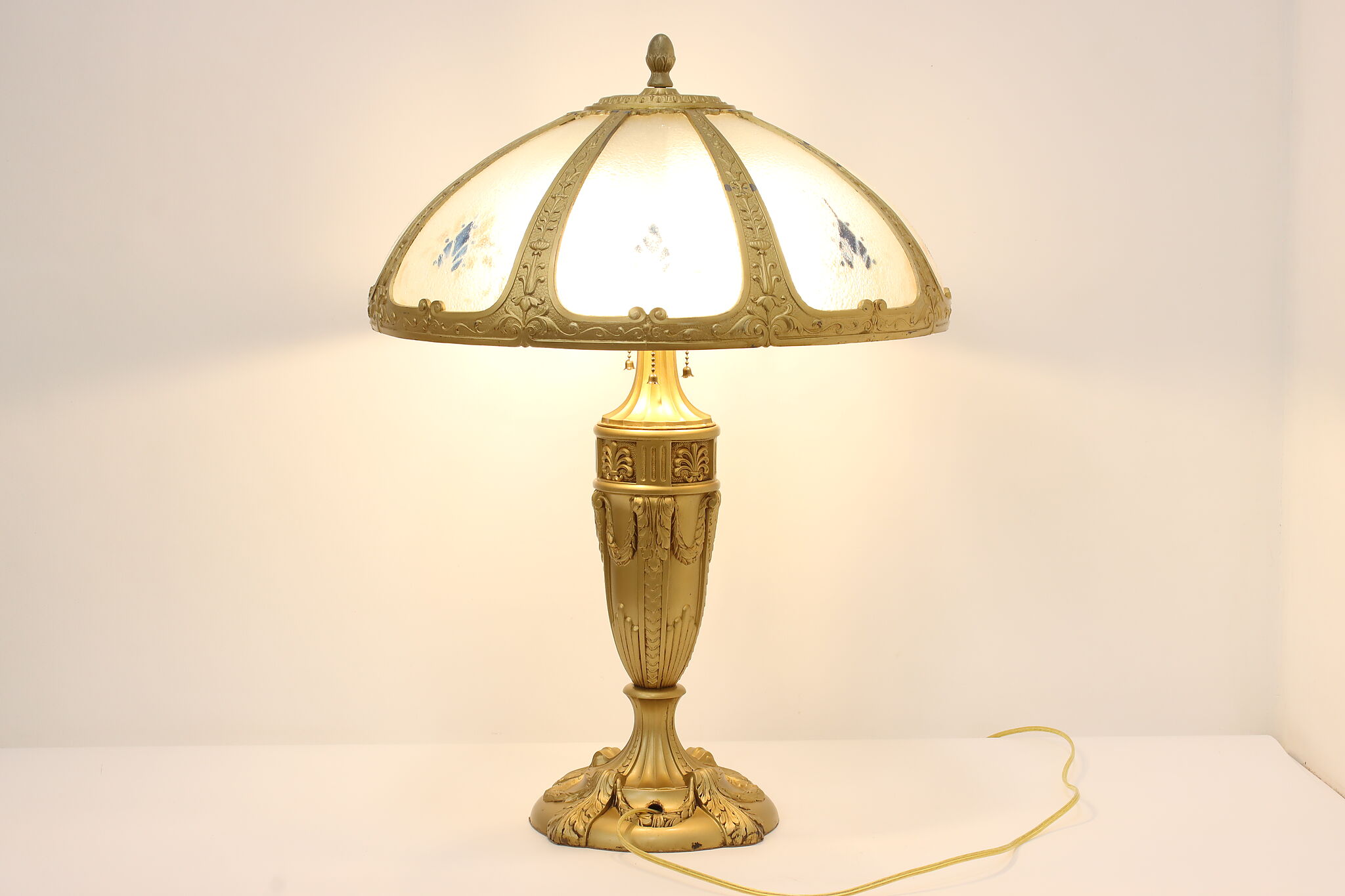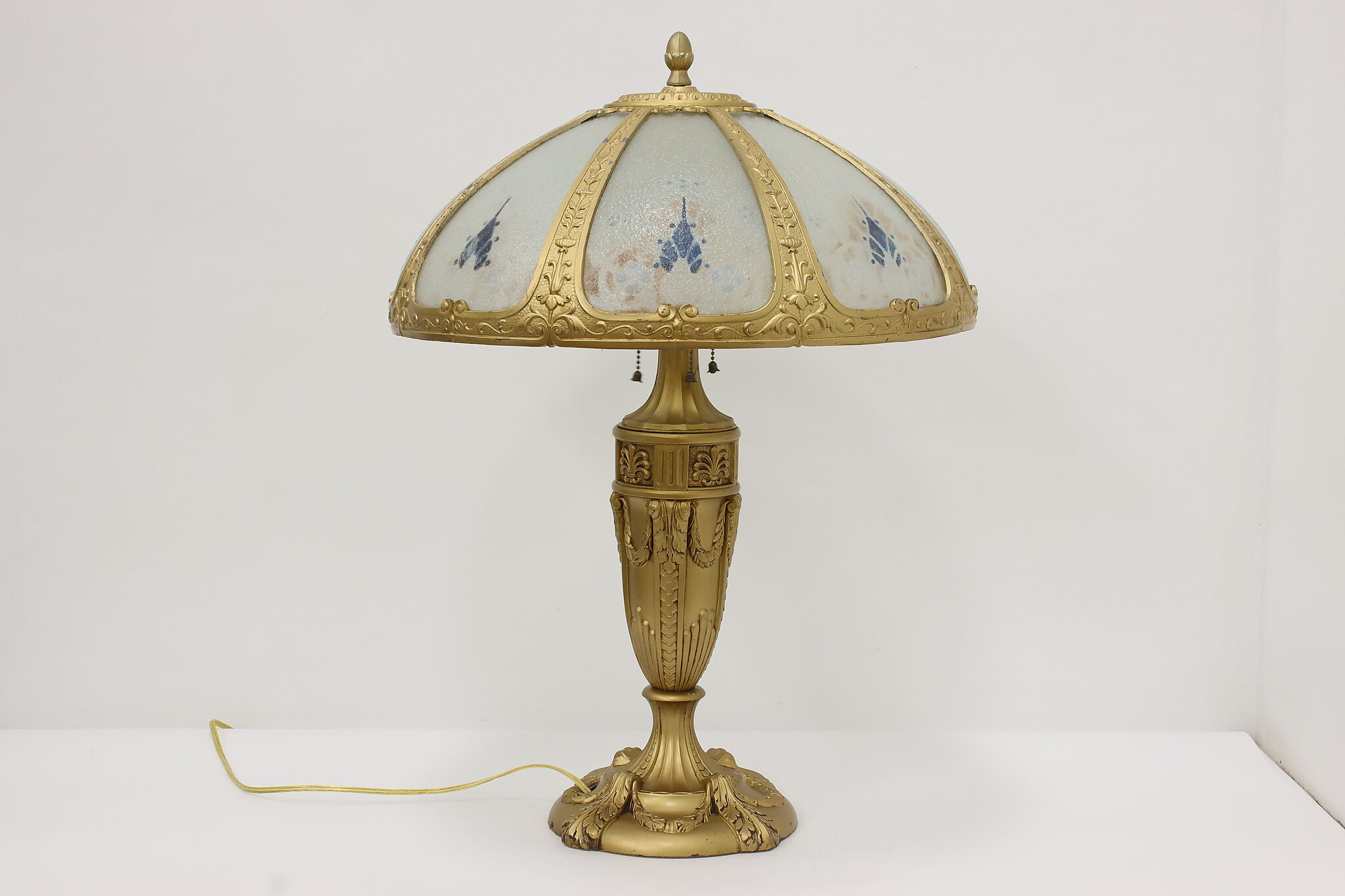 Placed in a library or office, this Art Deco lamp has a gorgeous "hammered" curved glass shade with reverse painted patterns, complemented by the bright gold finish.