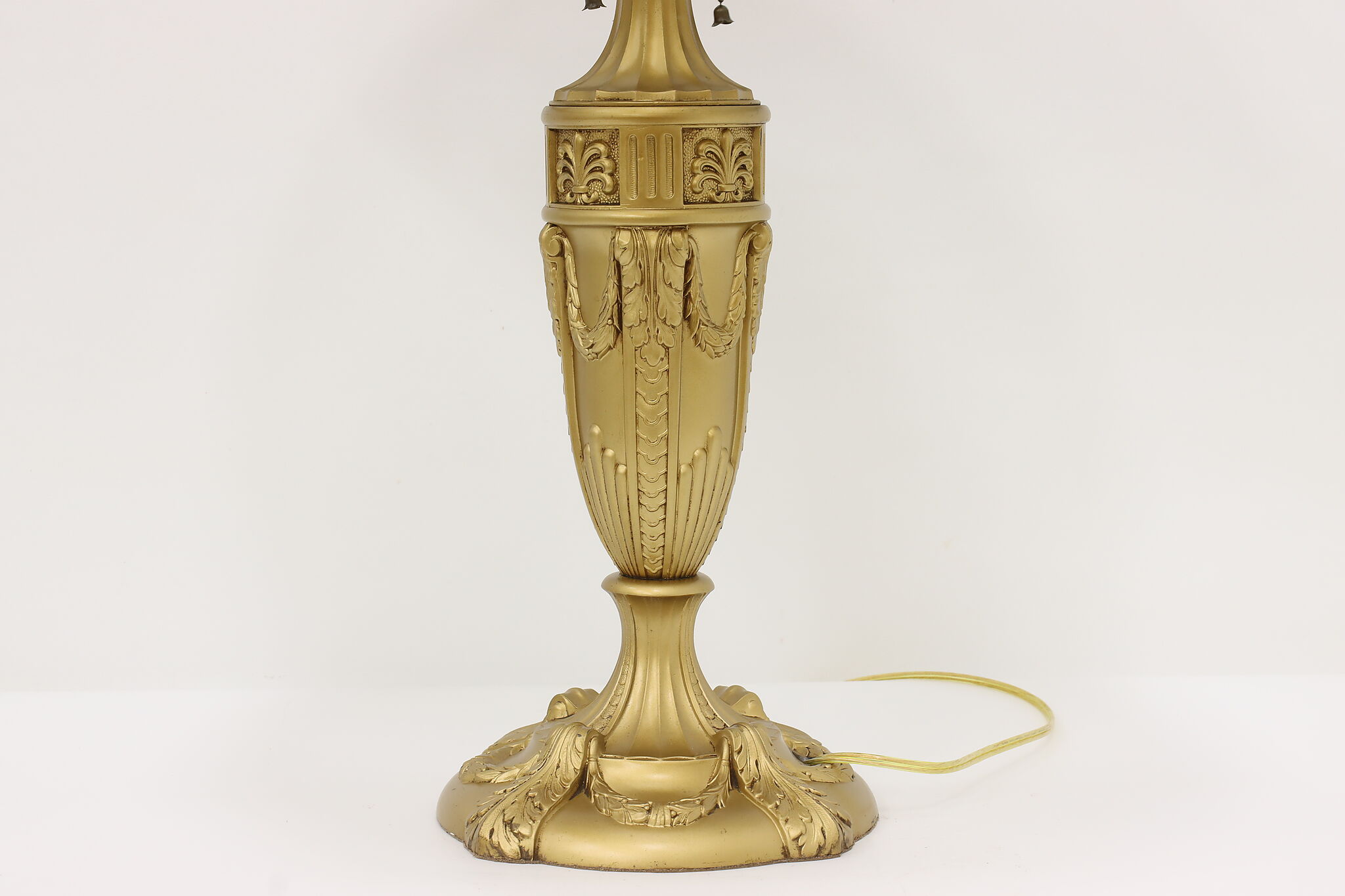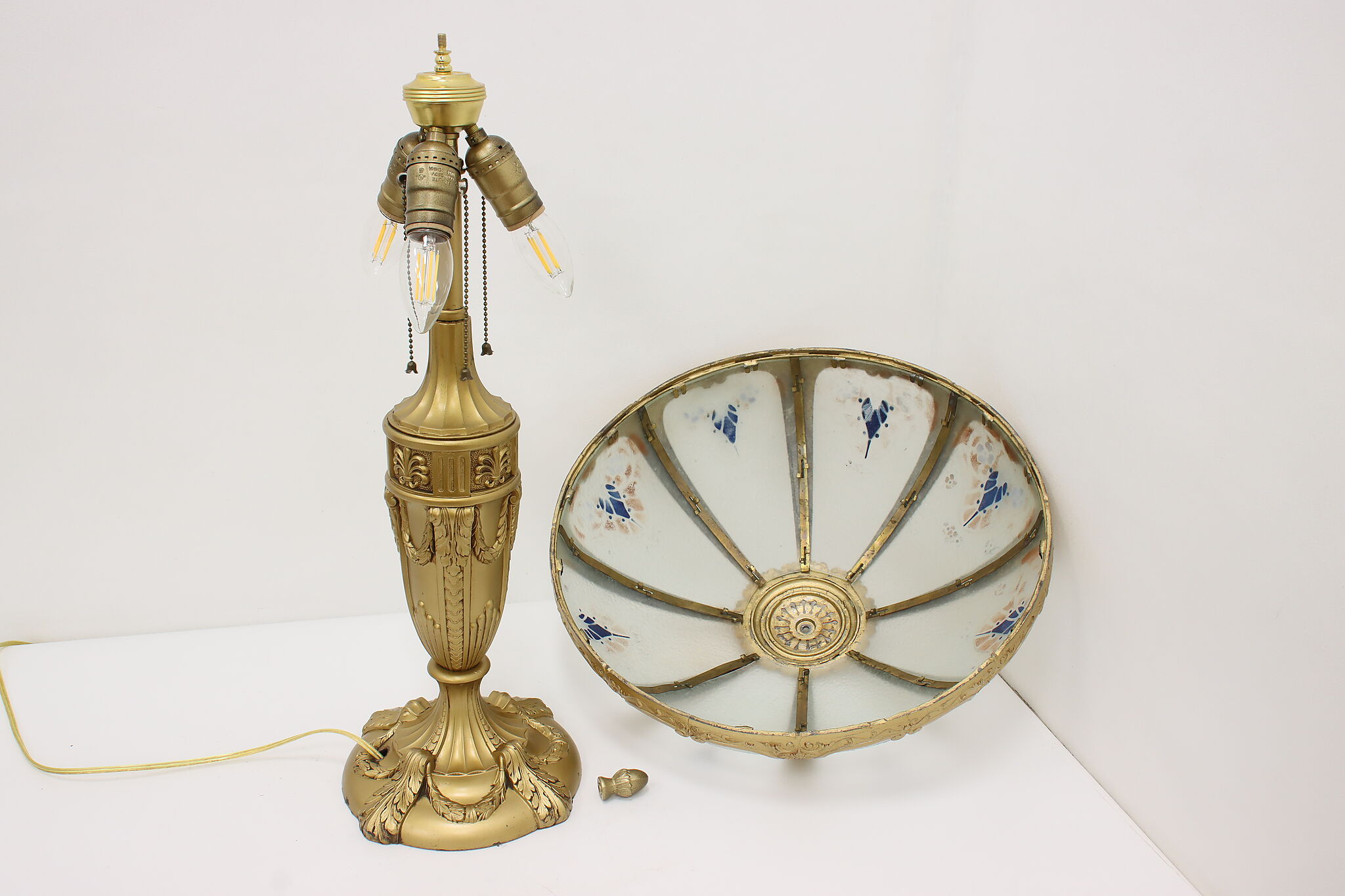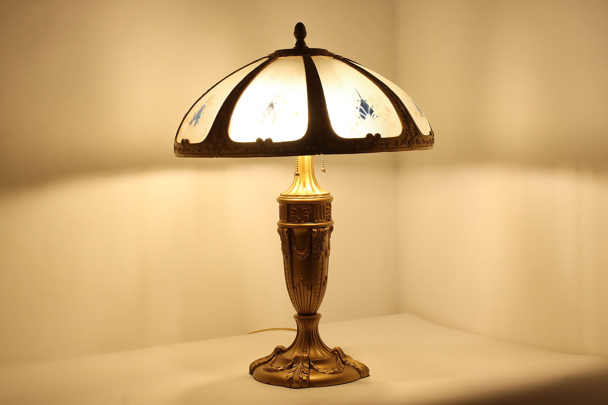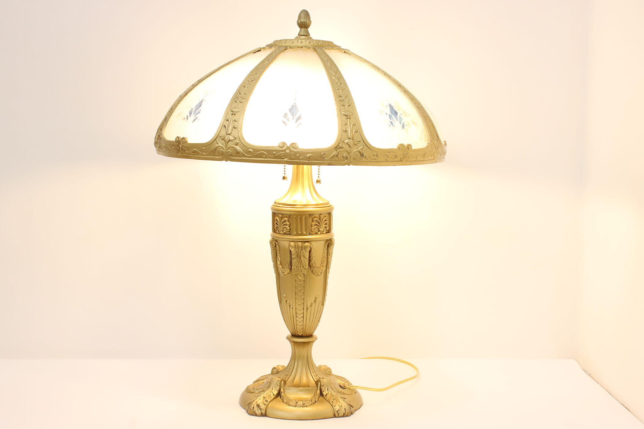 Placed in a library or office, this Art Deco lamp has a gorgeous "hammered" curved glass shade with reverse painted patterns, complemented by the bright gold finish.