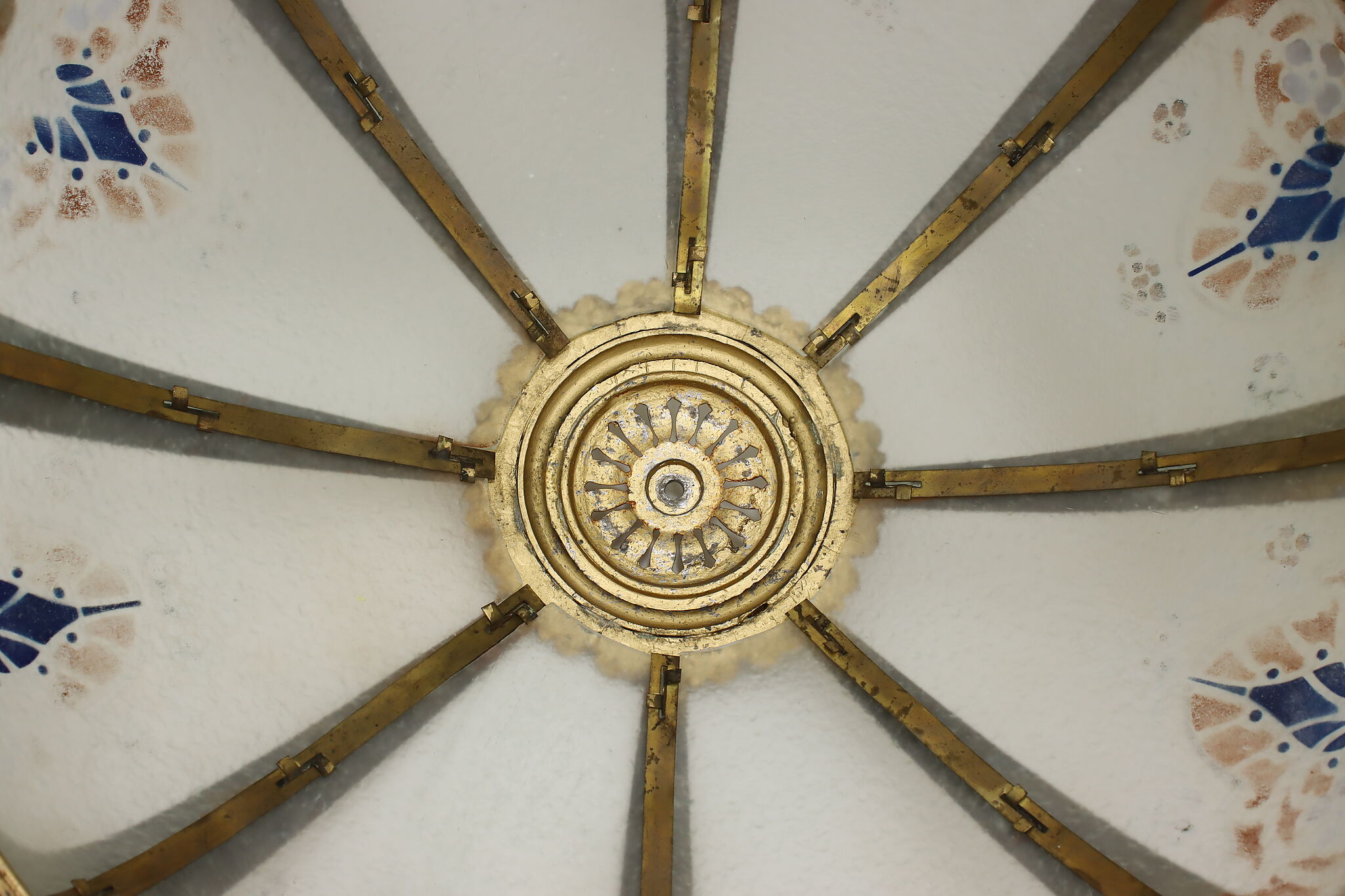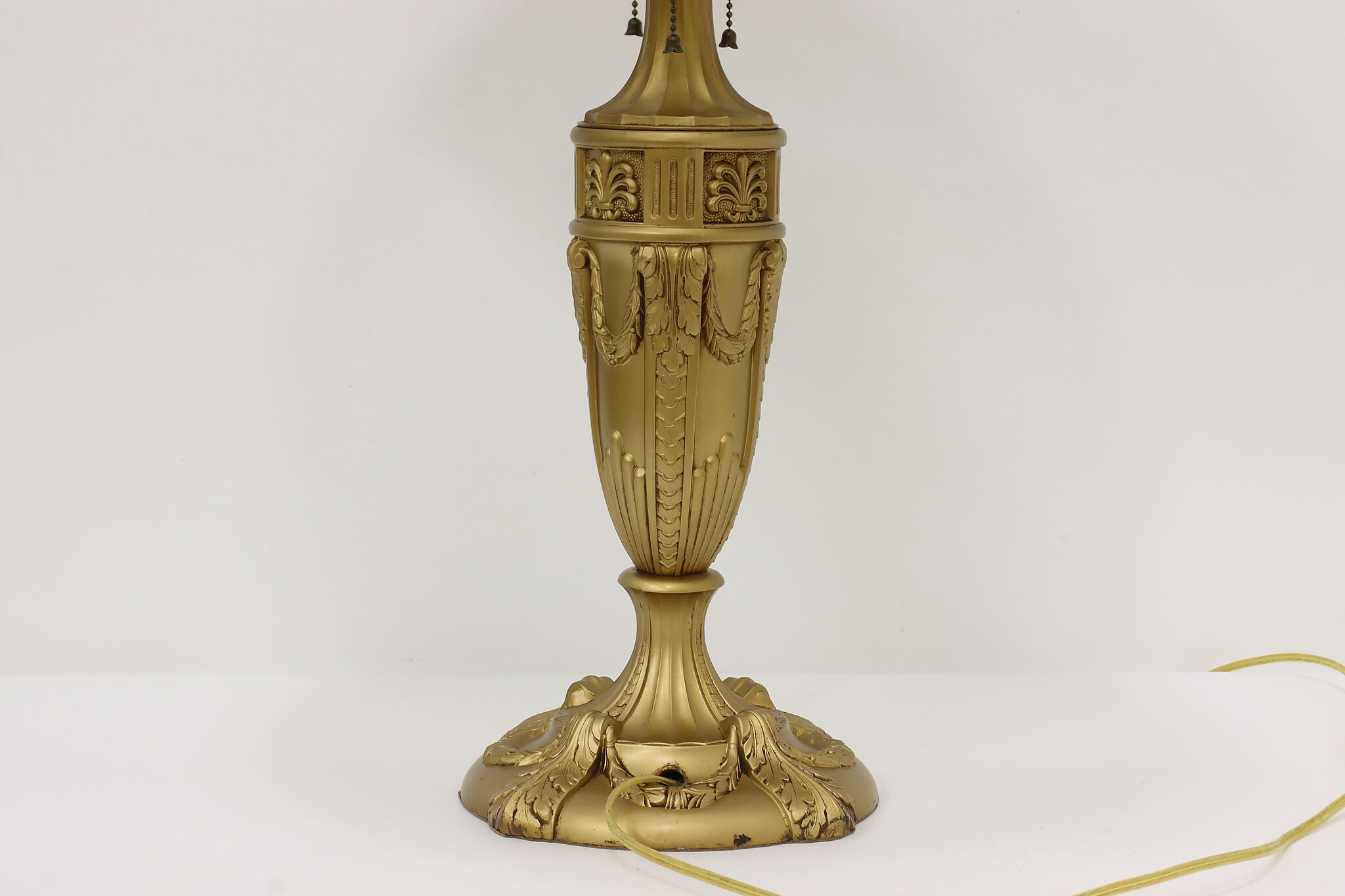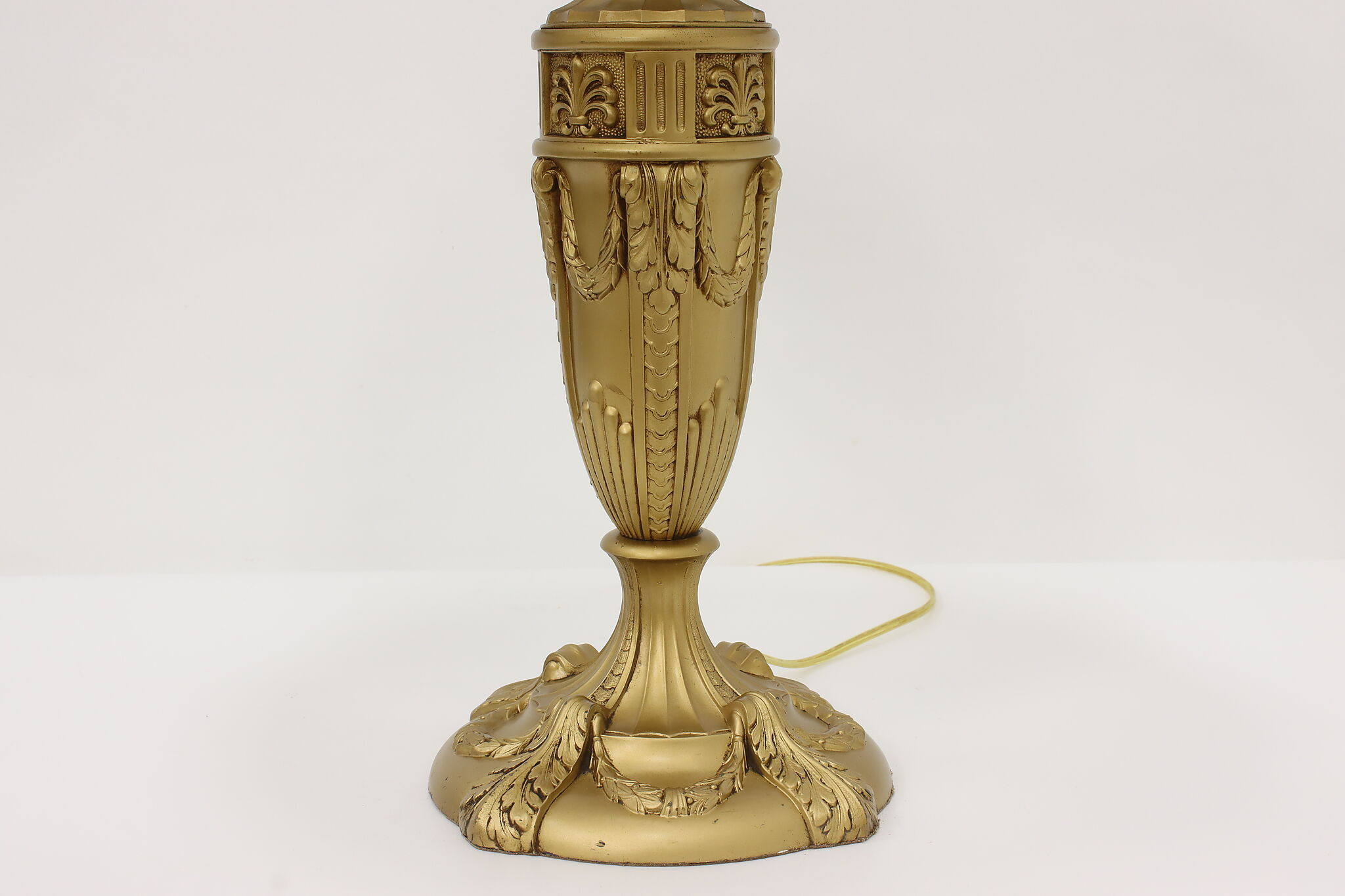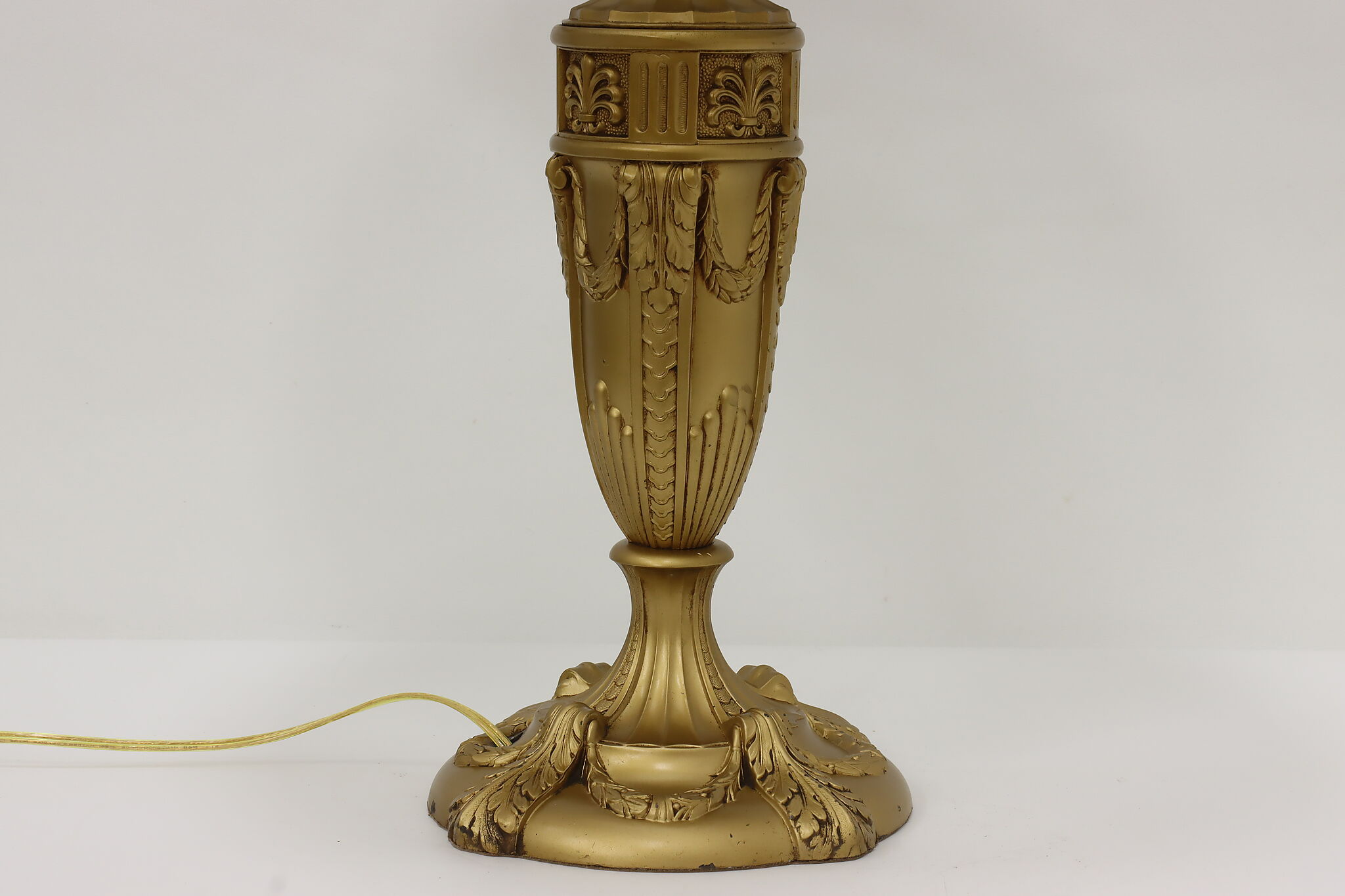 Placed in a library or office, this Art Deco lamp has a gorgeous "hammered" curved glass shade with reverse painted patterns, complemented by the bright gold finish.