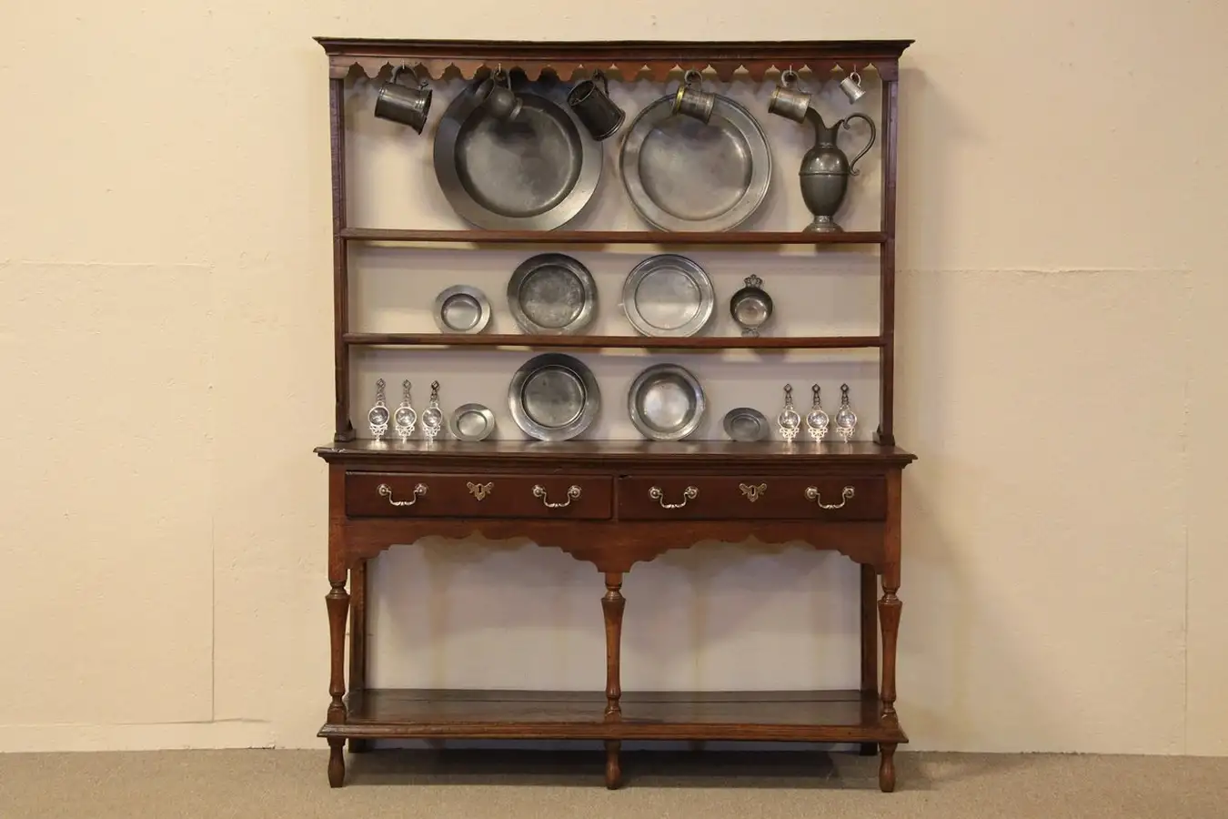 An authentic Georgian Welsh dresser or pewter cupboard was hand-crafted about 1760 of solid oak. This charming country antique has lots of character - stains, wear, splits, repairs and warps, to be expected in period furniture of the era.
