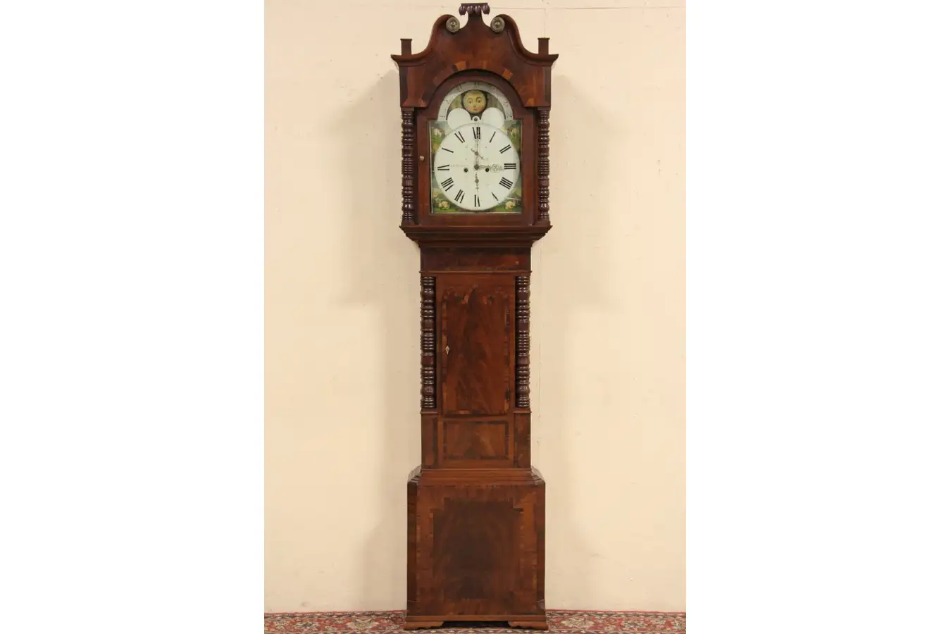 An authentic Georgian period tall case or grandfather clock from about 1800 is signed by the maker, "J. G. Bradley of Liverpool," England.