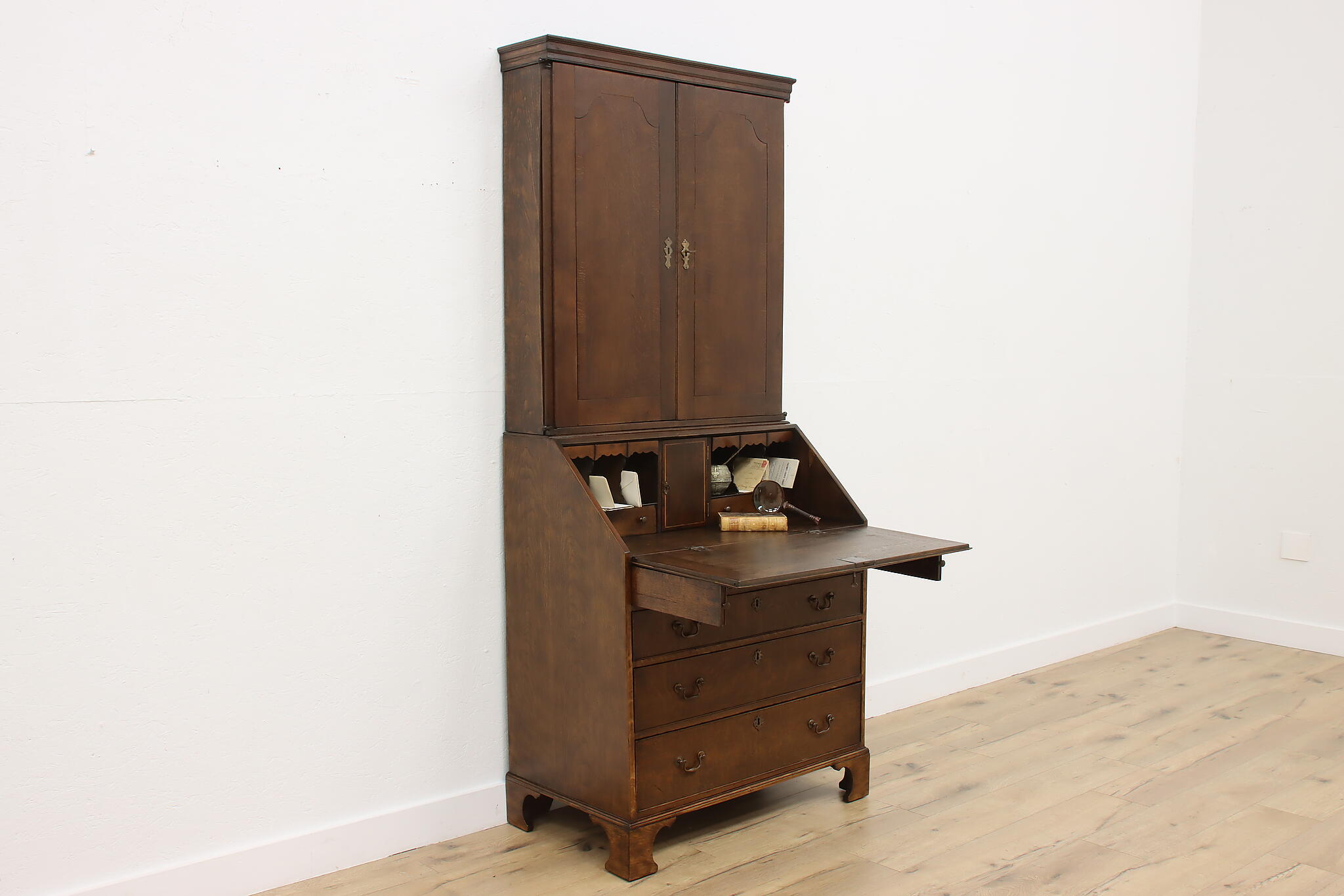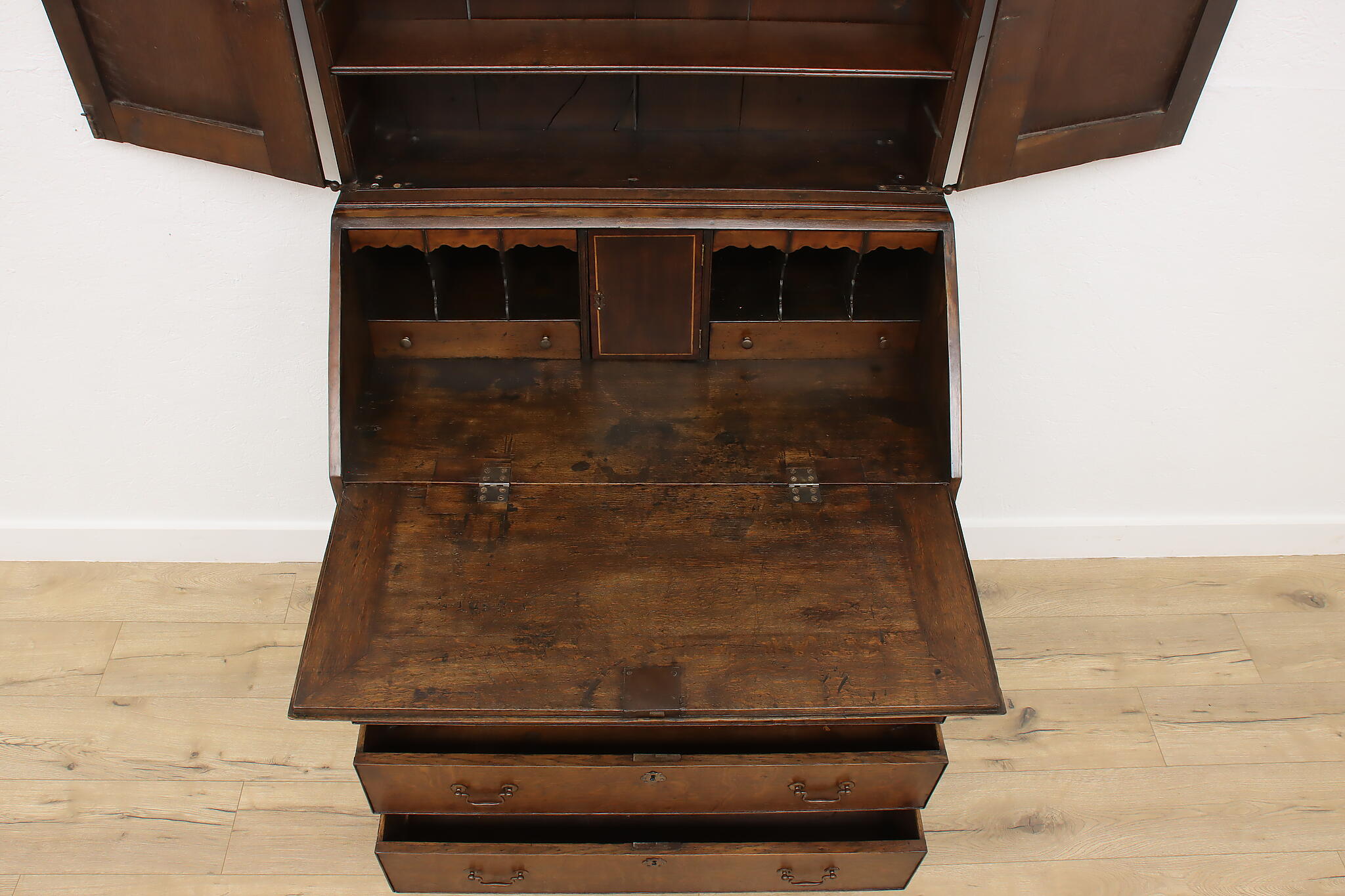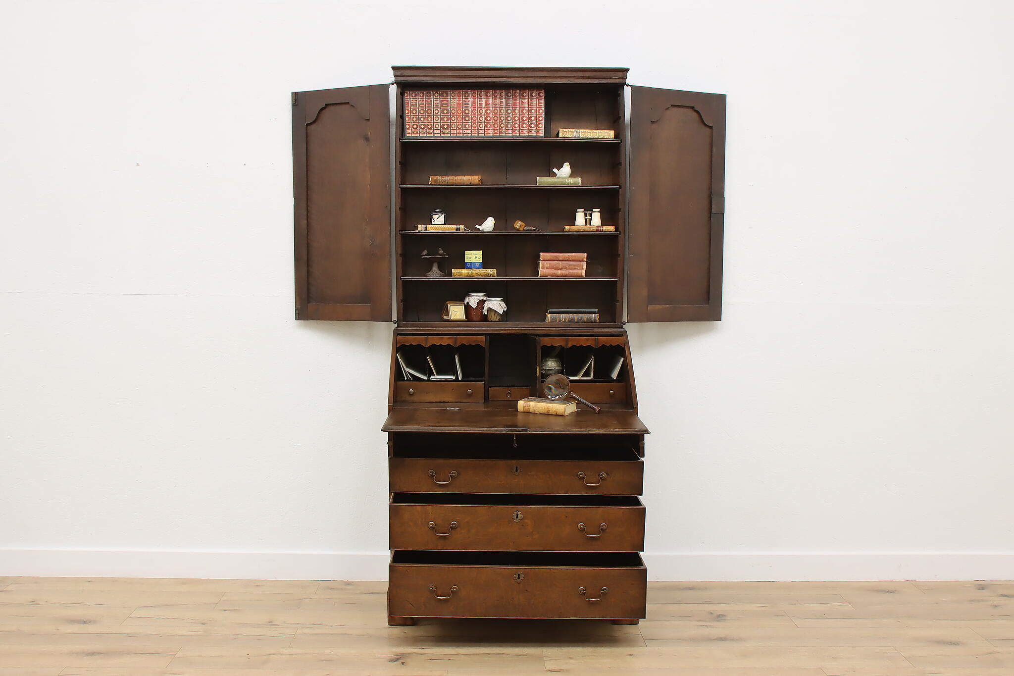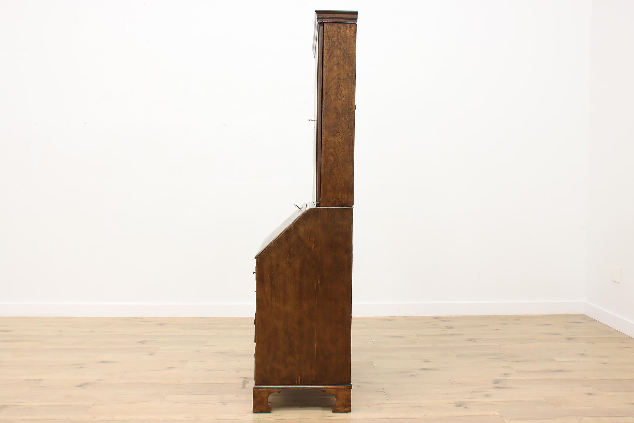 Surviving from the early 1800s, this secretary desk and bookcase was masterfully handcrafted during the English Georgian period.