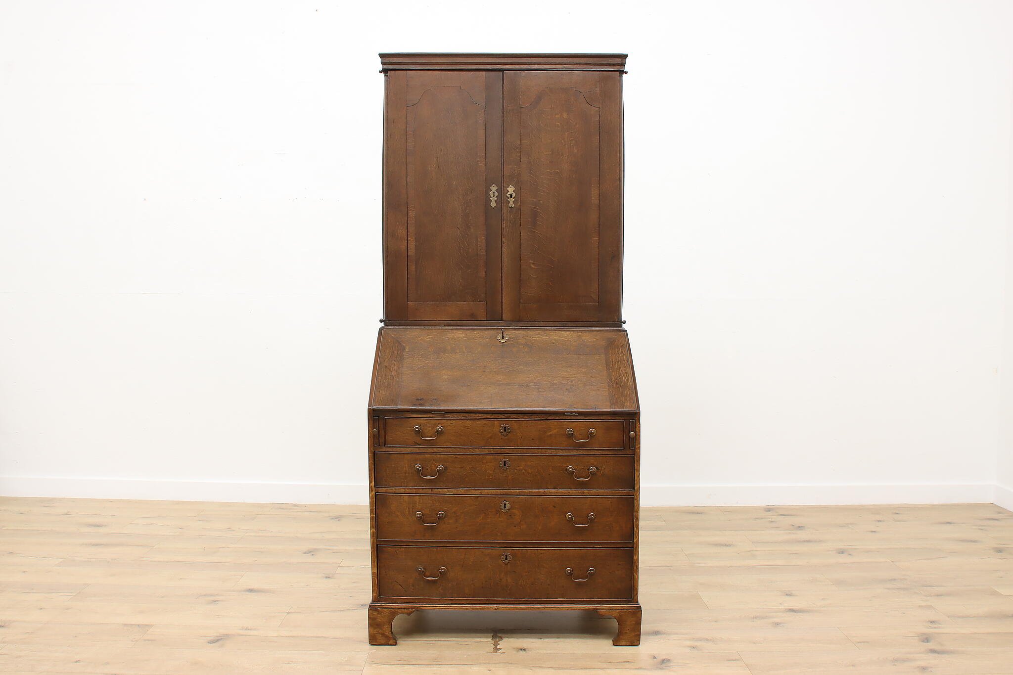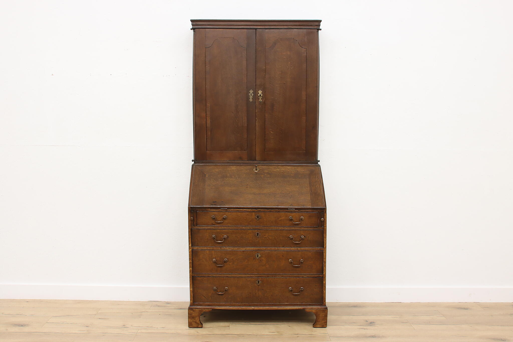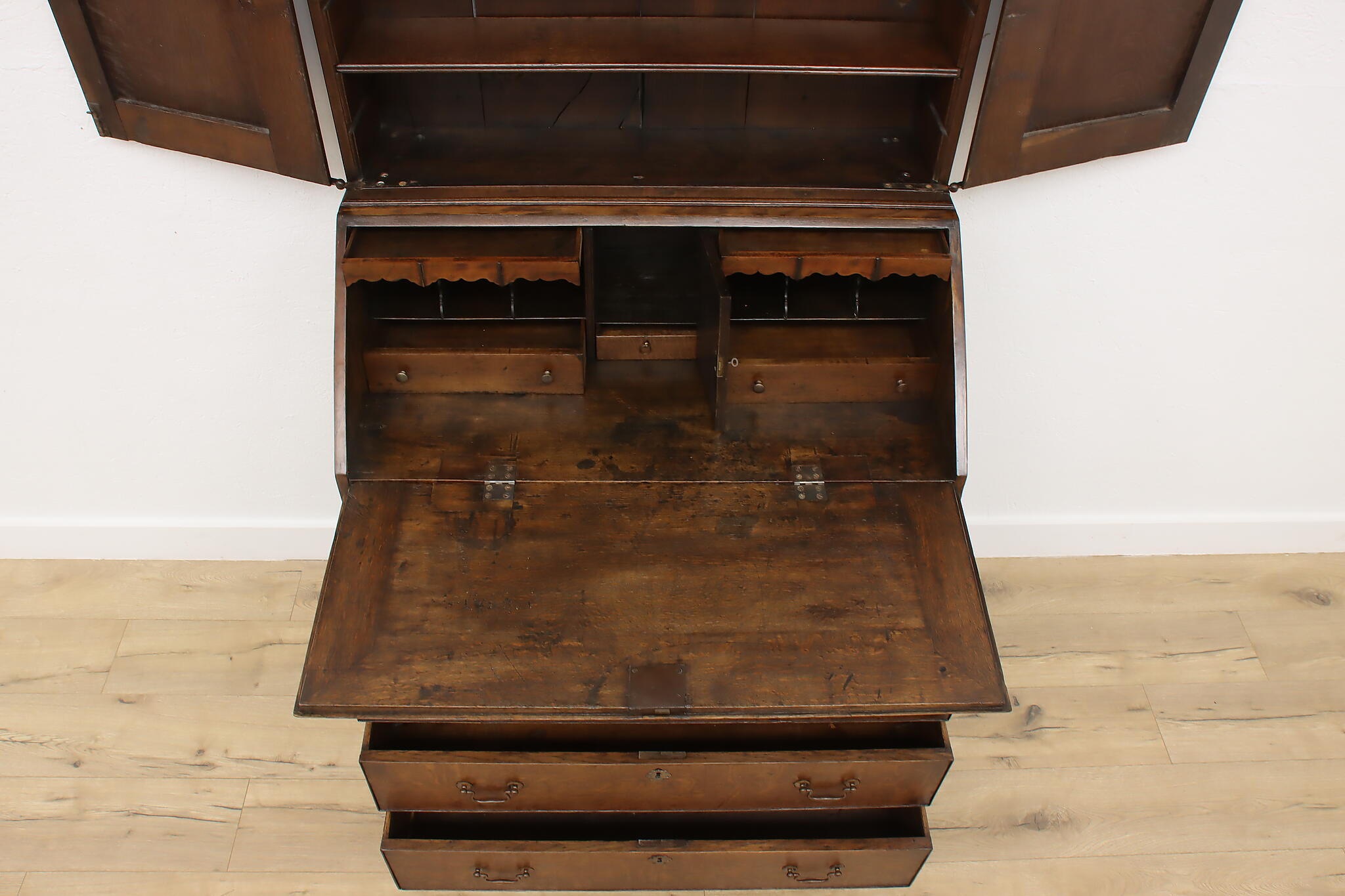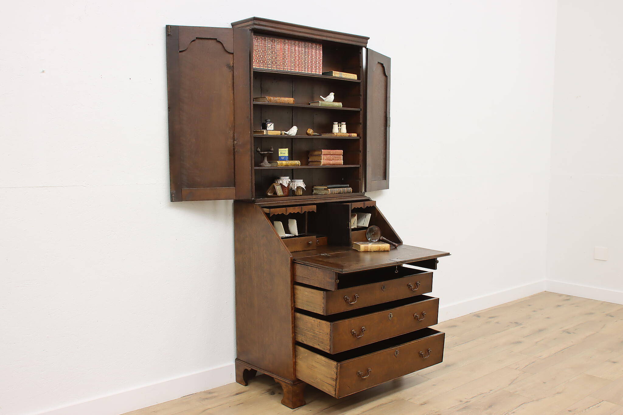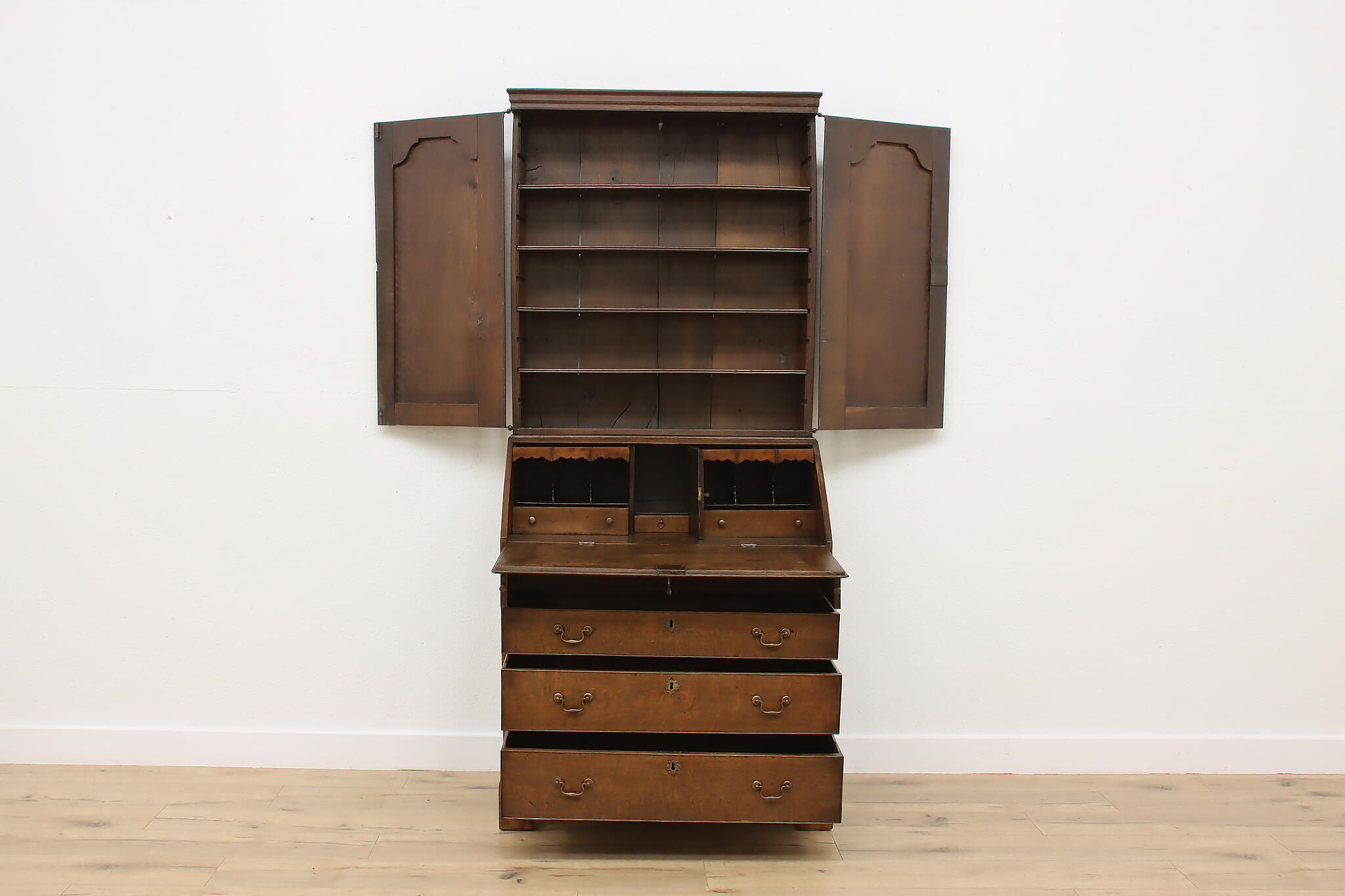 Surviving from the early 1800s, this secretary desk and bookcase was masterfully handcrafted during the English Georgian period.