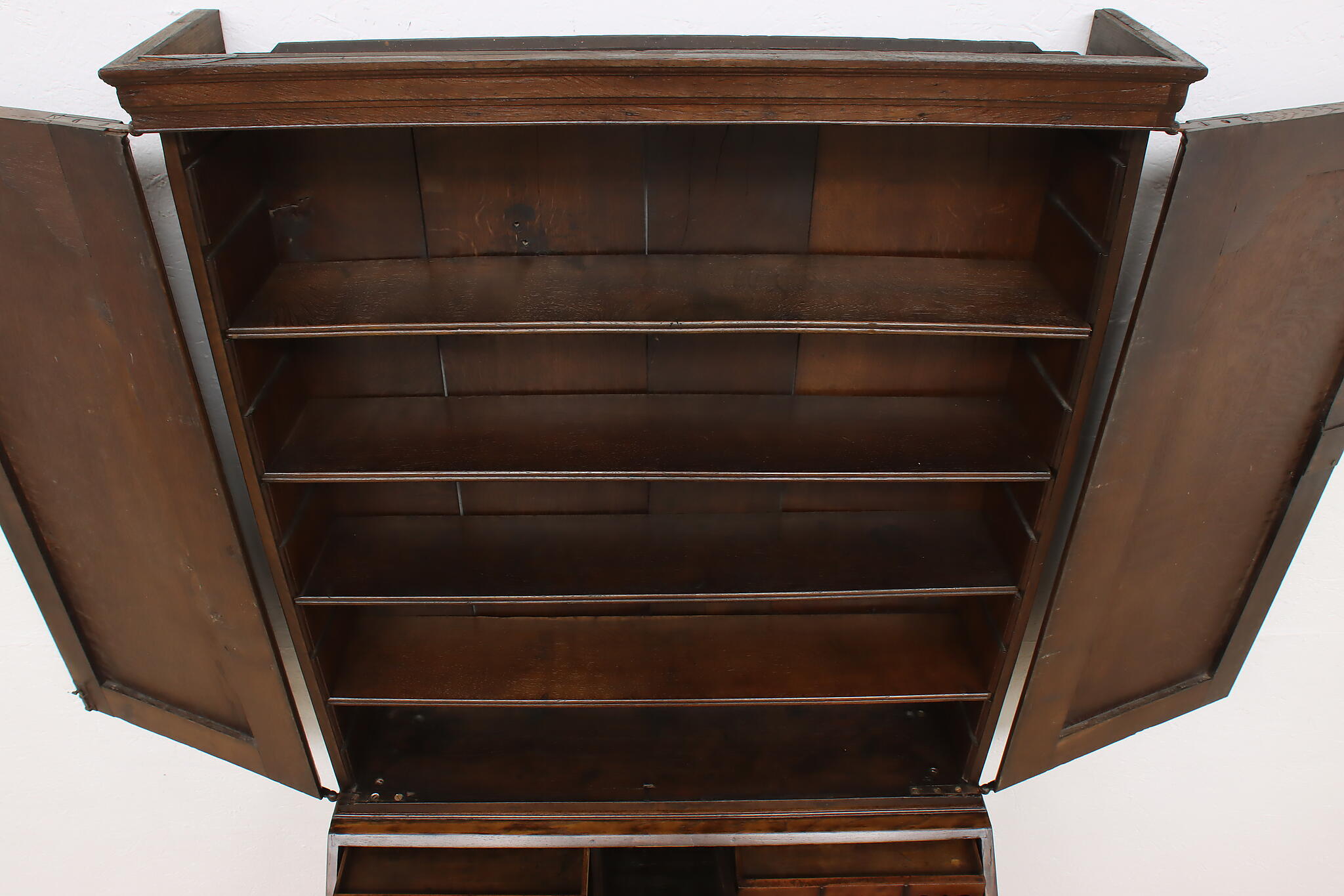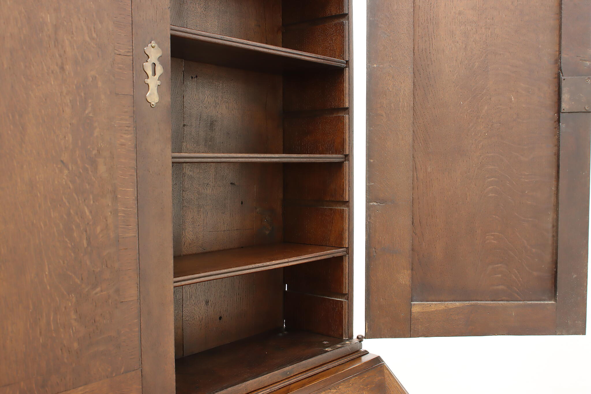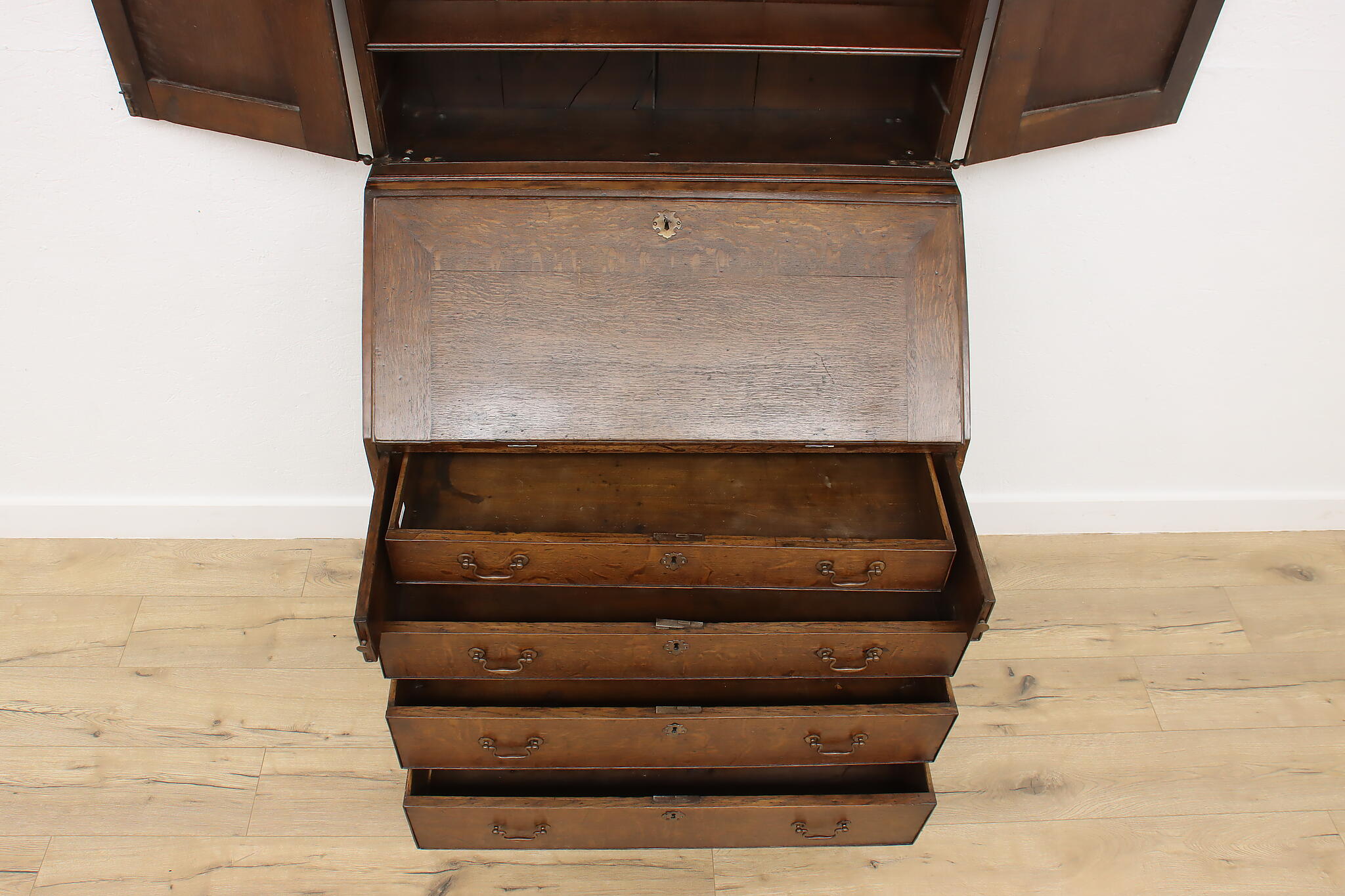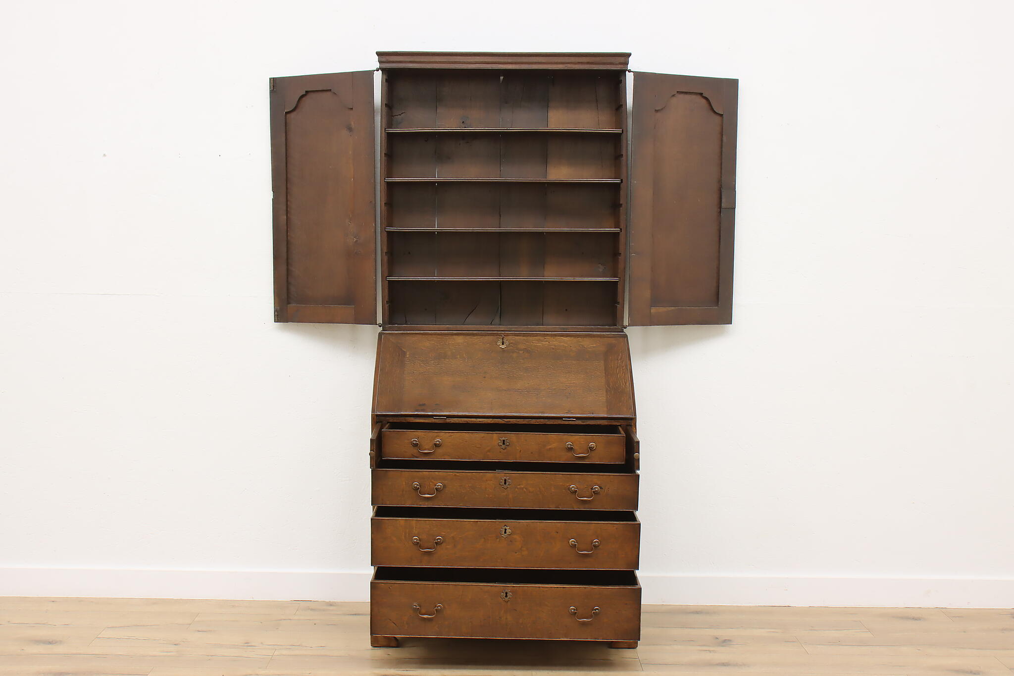 Surviving from the early 1800s, this secretary desk and bookcase was masterfully handcrafted during the English Georgian period.