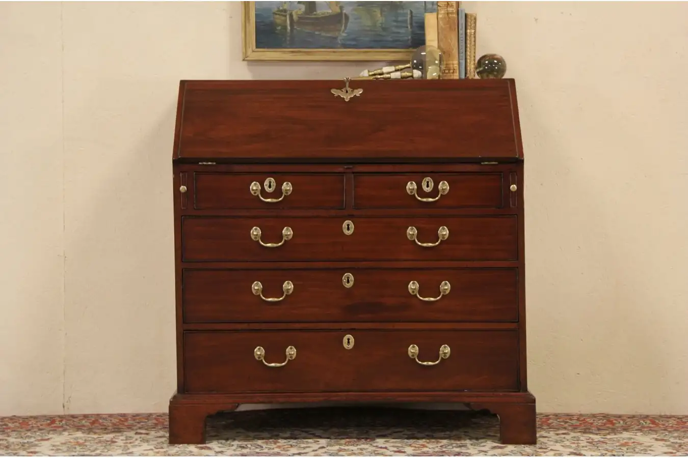 An authentic late Georgian secretary desk from around 1830 was hand crafted of mahogany in England. The finish is in excellent condition with warm patina.