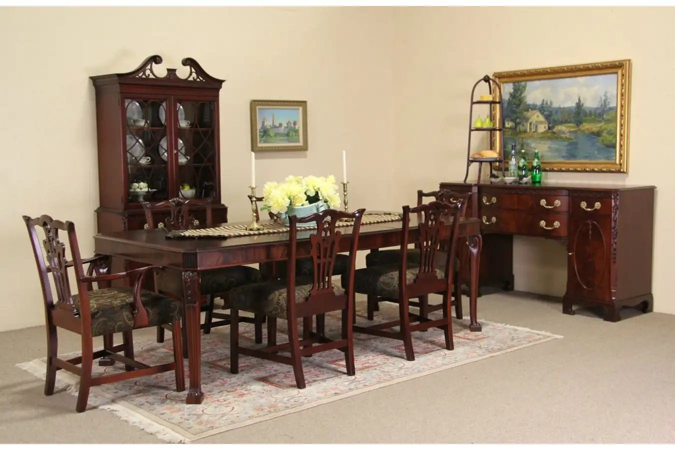 A traditional 9 piece dining set carved in the Georgian manner includes a table with two leaves, six chairs, china cabinet or bookcase and sideboard, server or buffet.