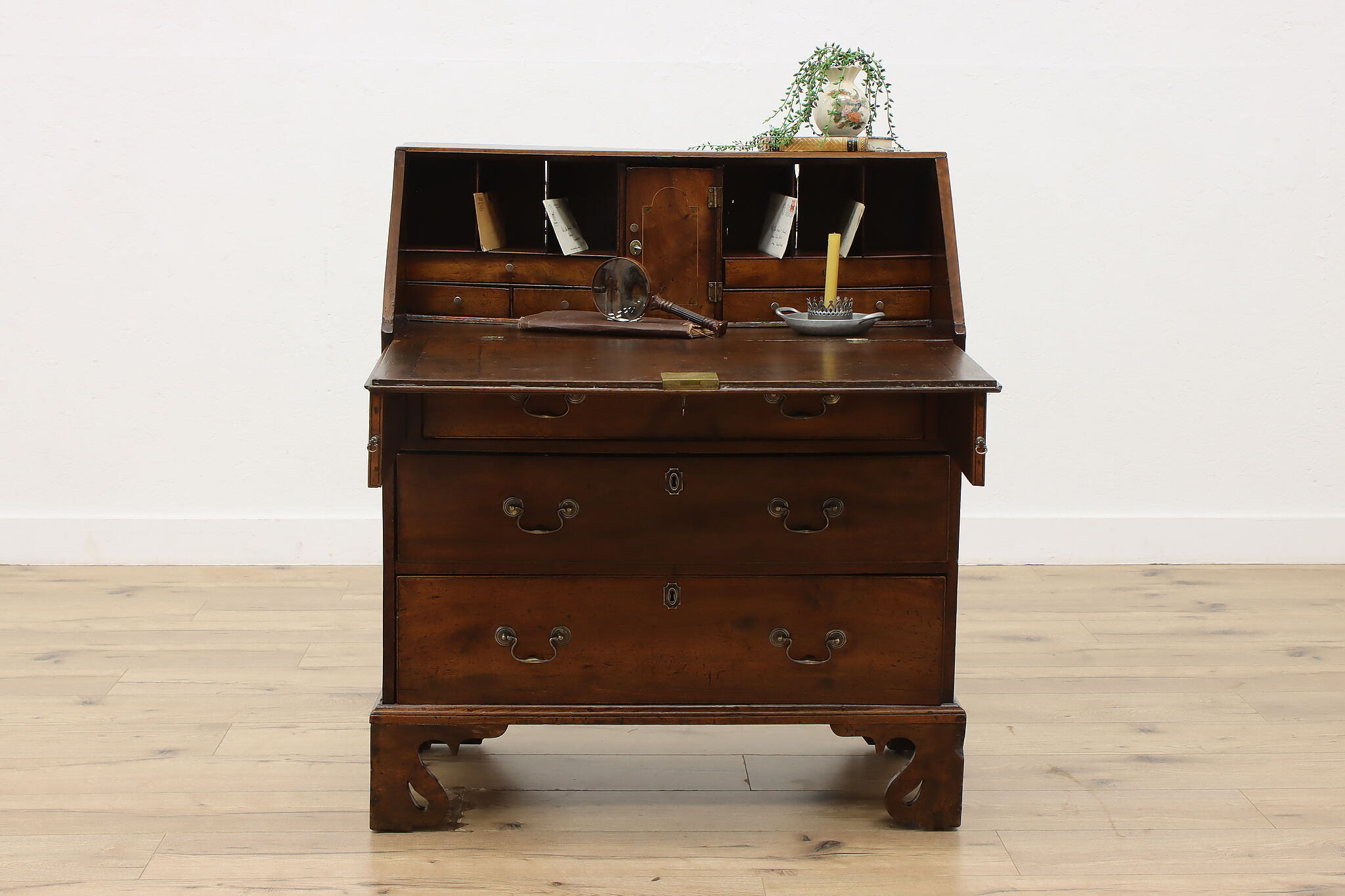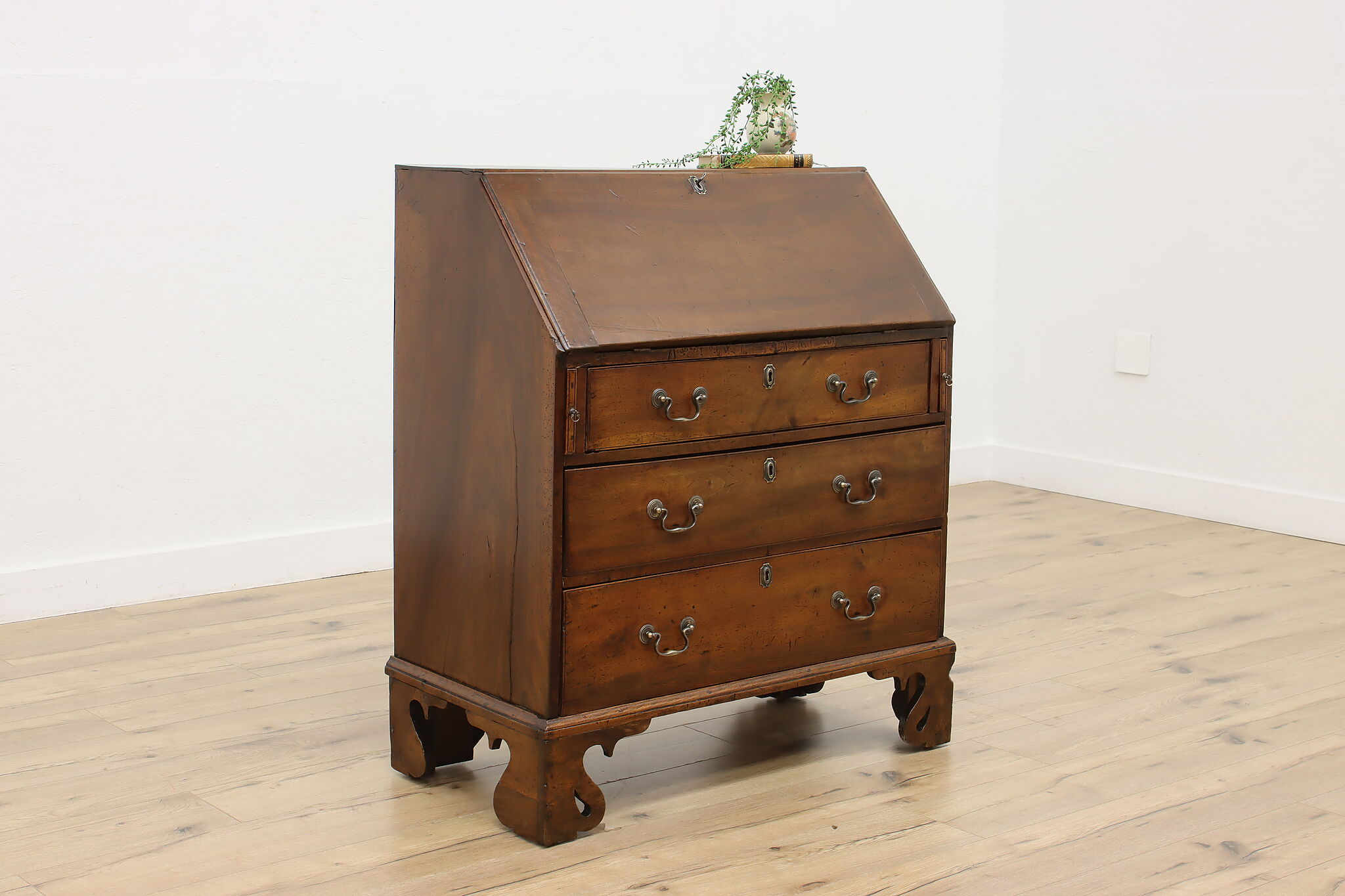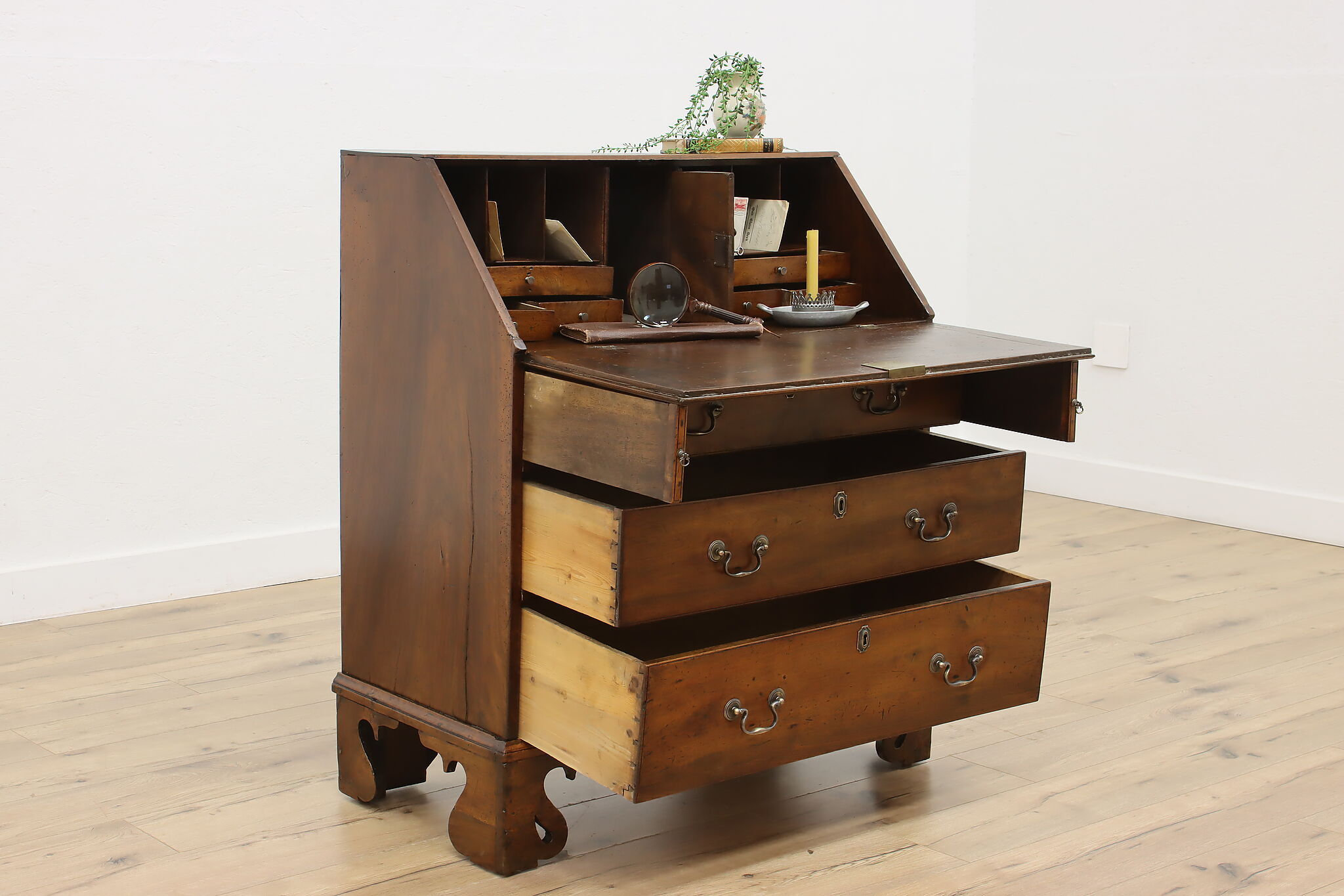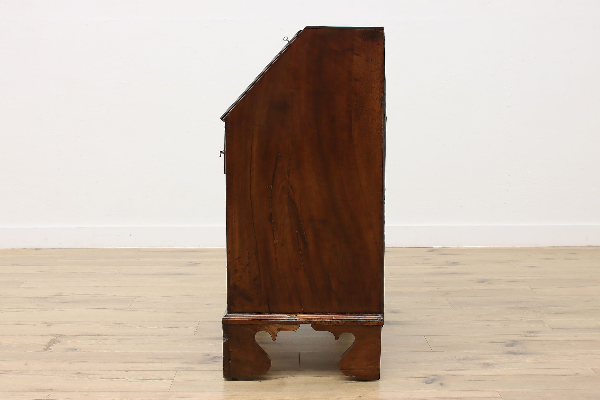 Georgian period homes were much smaller than modern ones and required furniture that was useful, yet compact in tight spaces. This slant front secretary desk would've been found in a merchant's home, keeping their documents and accounts safe from prying eyes.