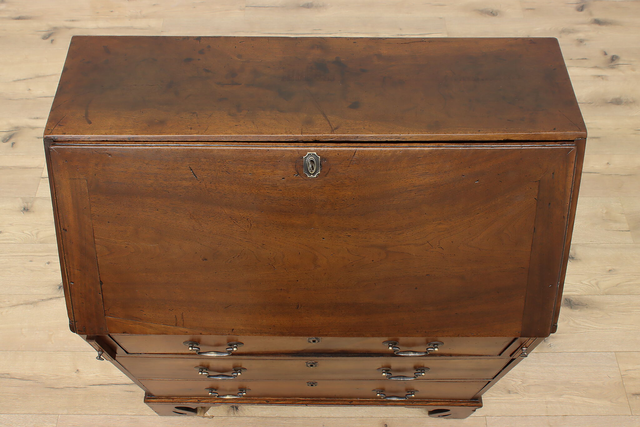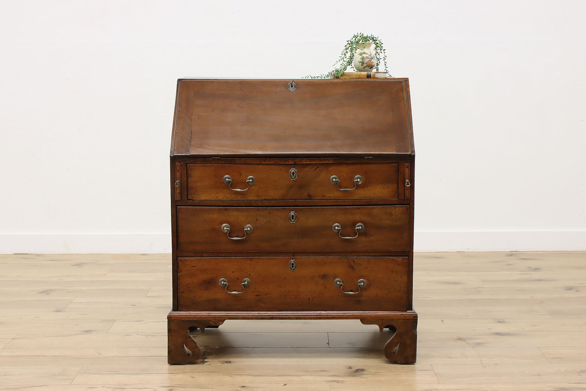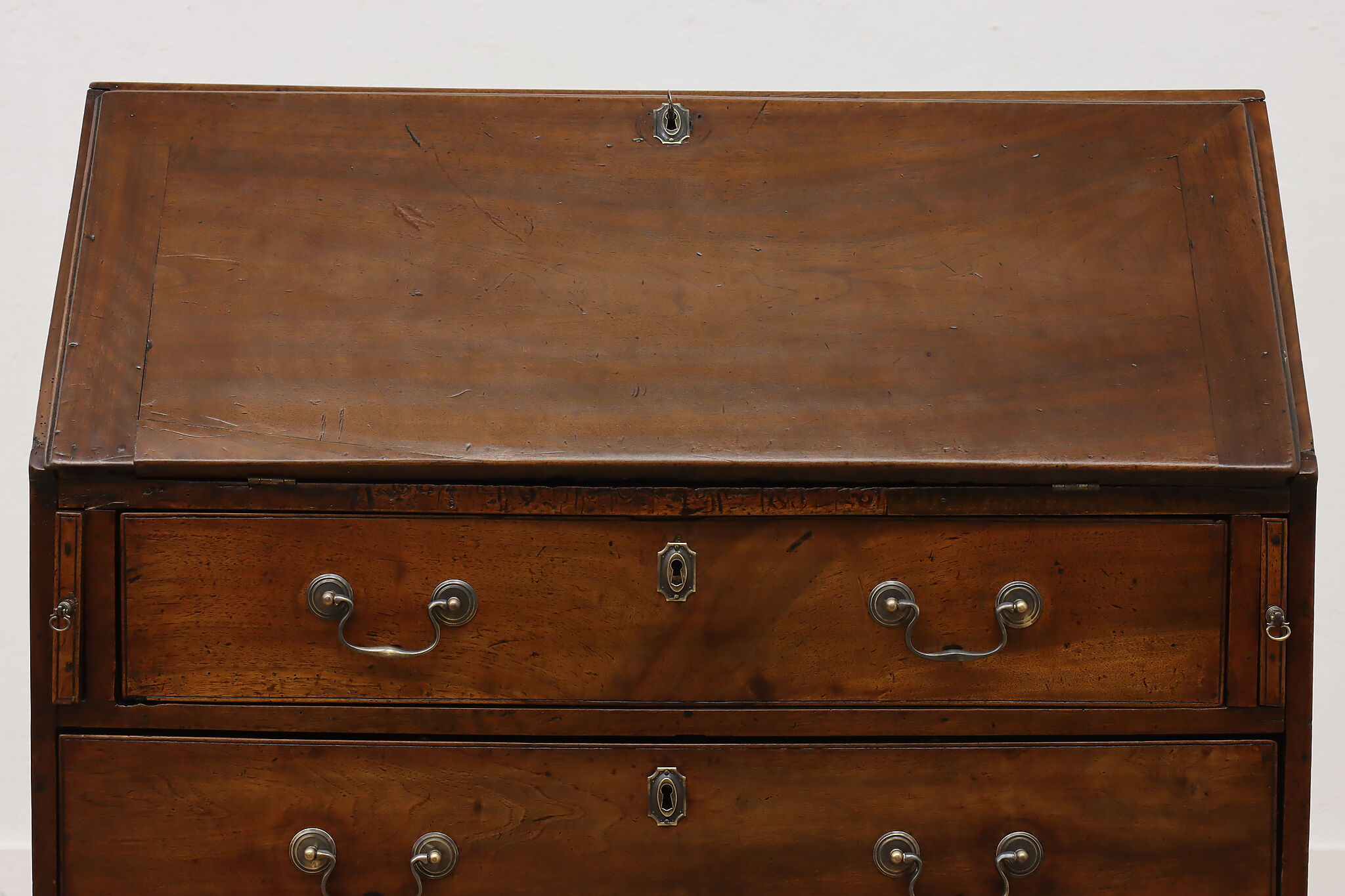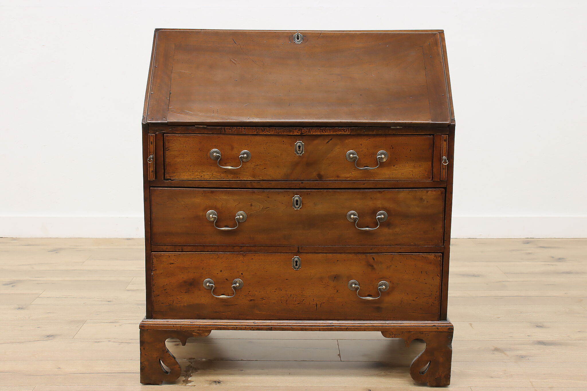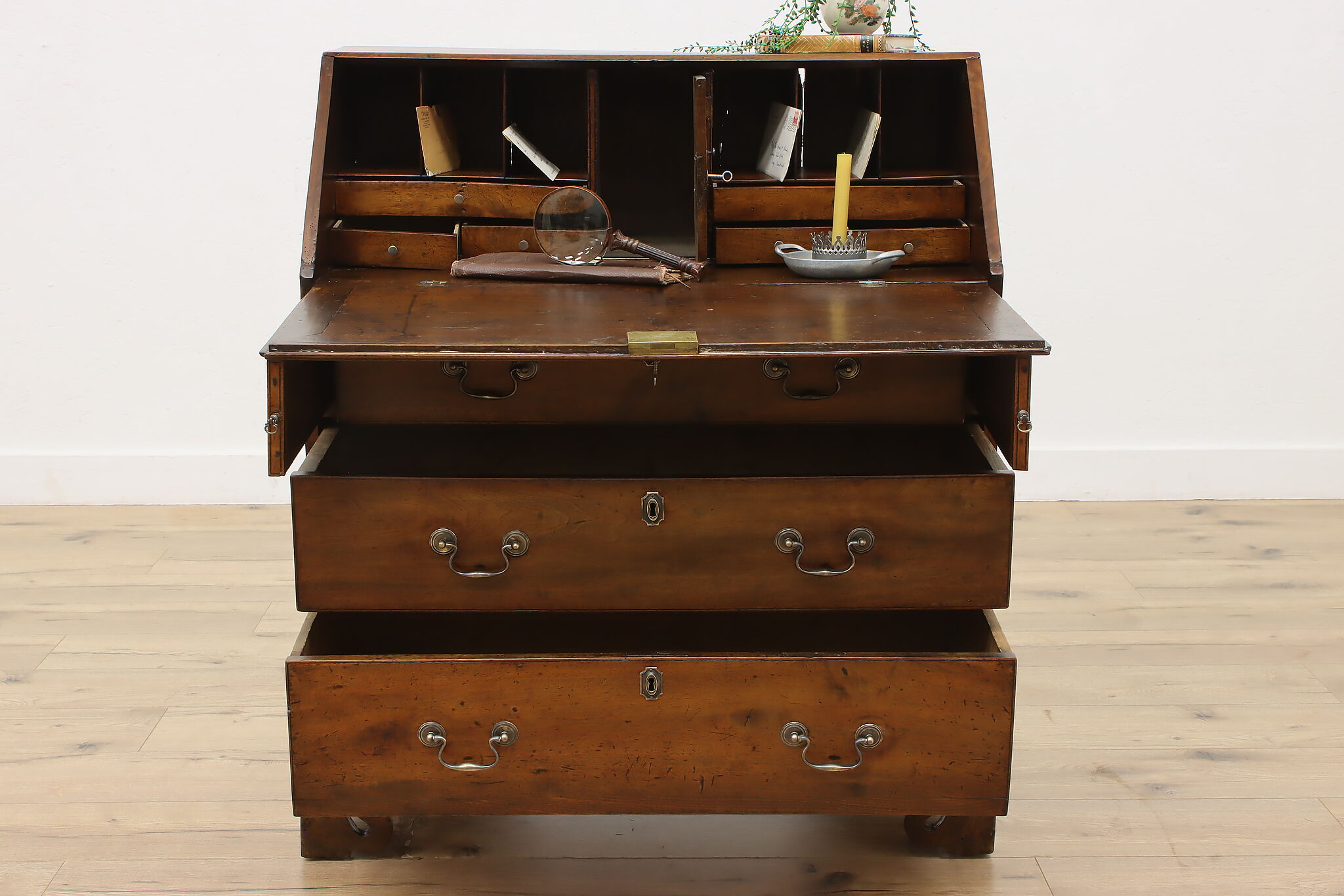 Georgian period homes were much smaller than modern ones and required furniture that was useful, yet compact in tight spaces. This slant front secretary desk would've been found in a merchant's home, keeping their documents and accounts safe from prying eyes.