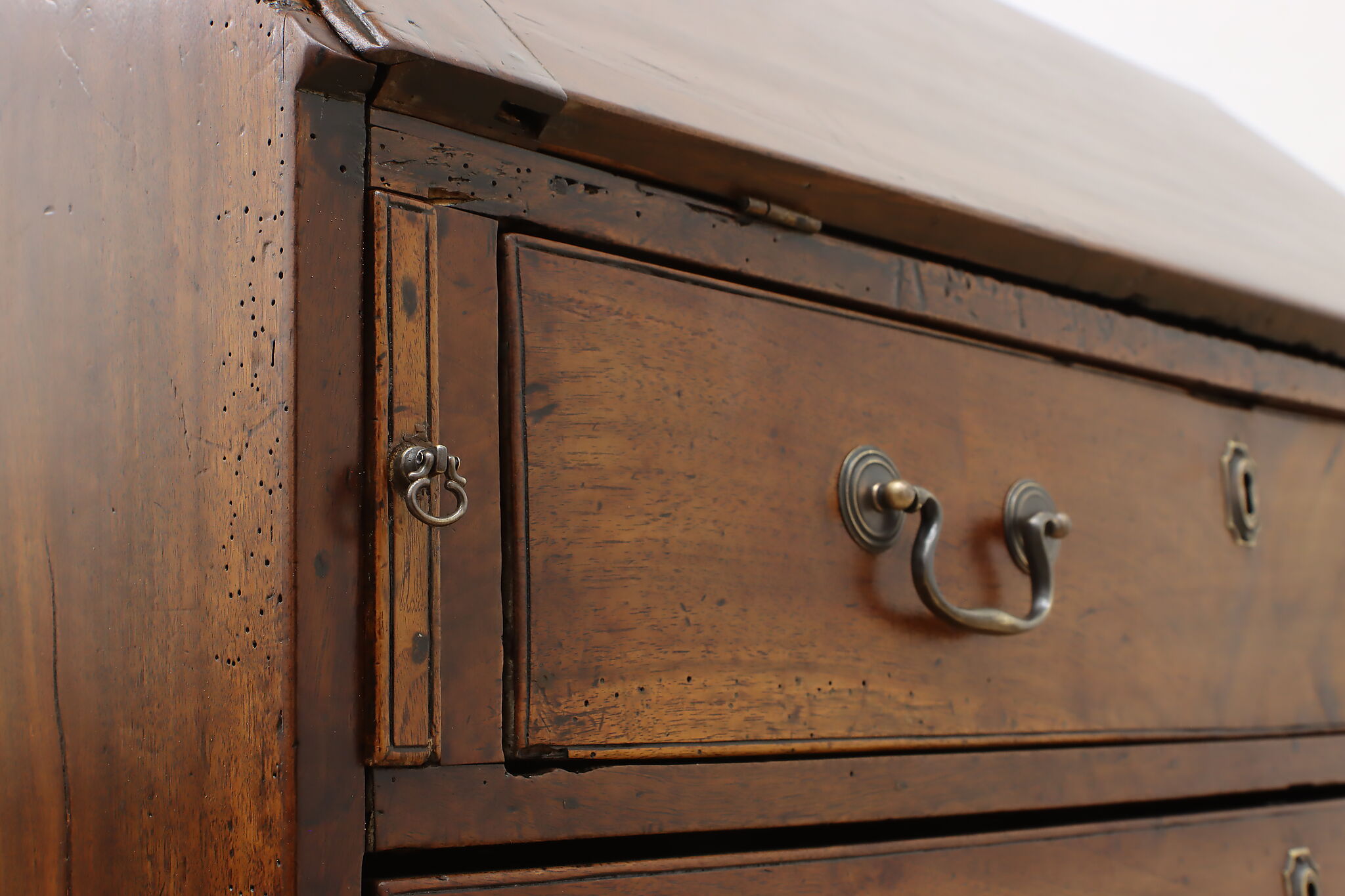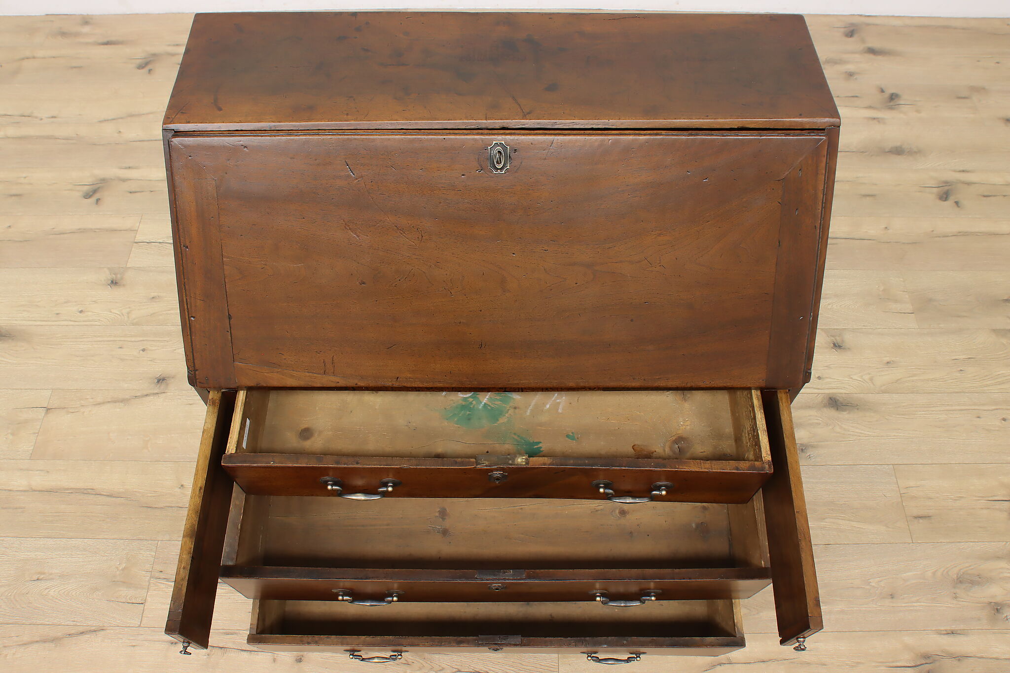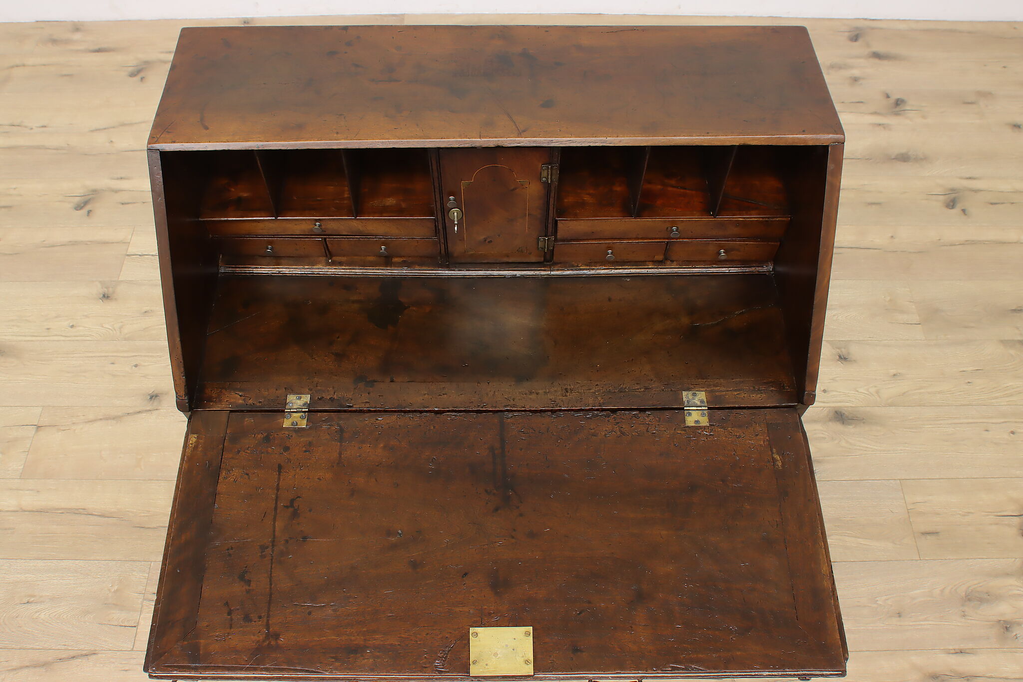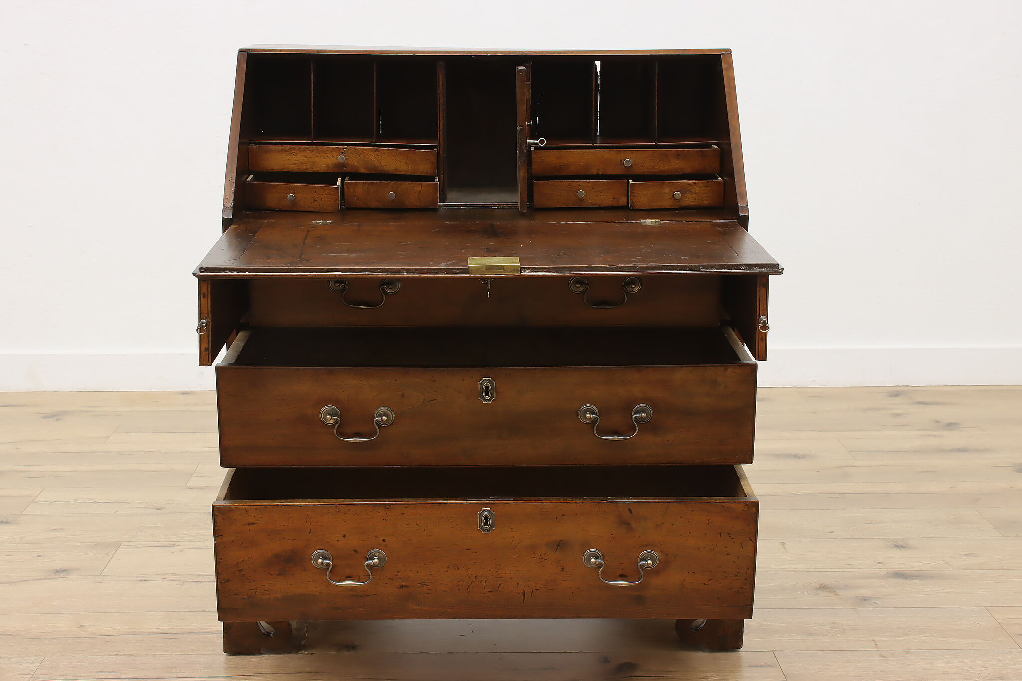 Georgian period homes were much smaller than modern ones and required furniture that was useful, yet compact in tight spaces. This slant front secretary desk would've been found in a merchant's home, keeping their documents and accounts safe from prying eyes.