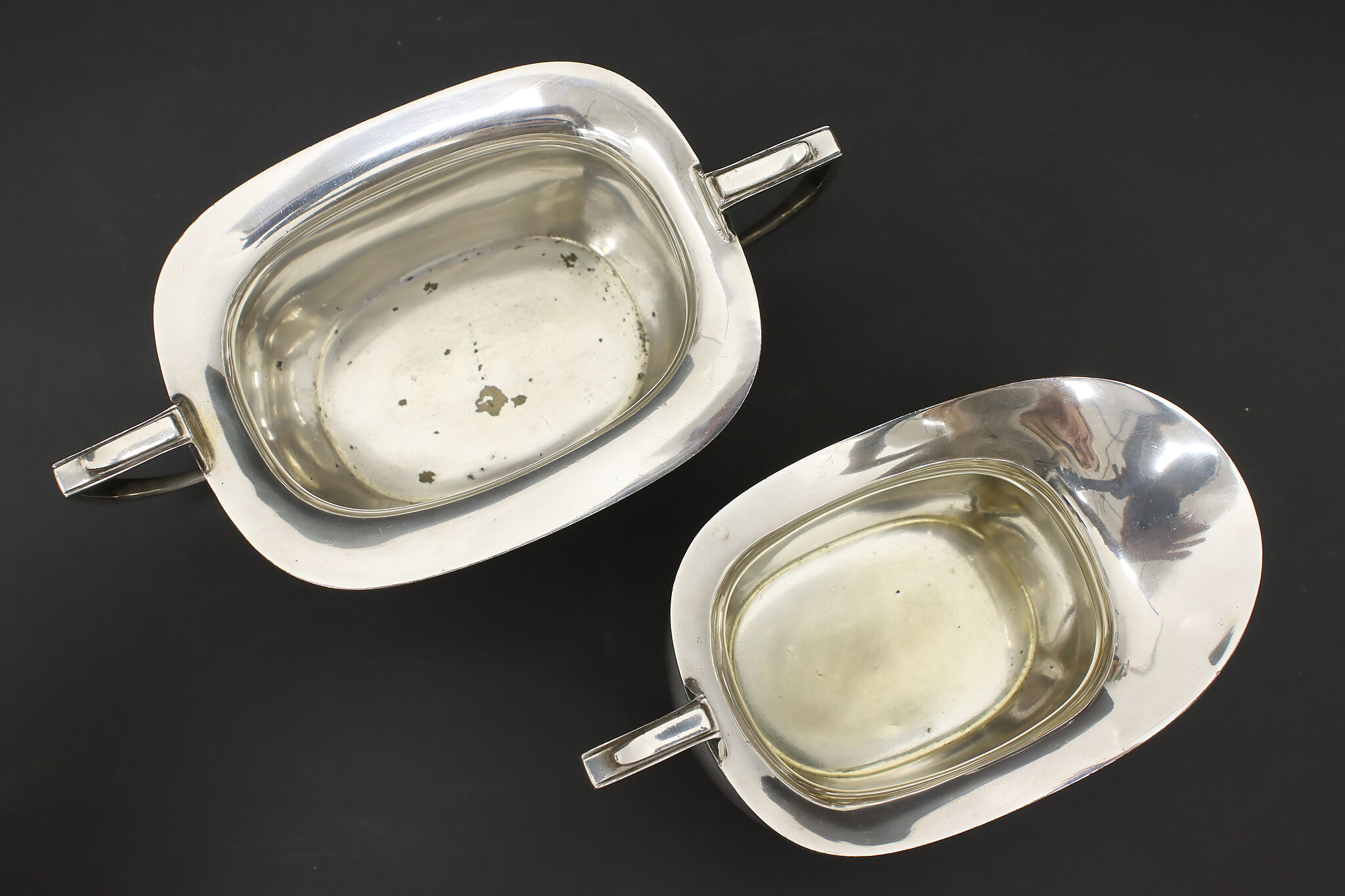Tea pot size is 7.5" wide, 5" deep and 9" tall. Coffee pot size is 11.5" wide, 6" deep and 6.5" tall. Creamer size is 6" wide, 3.5" deep and 4" tall. Sugar size is 7" wide, 4" deep and 4" tall.