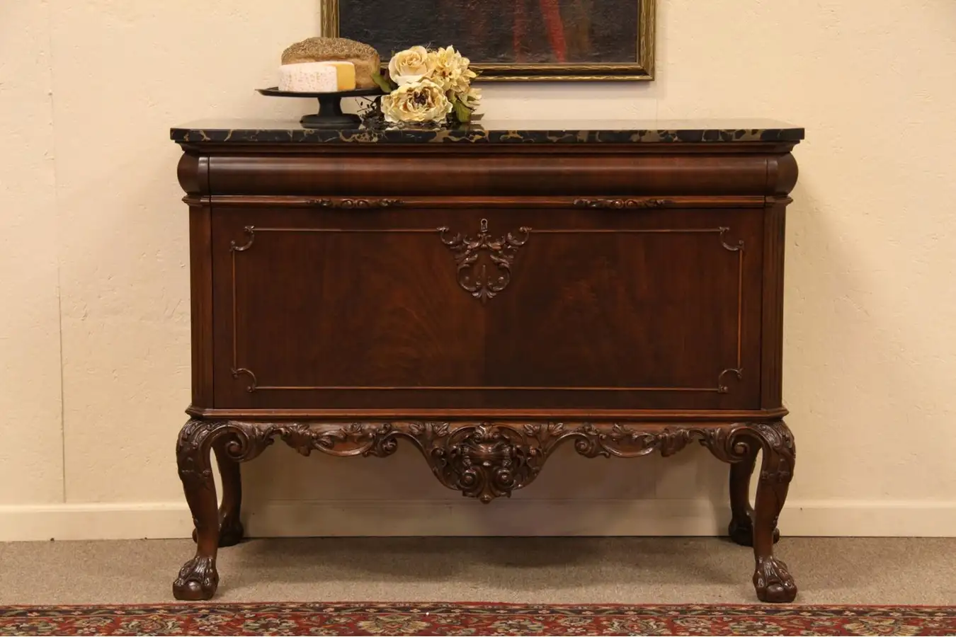Richly carved of walnut in the classic Georgian Chippendale style about 1915, a small sideboard or huntboard has a famous black Italian "Porturo" marble top, matched burl panels and artistic detailing.